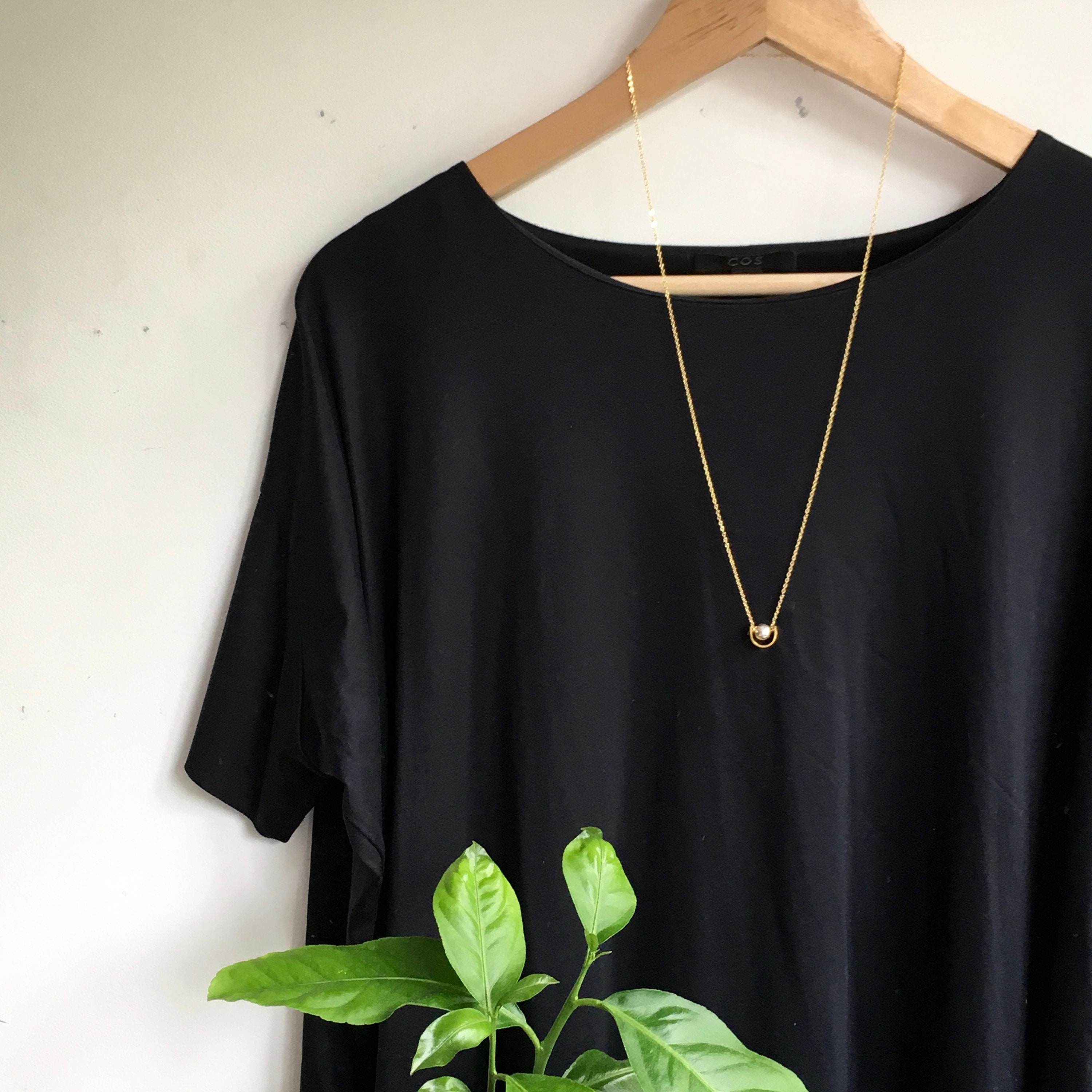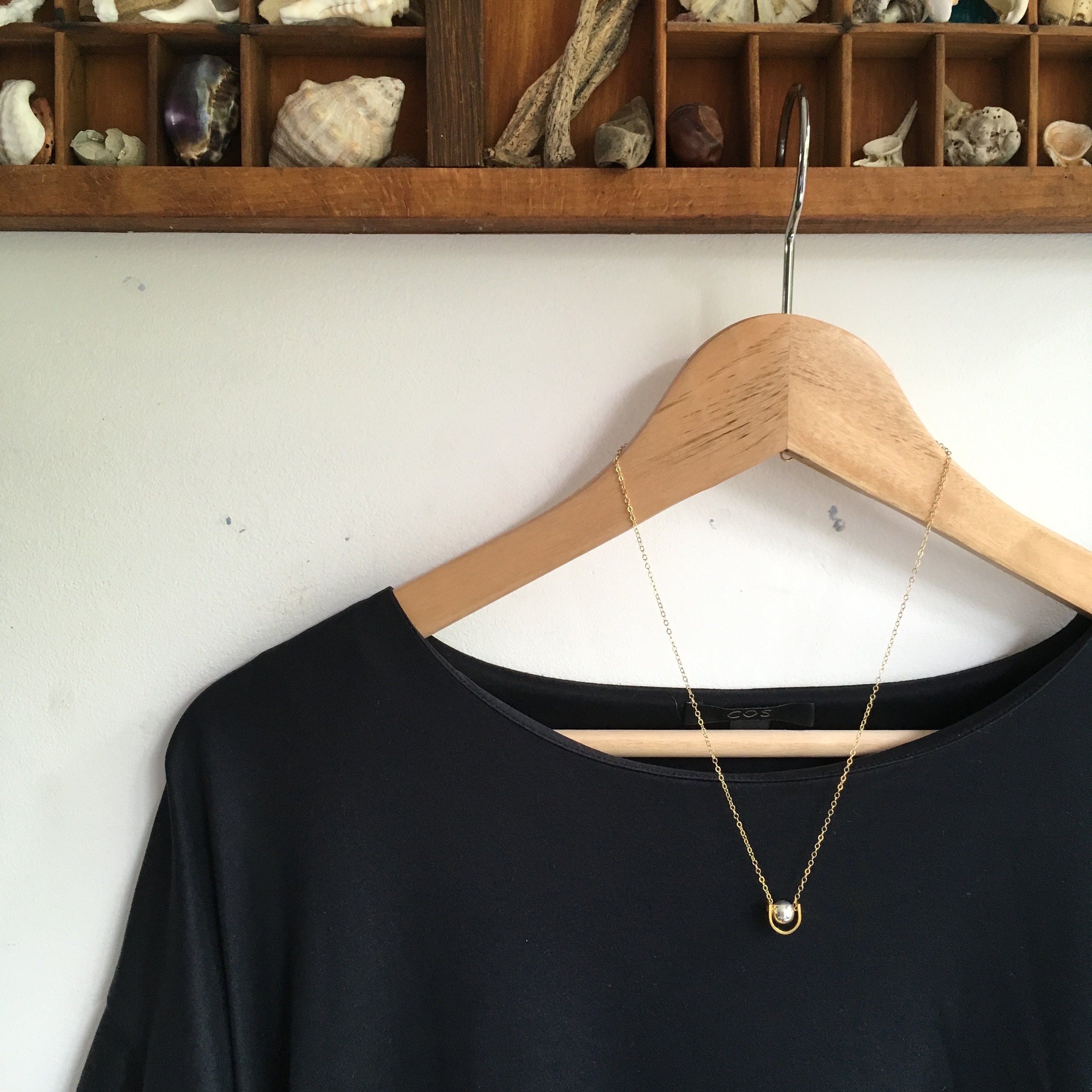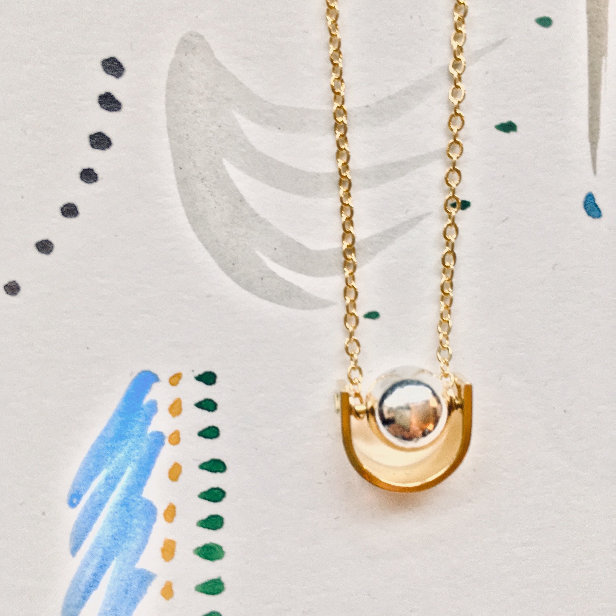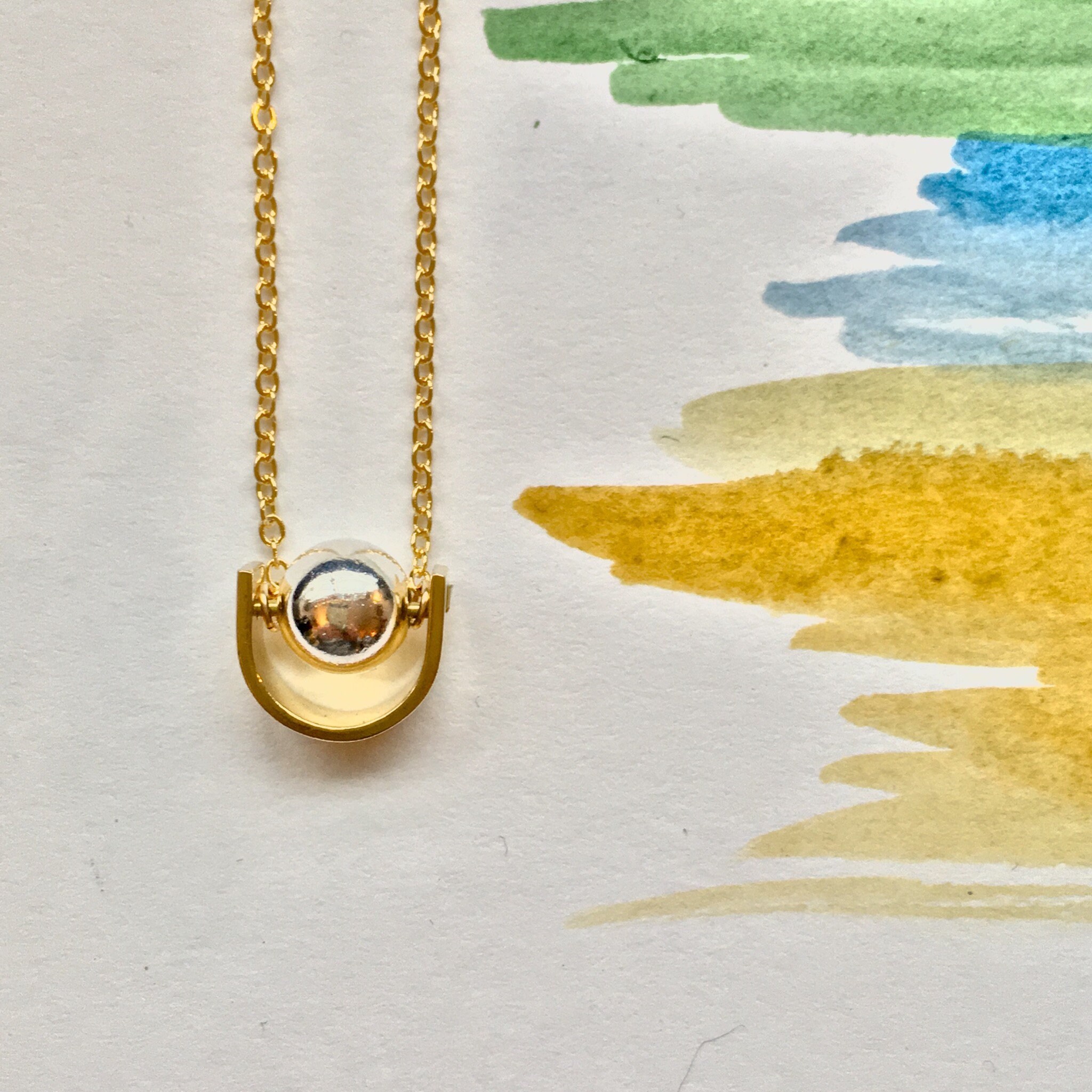 Stress relief necklace with a sterling silver ball, raw brass semi-circle charm and gold-filled chain.