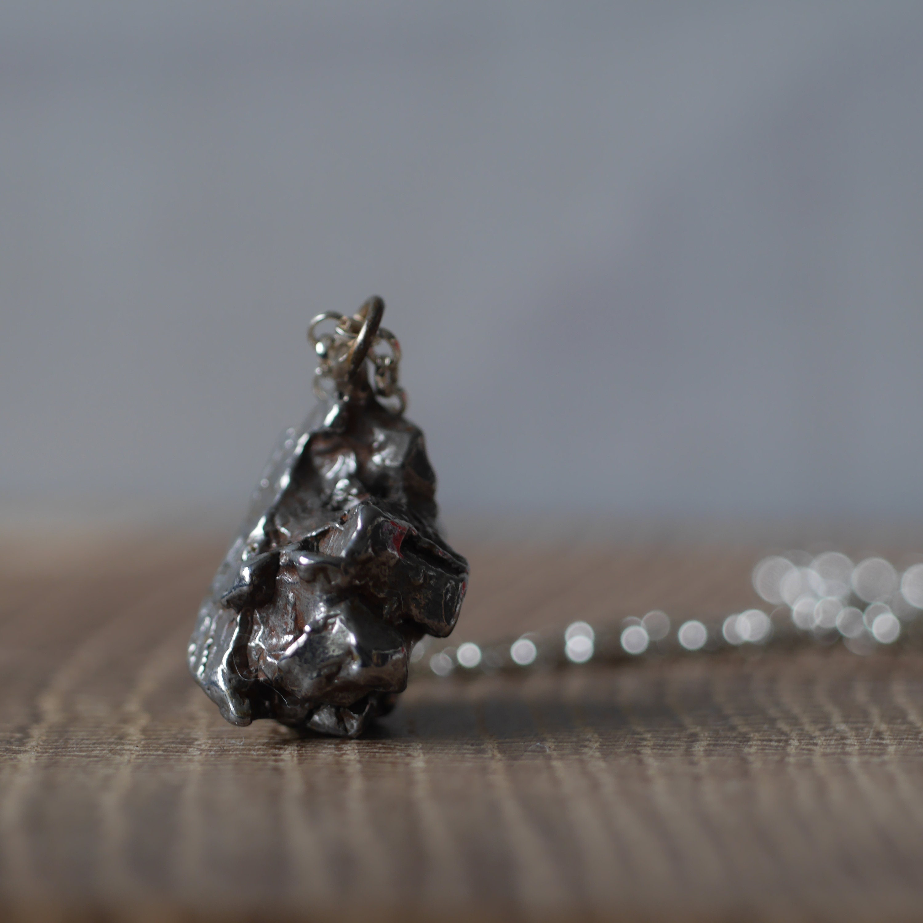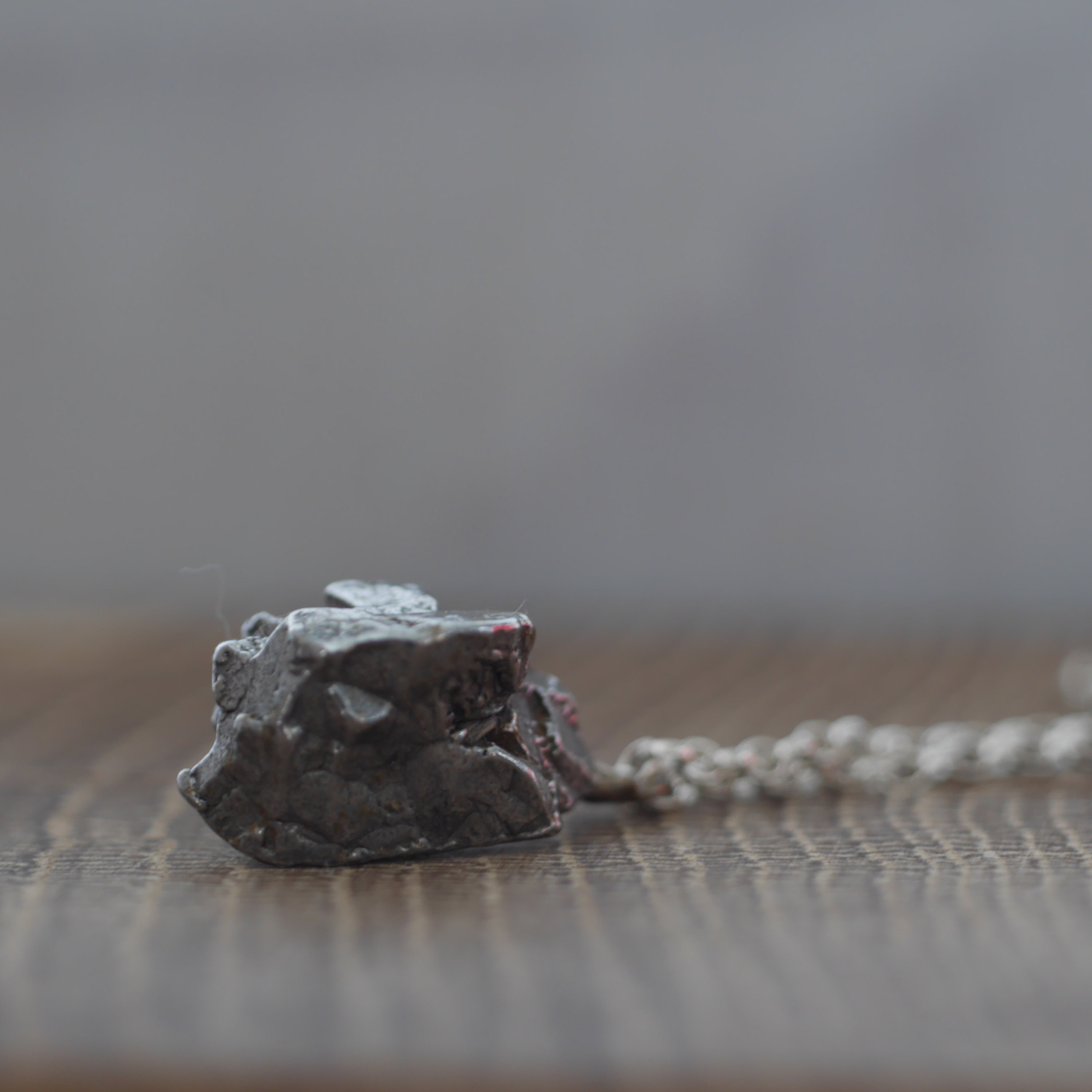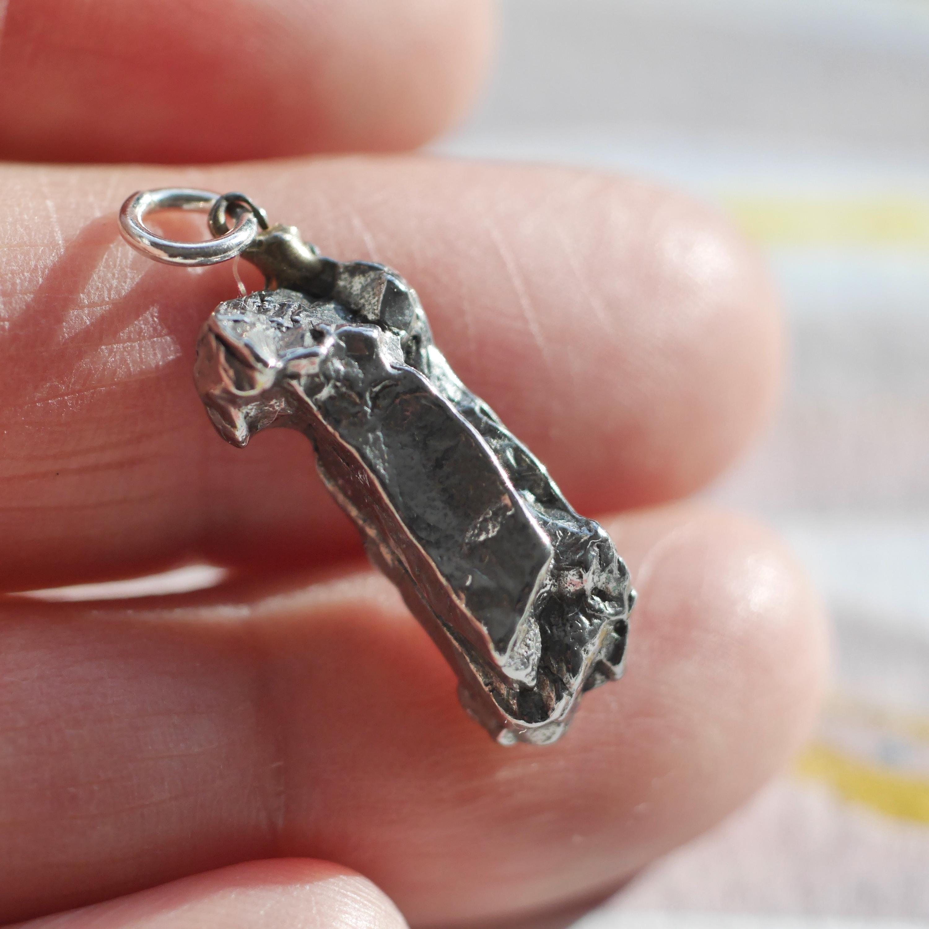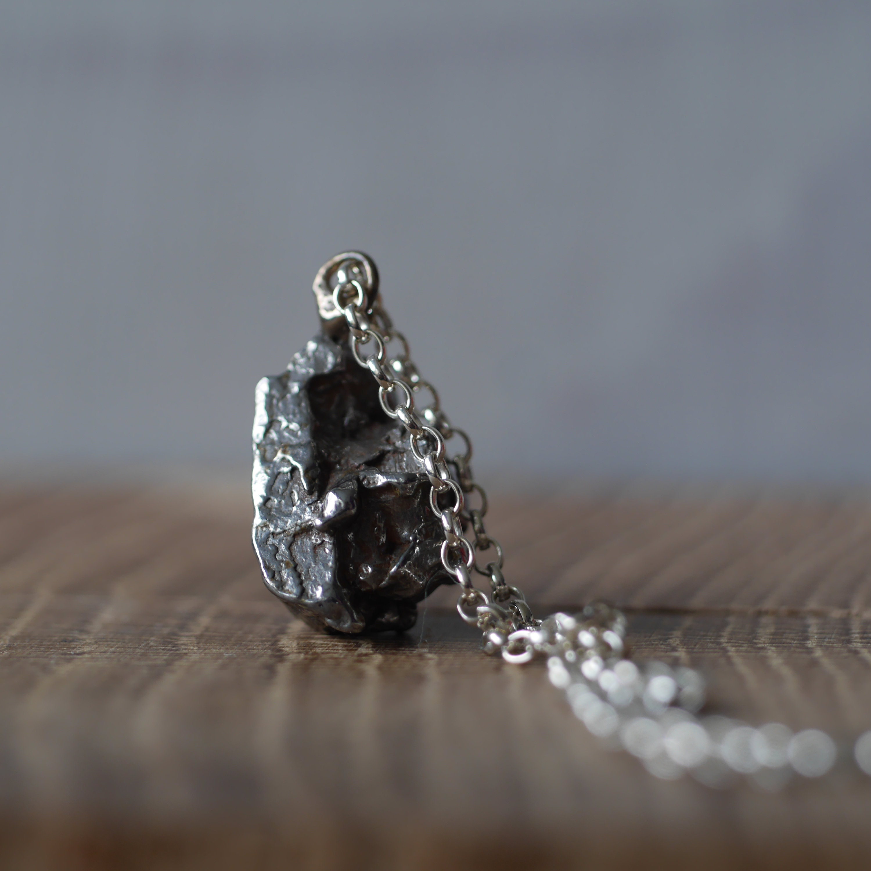This amazing meteorite necklace was handcrafted from a piece of meteorite found in Argentina and is estimated to be 4000-5000 years old if not longer. The Campo del Cielo site contains at least 26 craters containing iron masses from outer space!