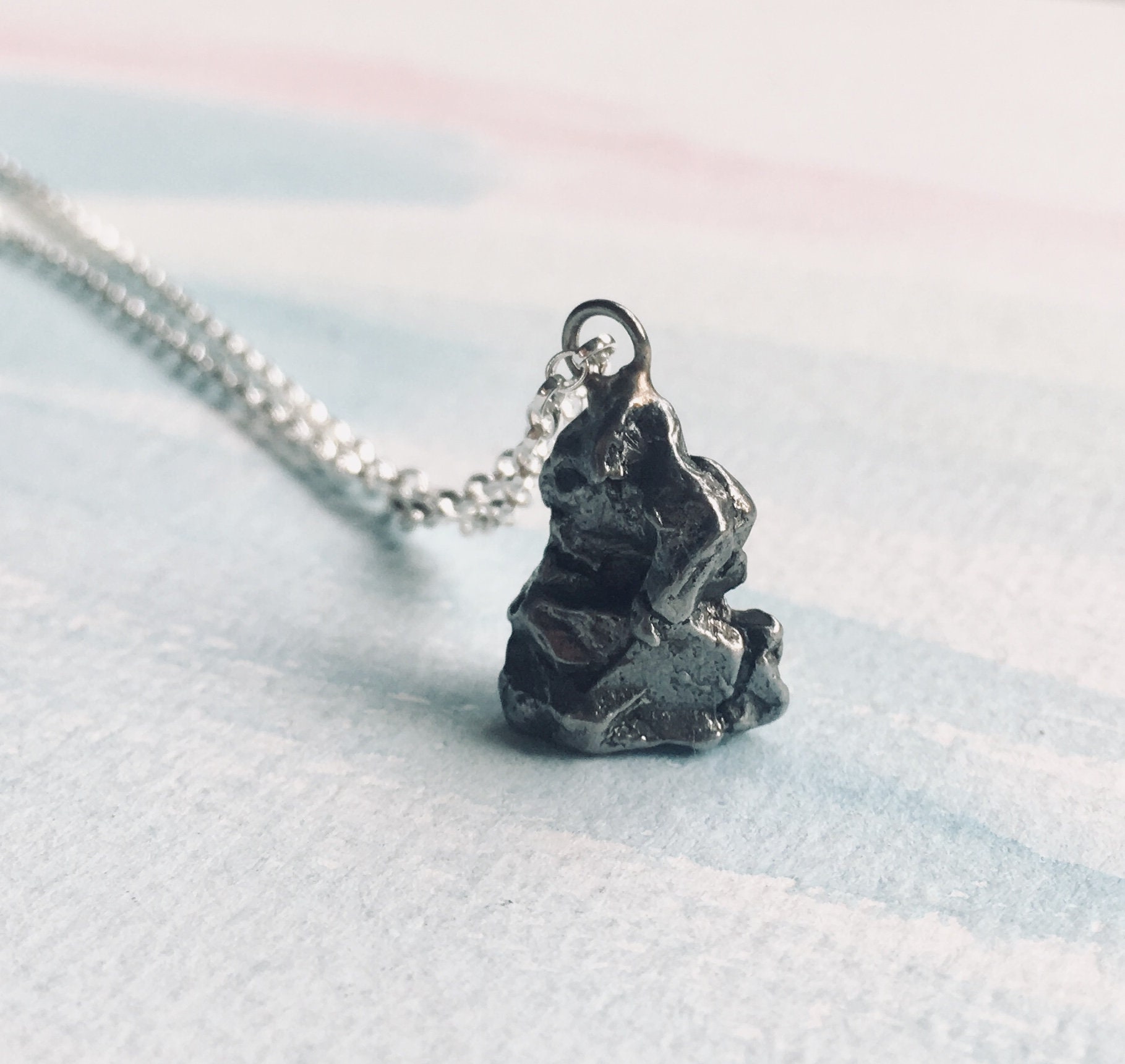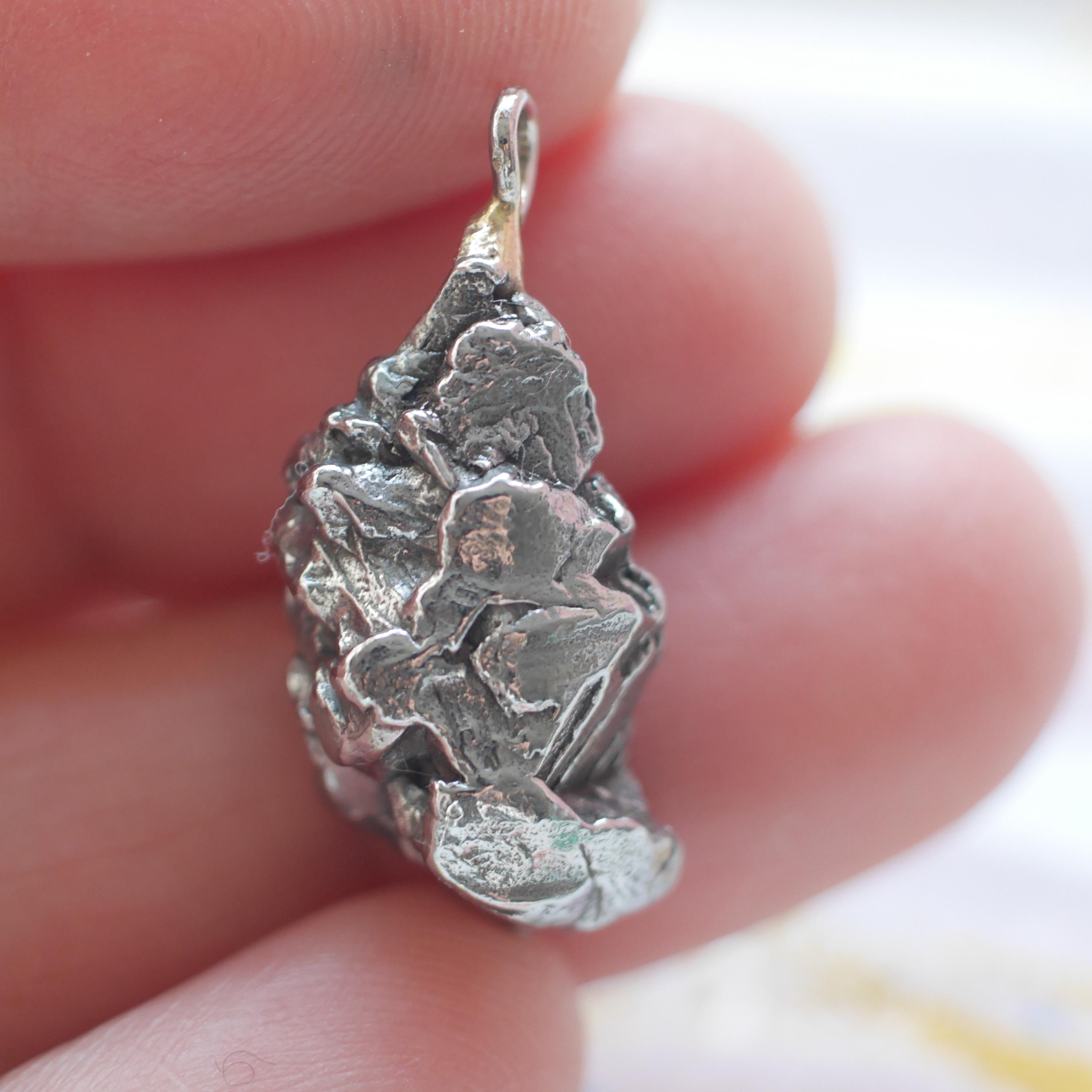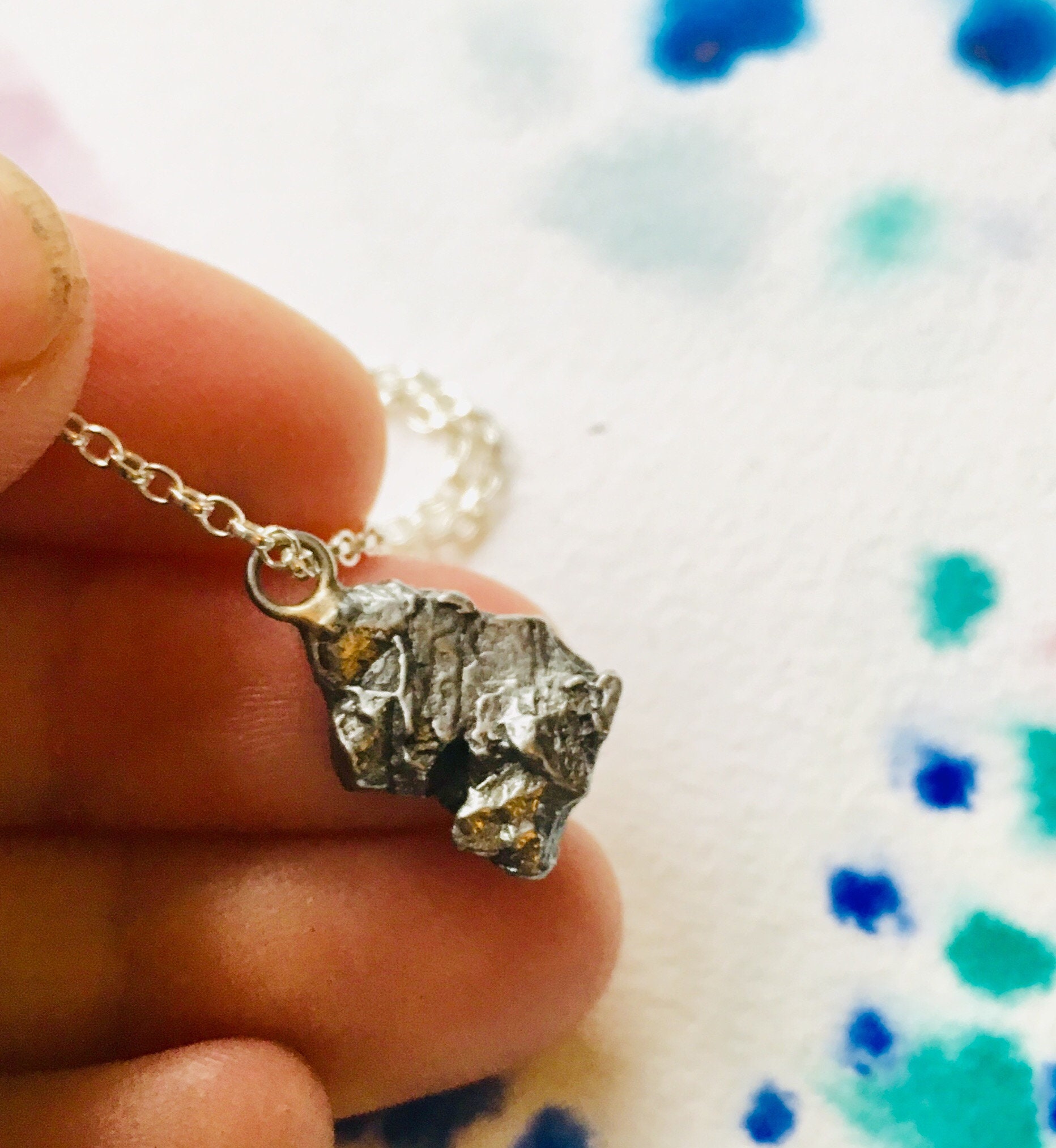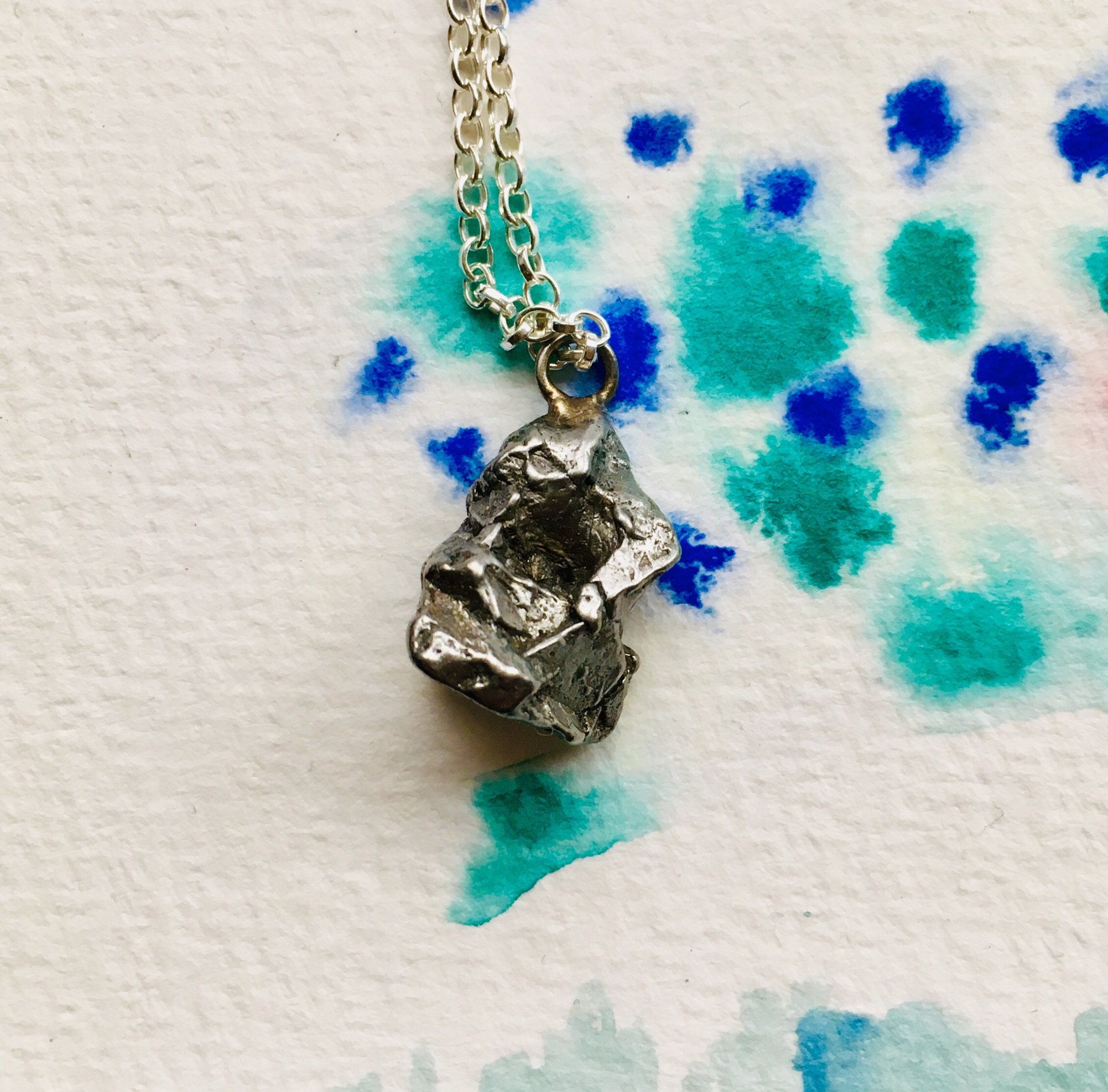 This amazing meteorite necklace was handcrafted from a piece of meteorite found in Argentina and is estimated to be 4000-5000 years old if not longer. The Campo del Cielo site contains at least 26 craters containing iron masses from outer space!