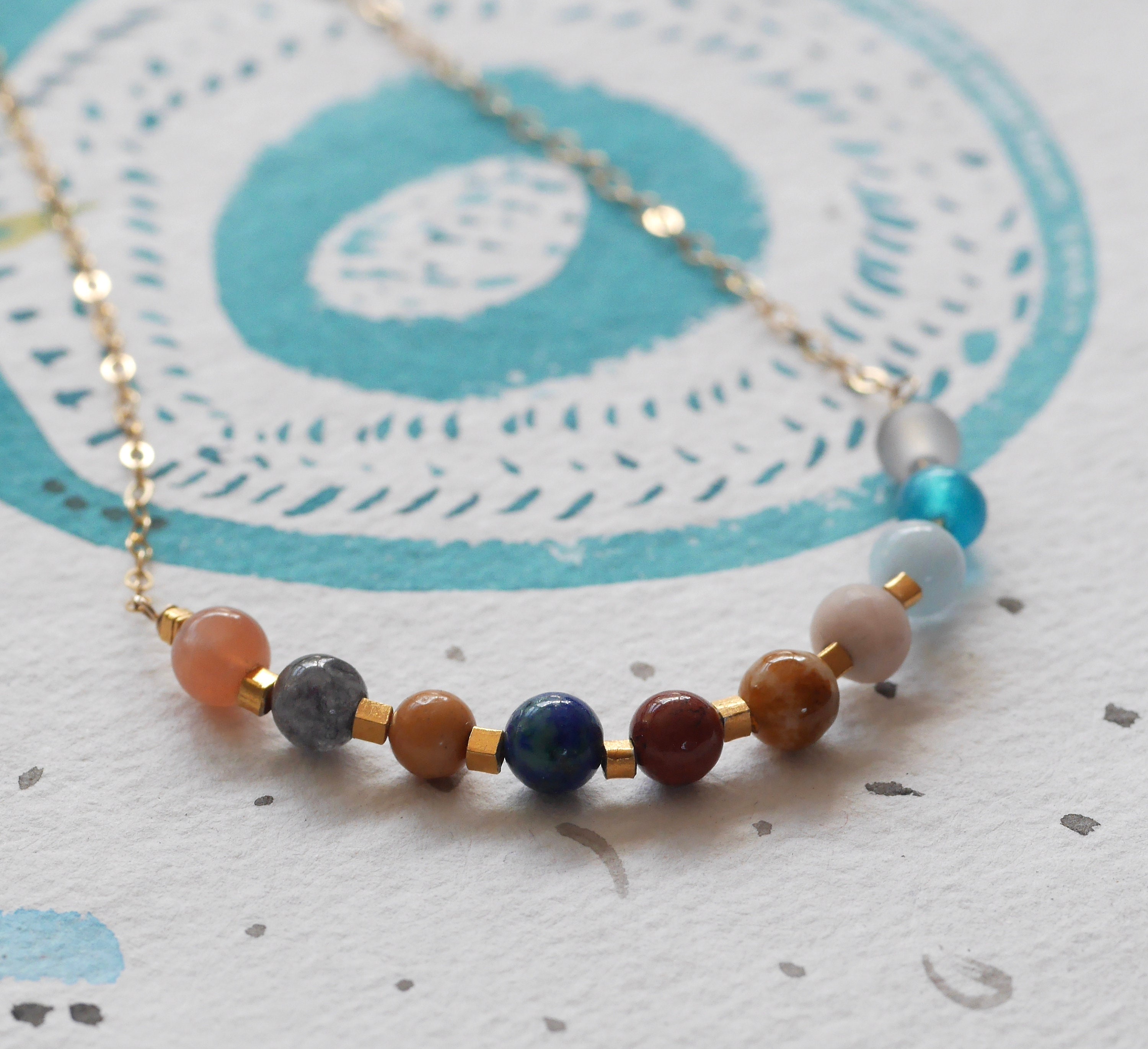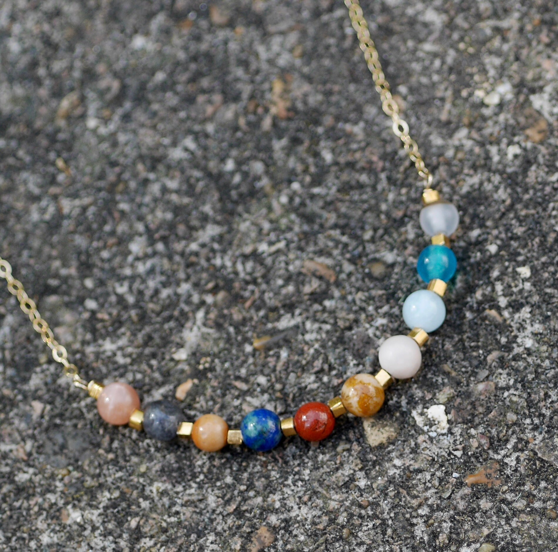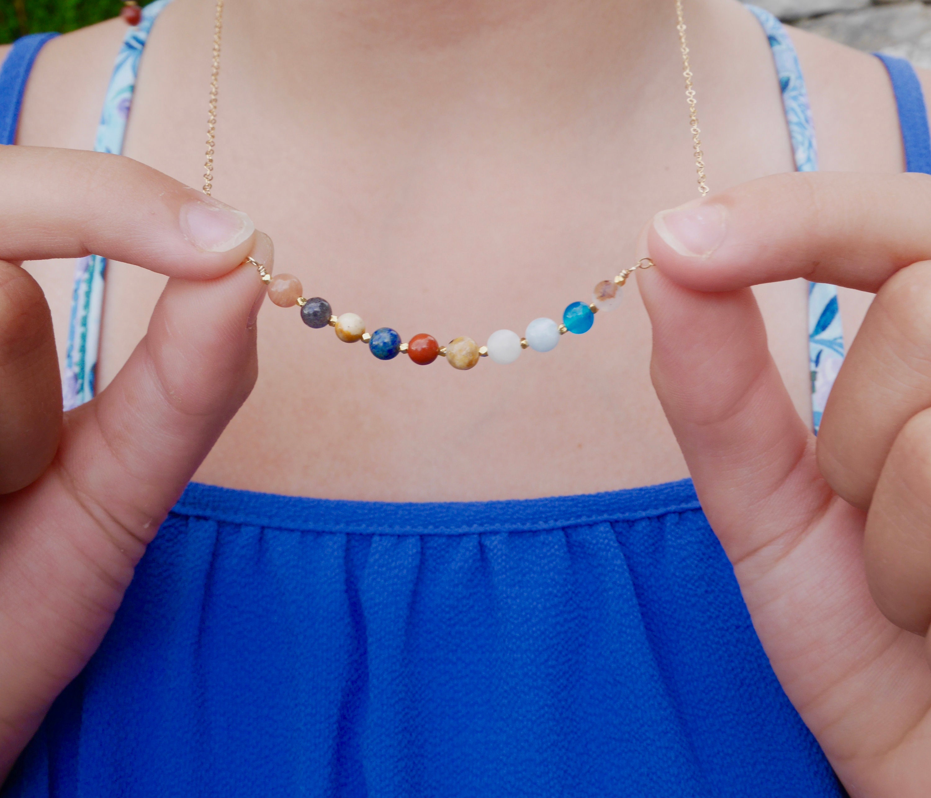 The planets are represented by a variety of gemstones carefully chosen after watching an astronomy documentary. This celestial necklace is the ideal gift for science geeks, night sky watchers or anyone who is a fan of astronomy.