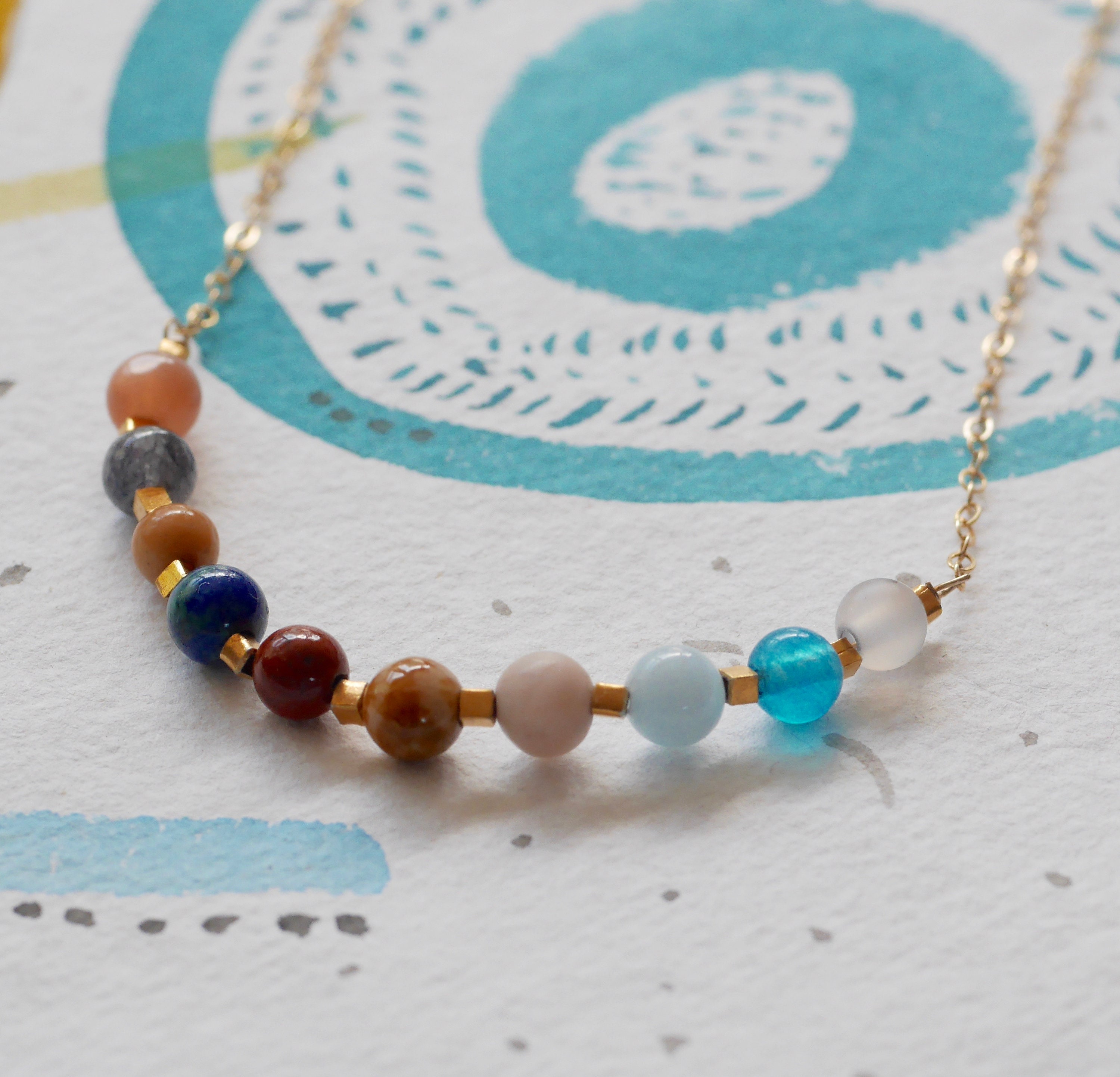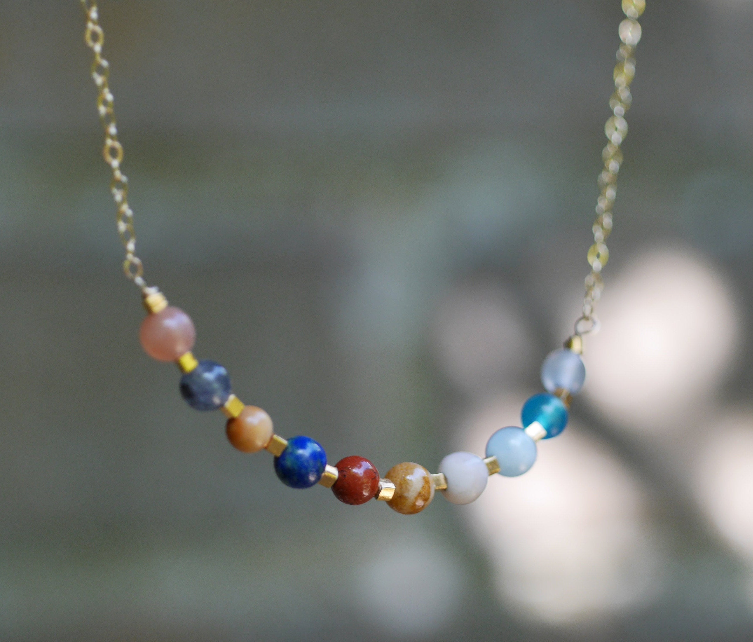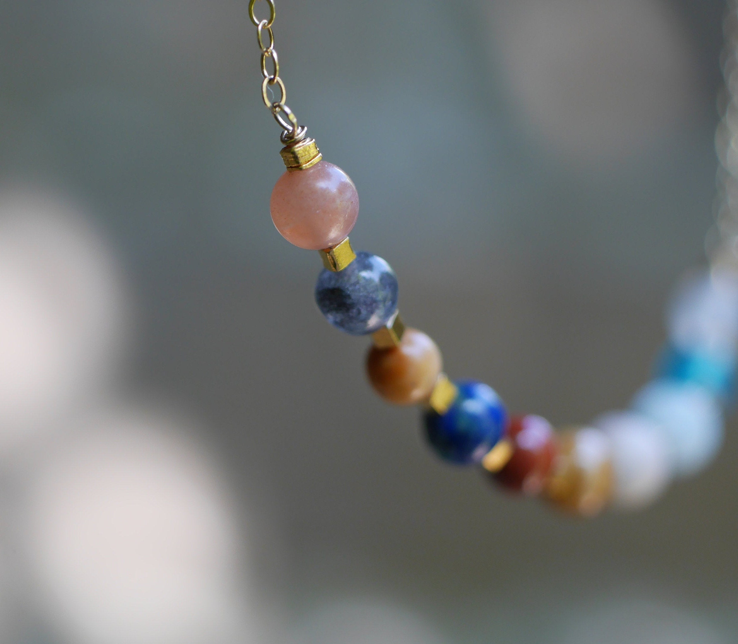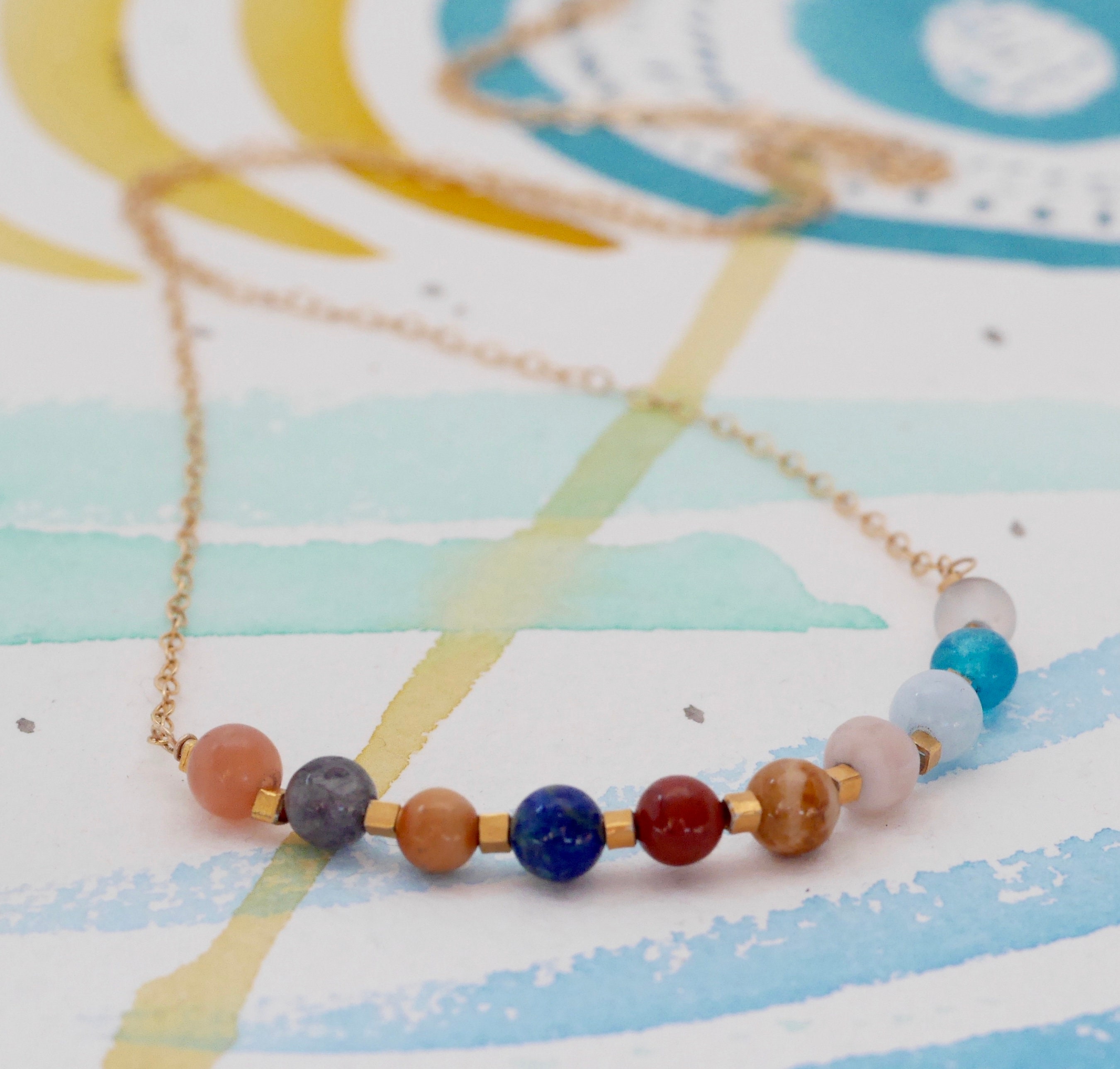 The planets are represented by a variety of gemstones carefully chosen after watching an astronomy documentary. This celestial necklace is the ideal gift for science geeks, night sky watchers or anyone who is a fan of astronomy.