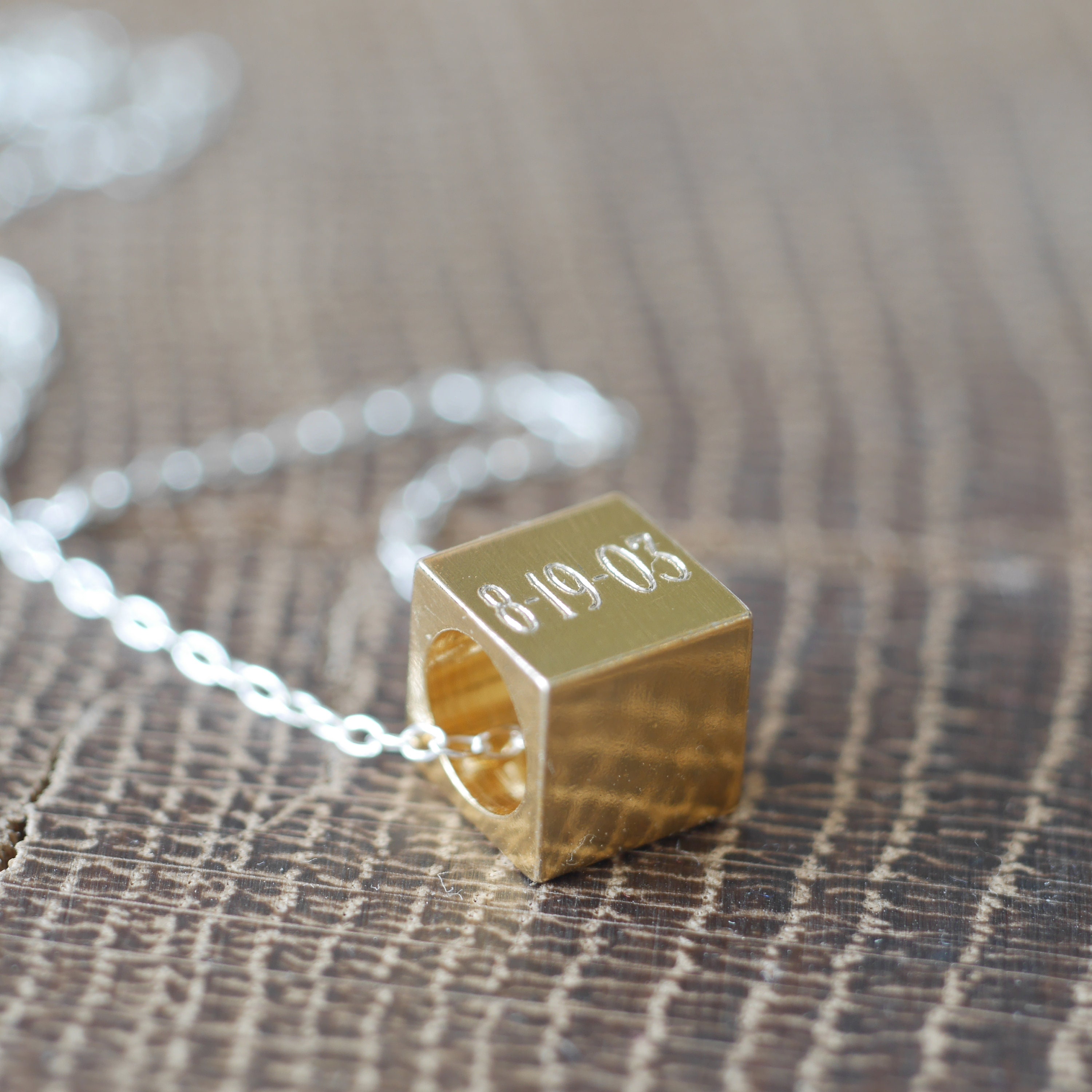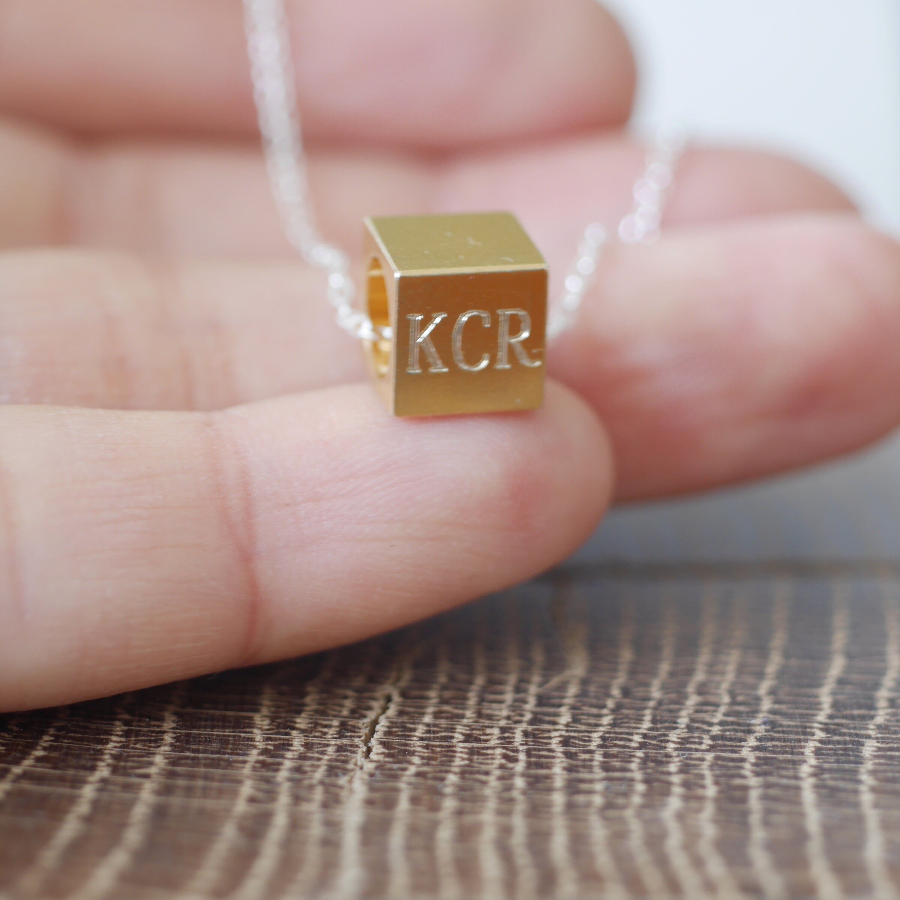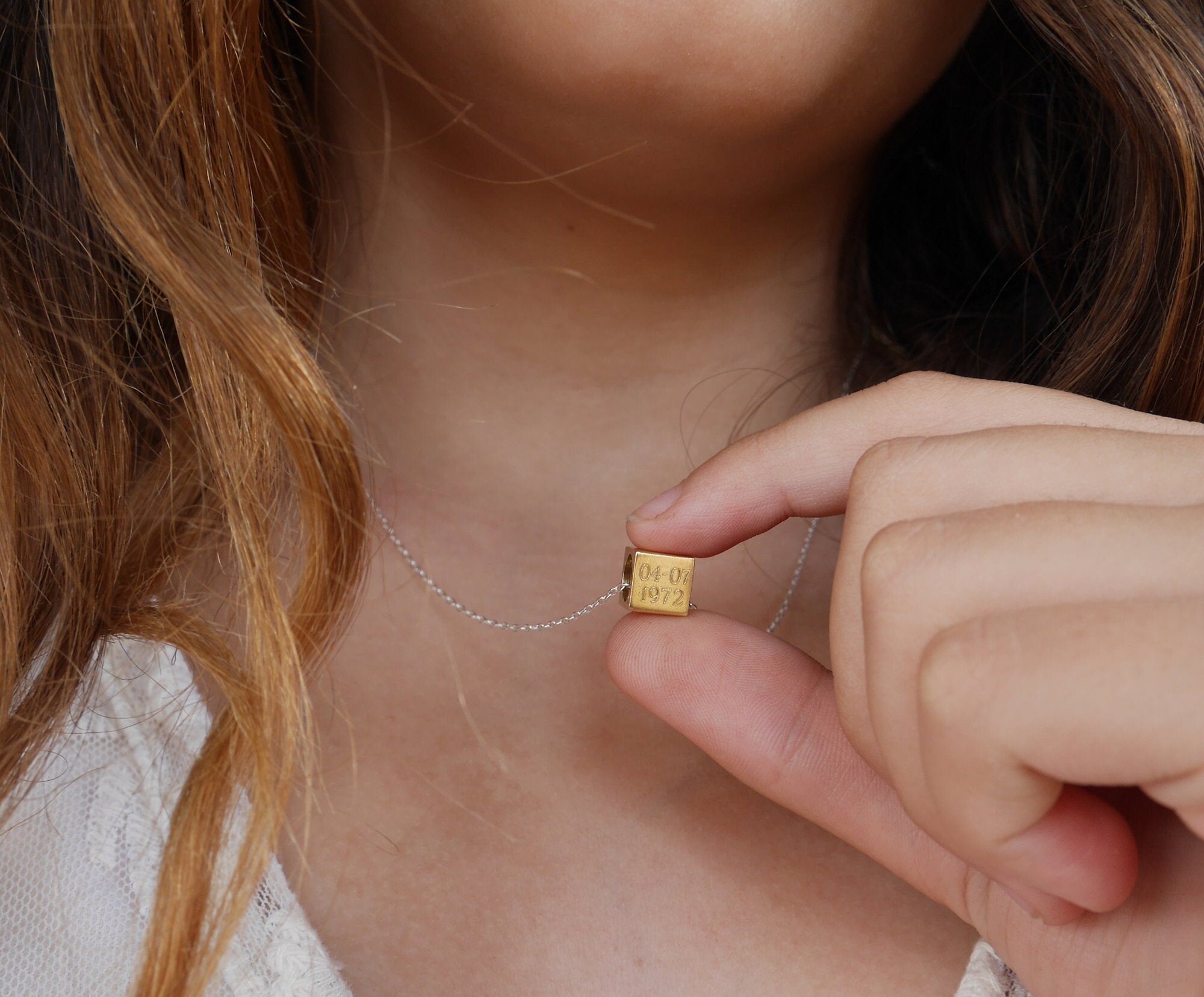 Personalised Gold Silver Delicate Necklace. Engraved Dainty Cube Necklace Gold and Silver.