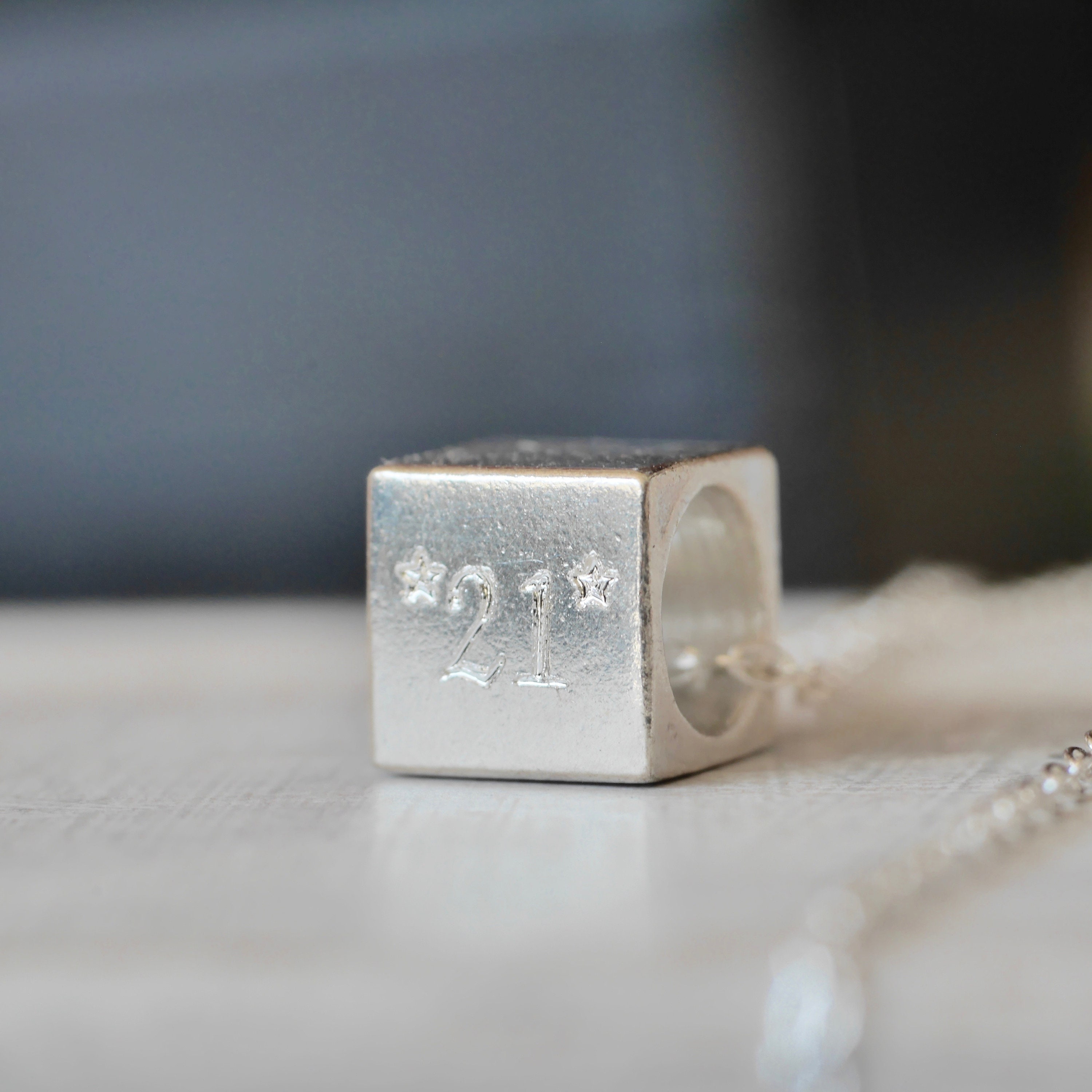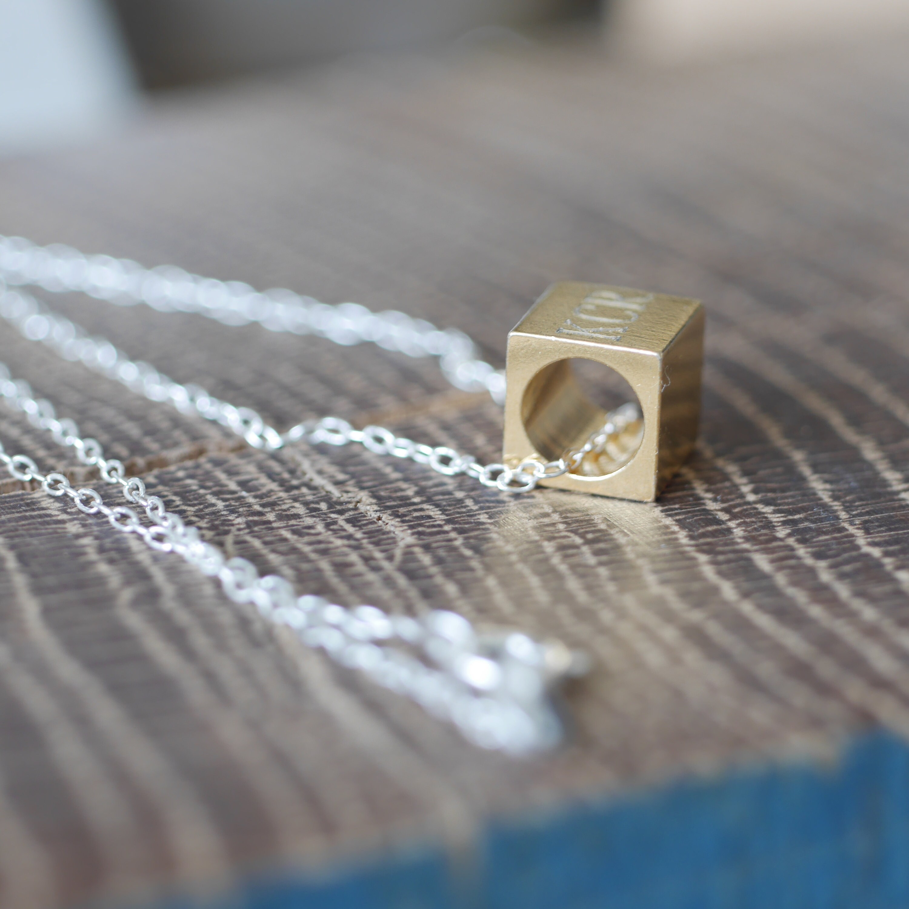 A very minimal, simple geometric small cube necklace comes with a personalisation option to make it even more special. A special gift for your important person with your memorable personal message.