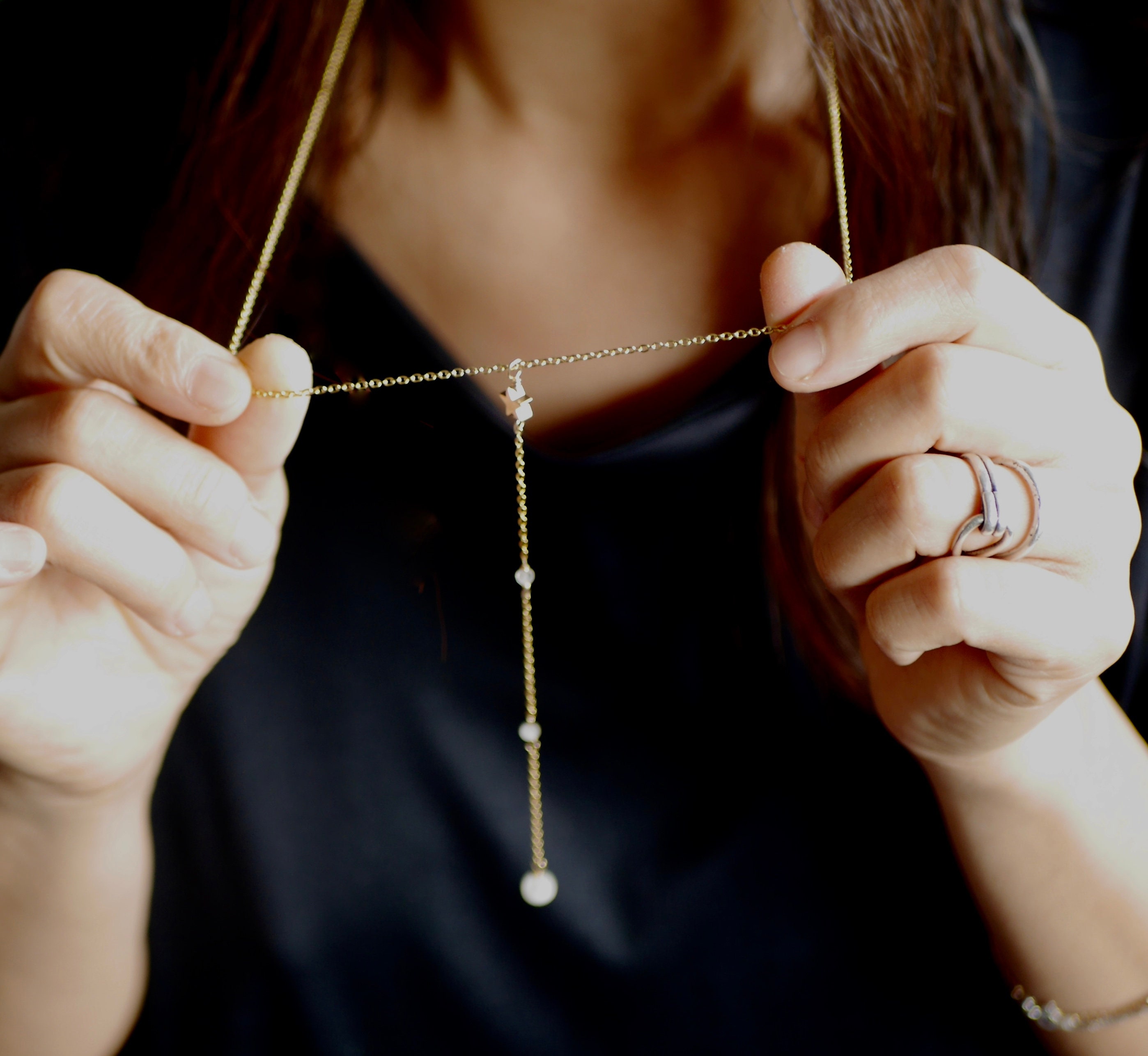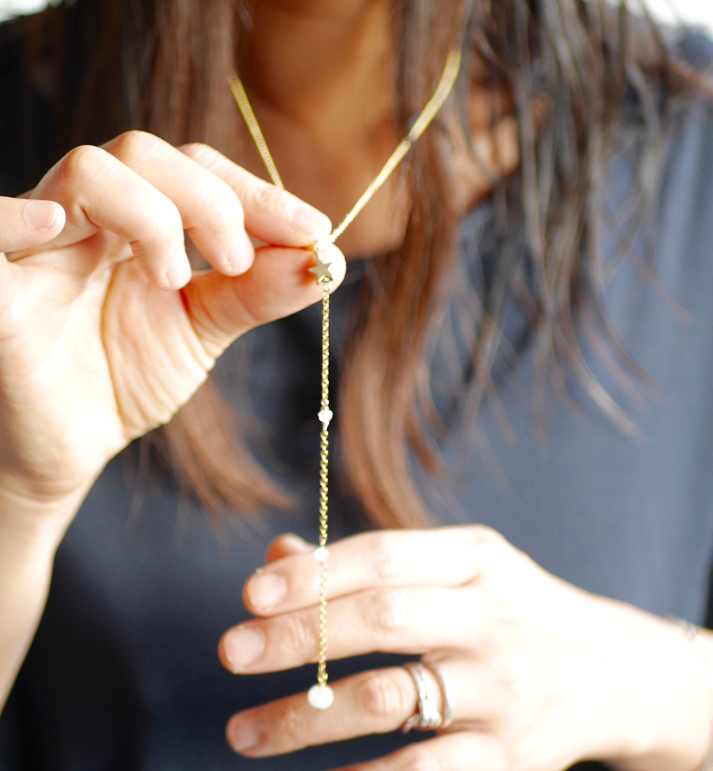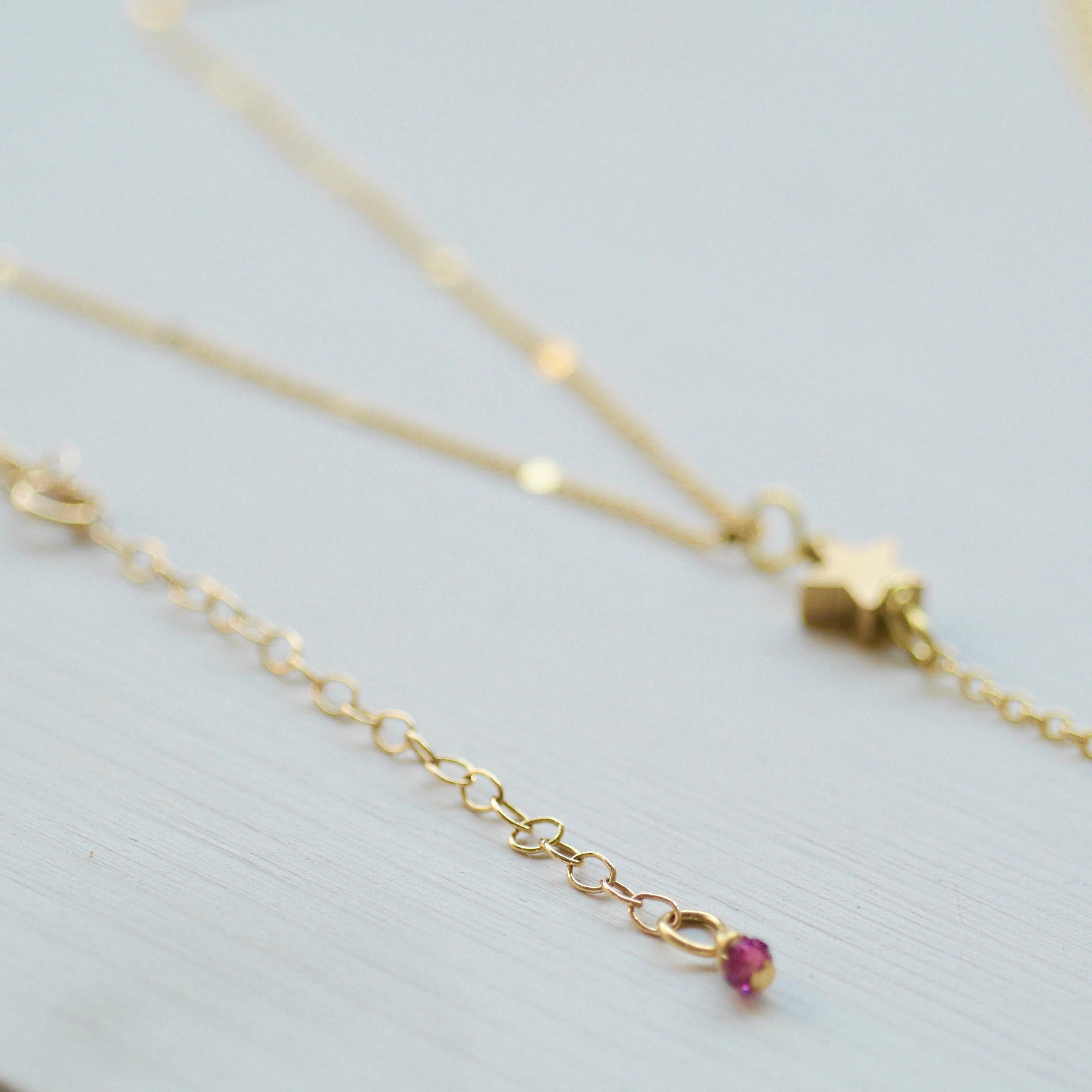 A beautiful and delicate personalised birthstone long gold Y necklace. This gold Y necklace offers carefully selected birthstones and a personalised star or round charm with an initial on it.