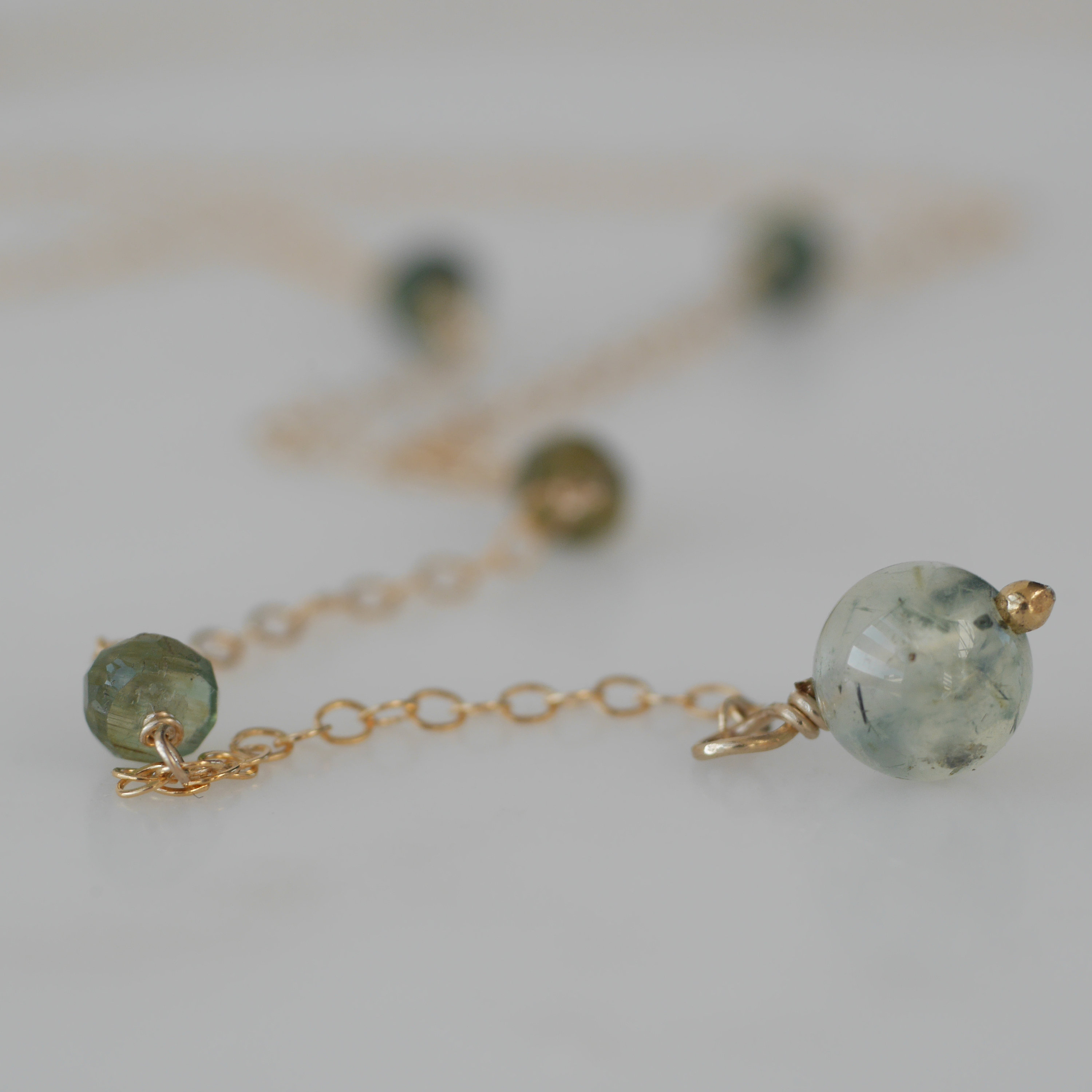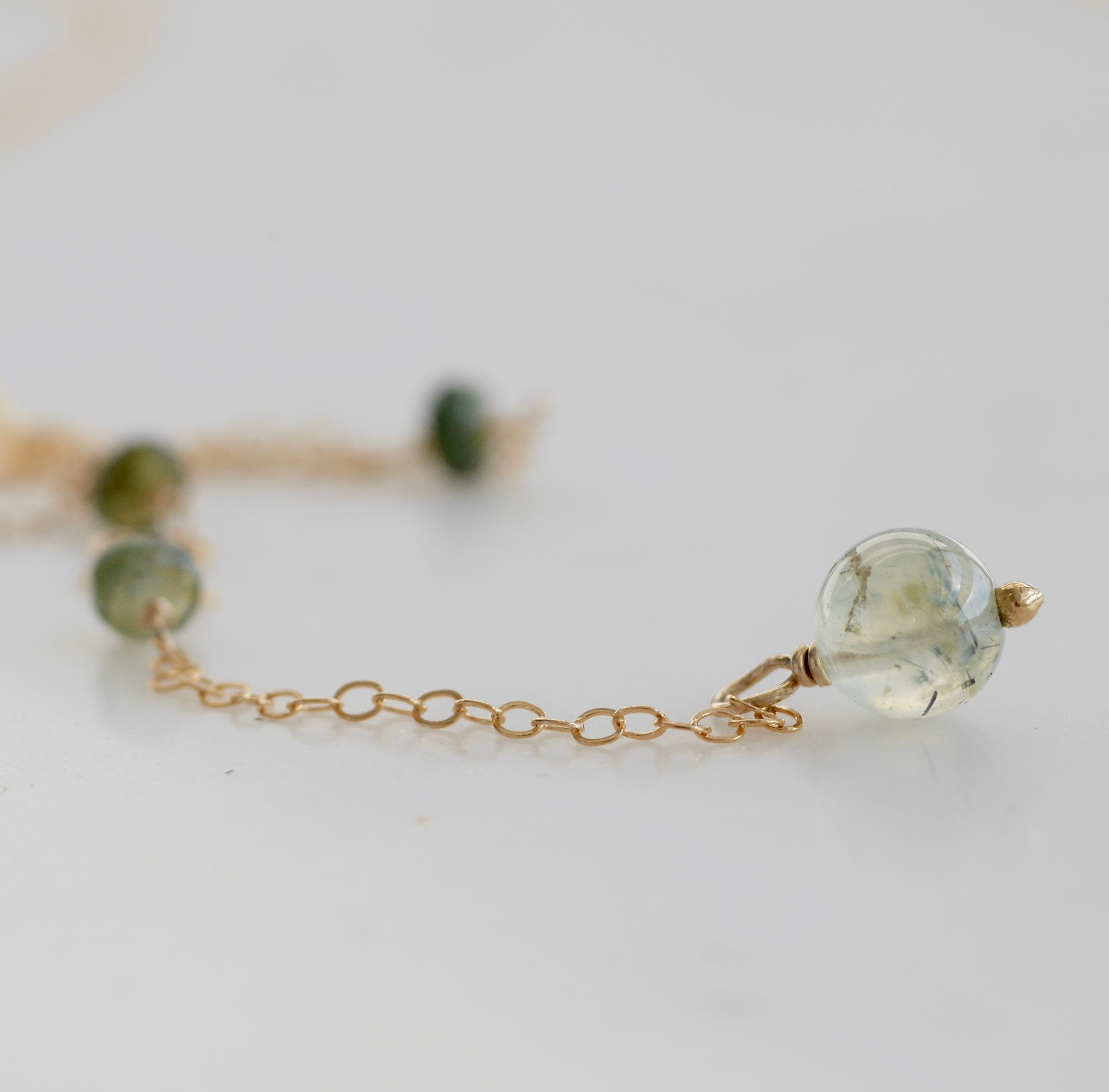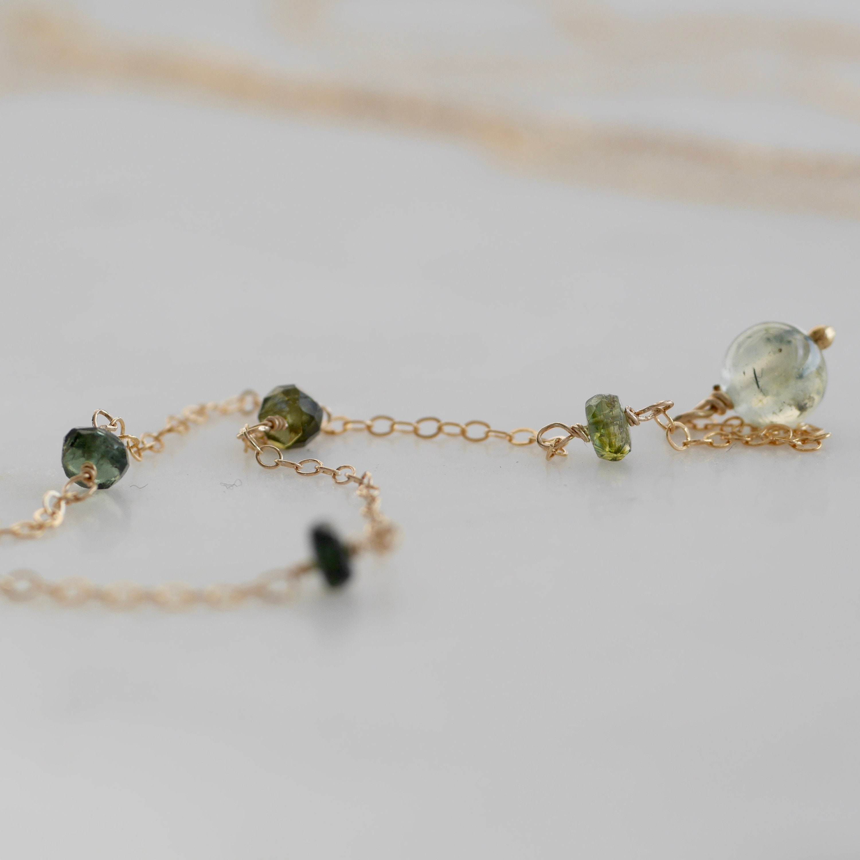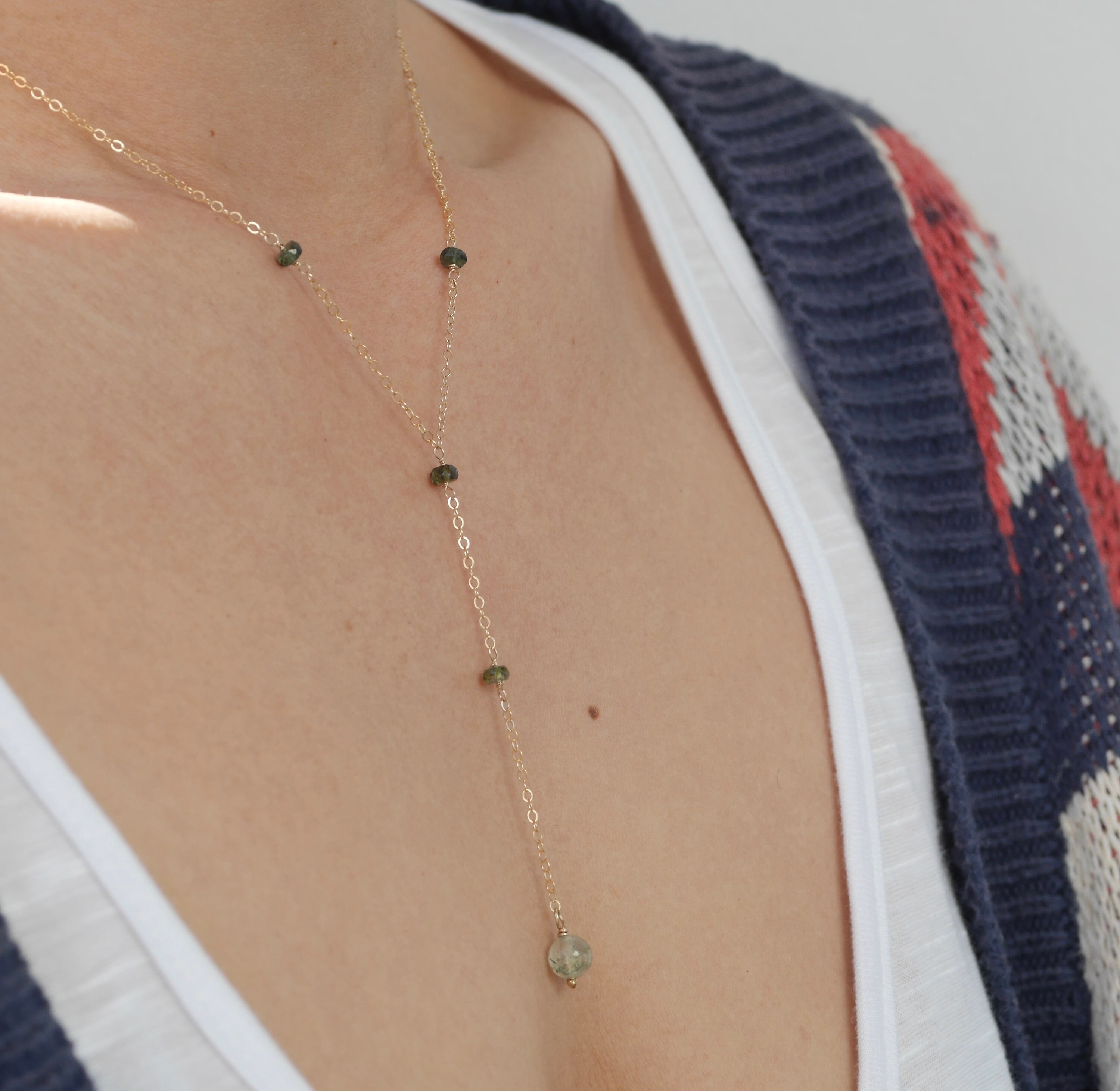-14 carat Goldfilled or sterling silver chain 3 scattered peridots attach to create 16inch length chain and total drop length is 7cm.