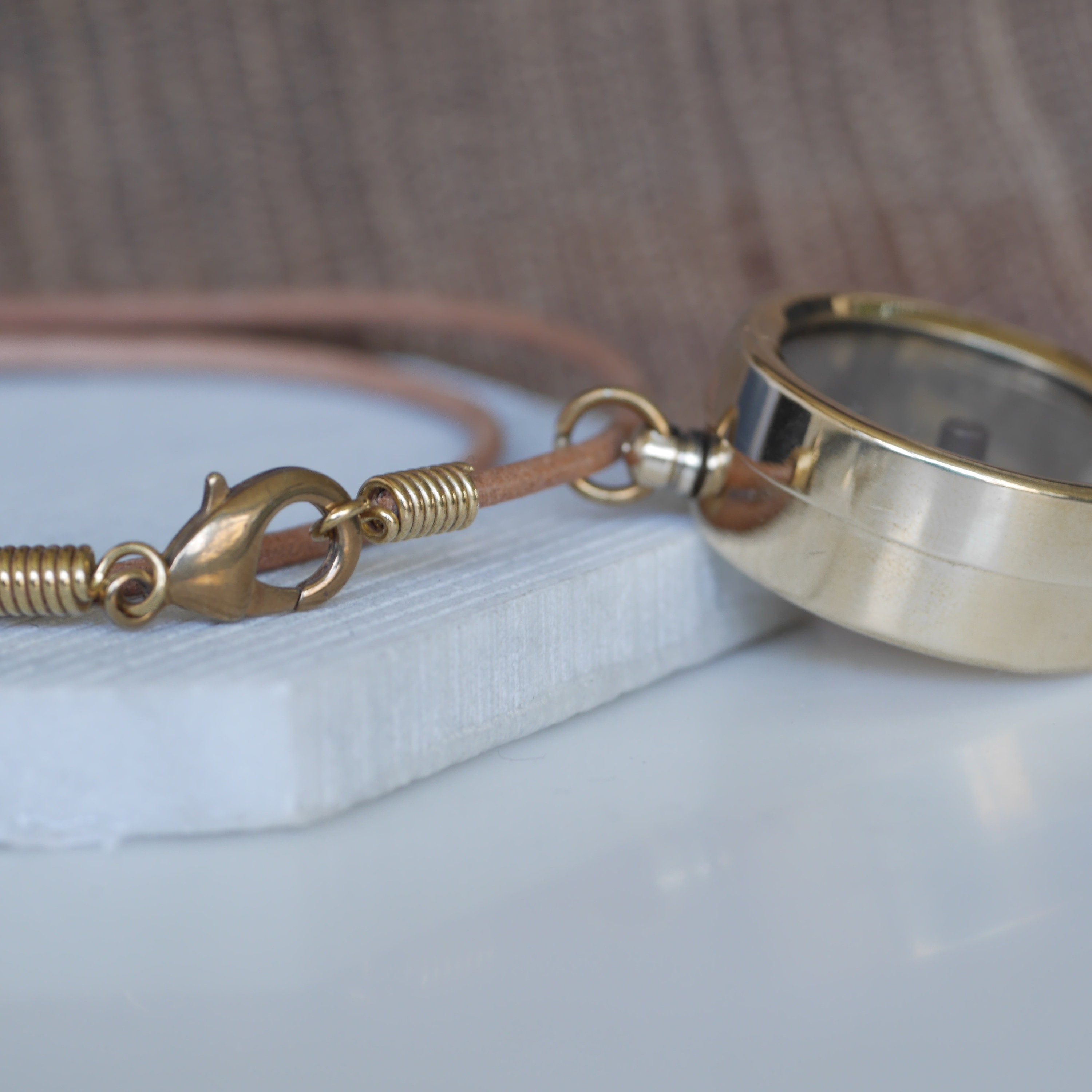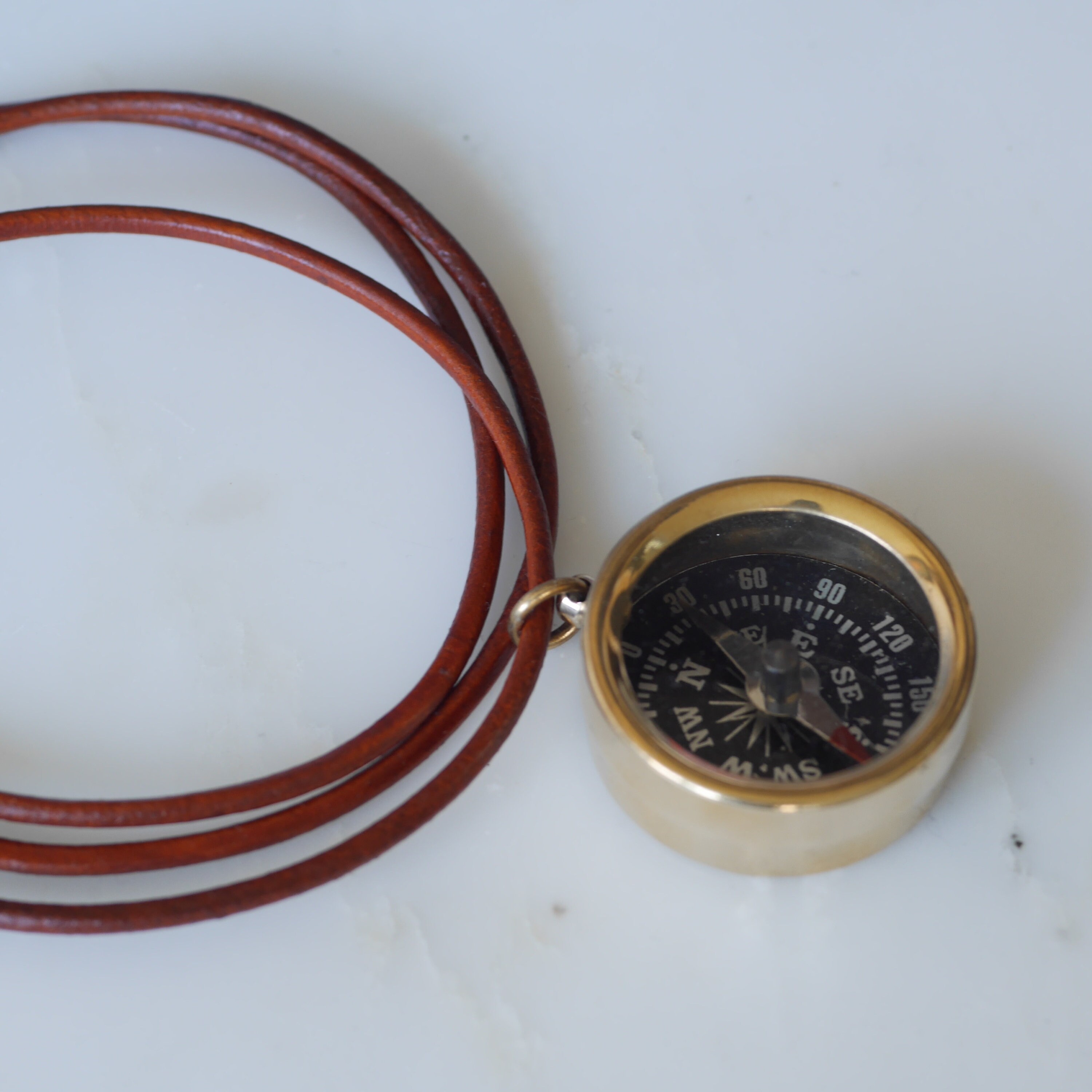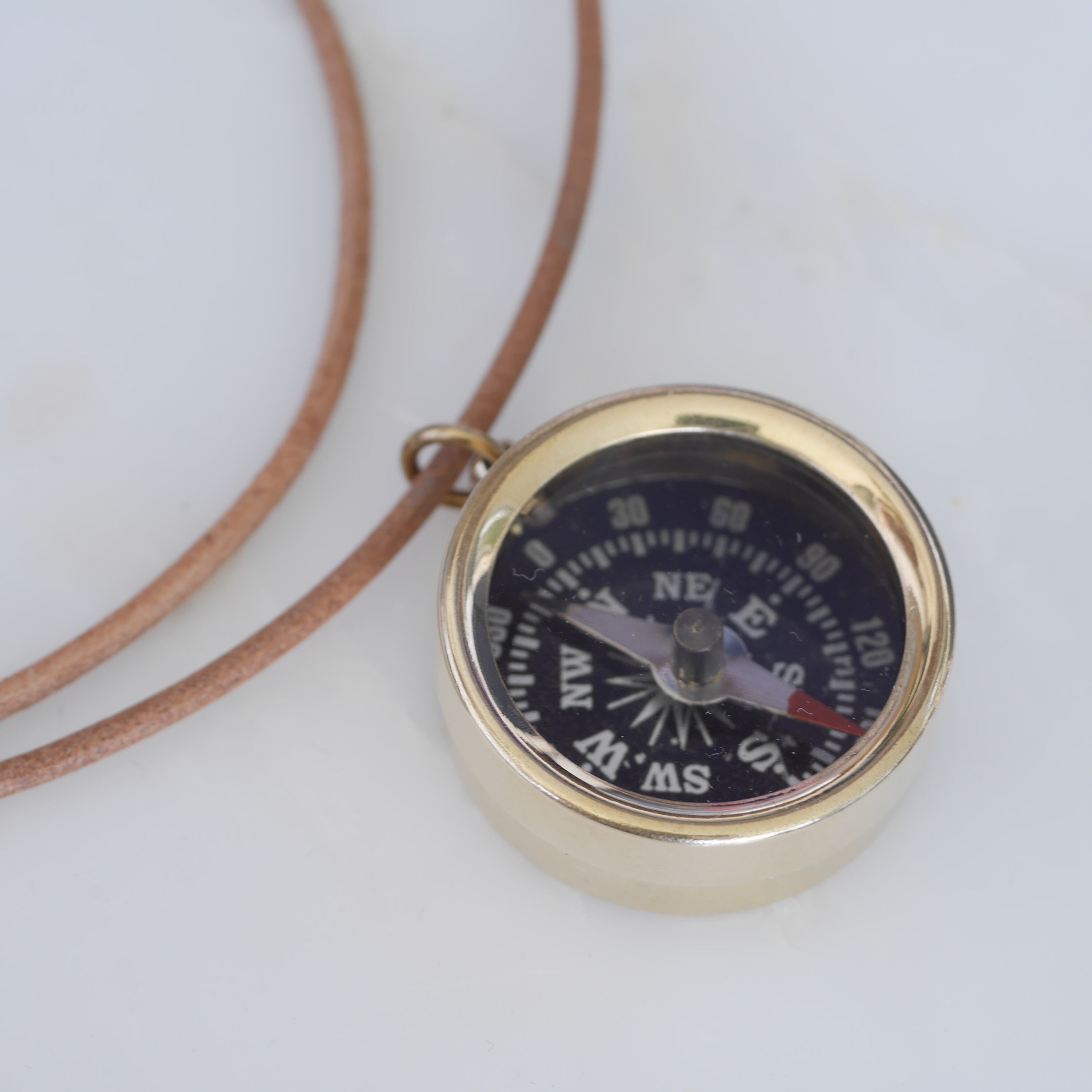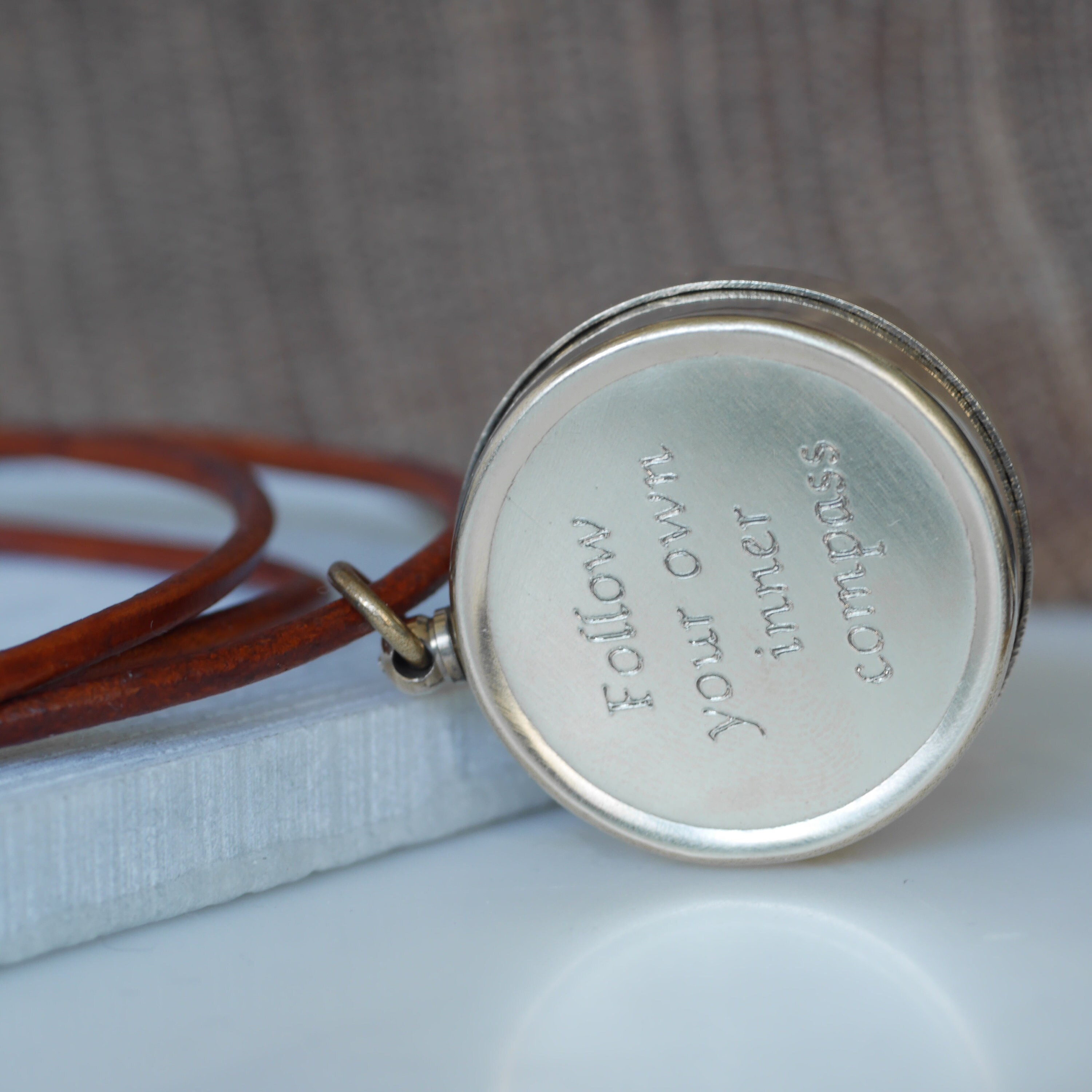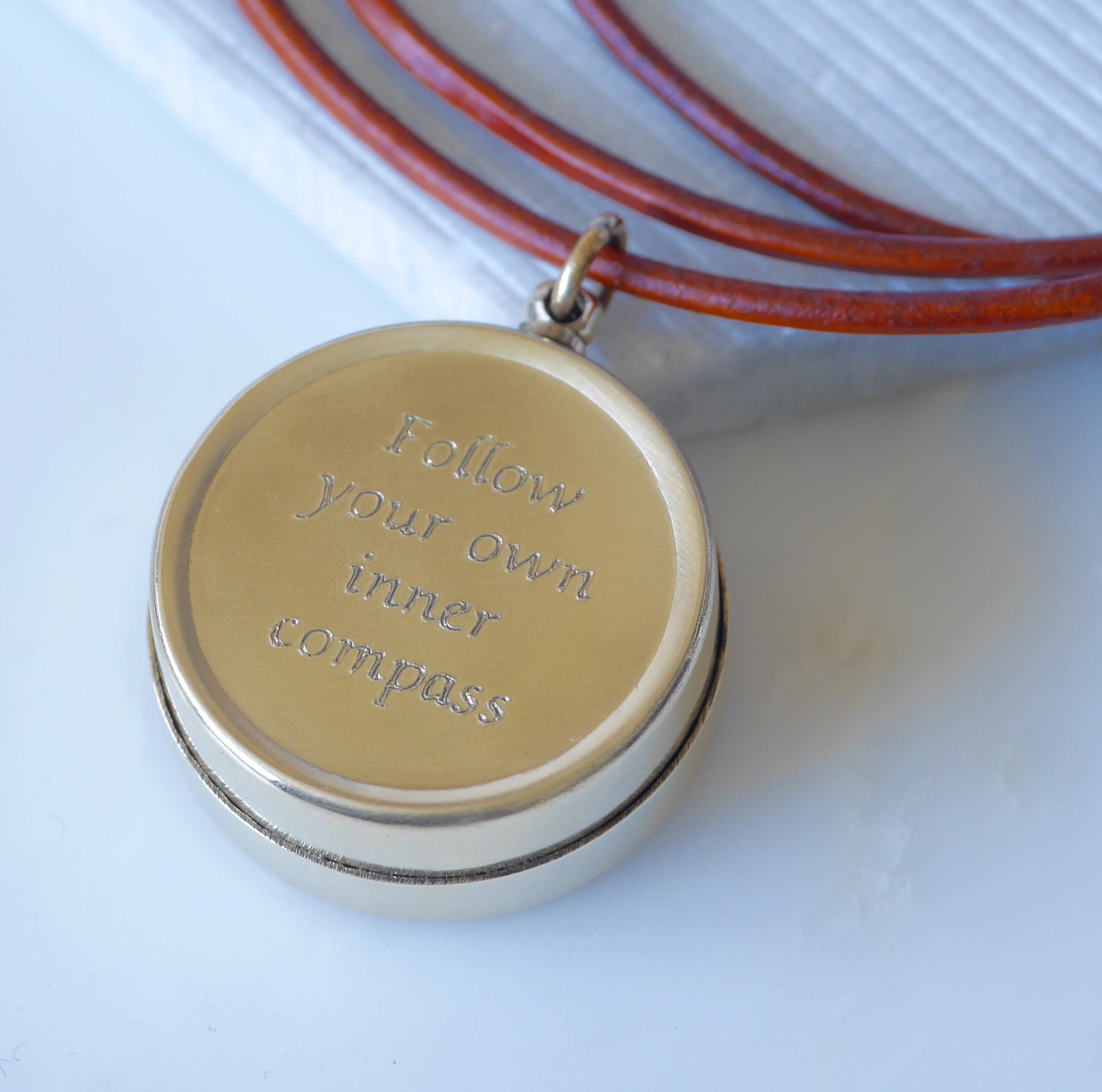 Personalised Custom Secret Message Raw Brass Small Compass Leather Cord Necklace.