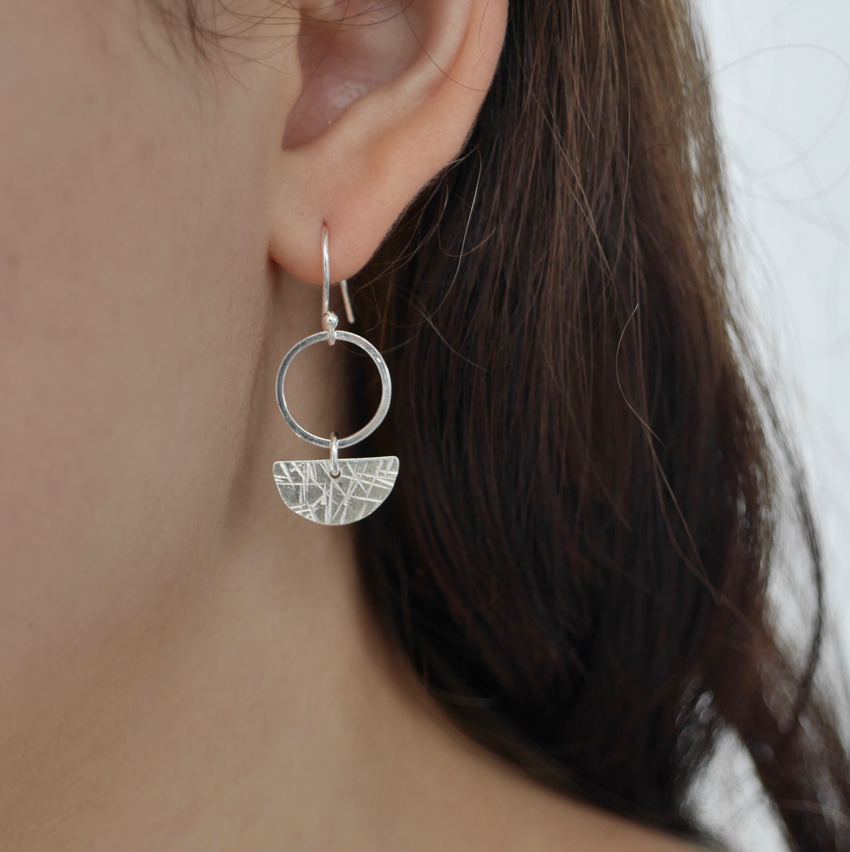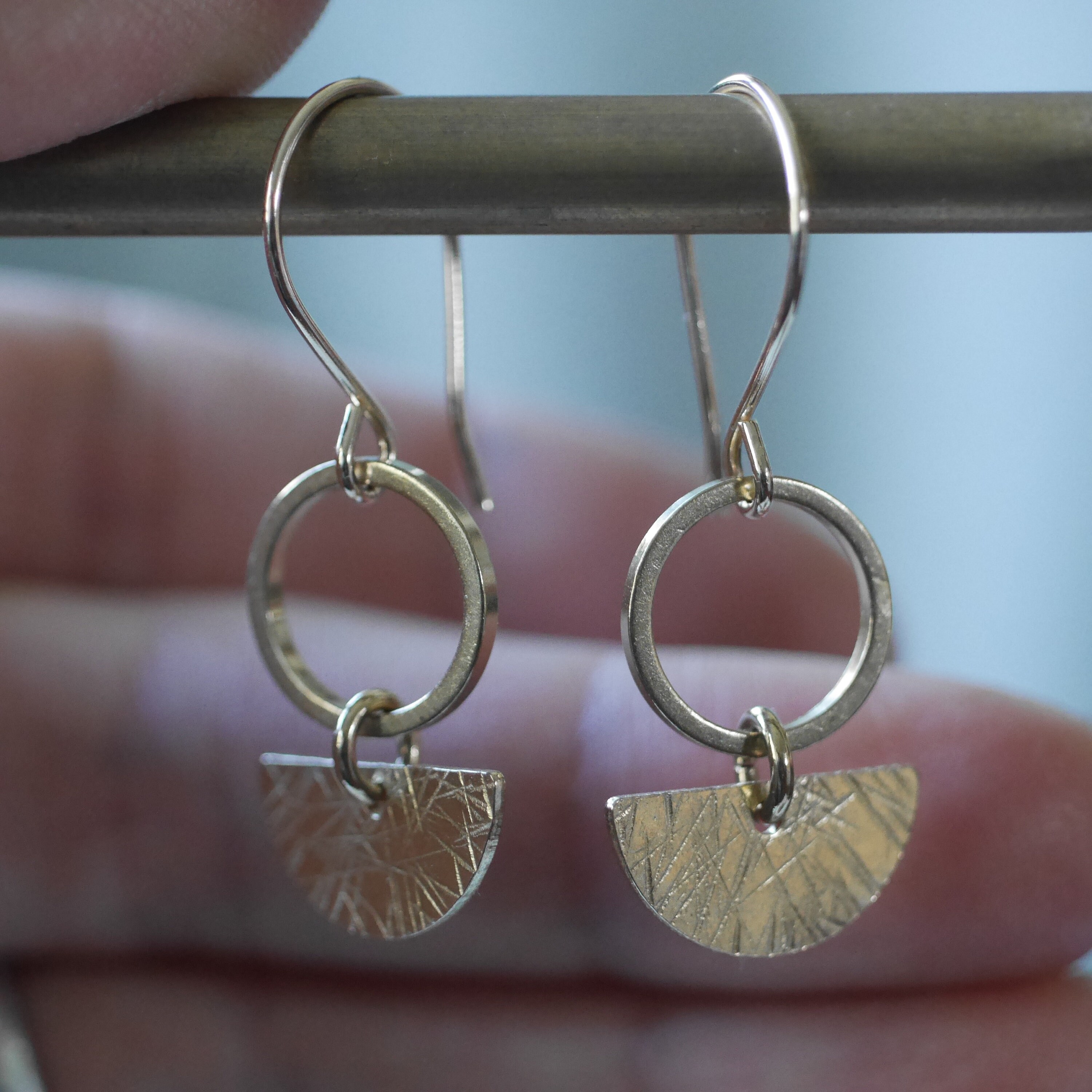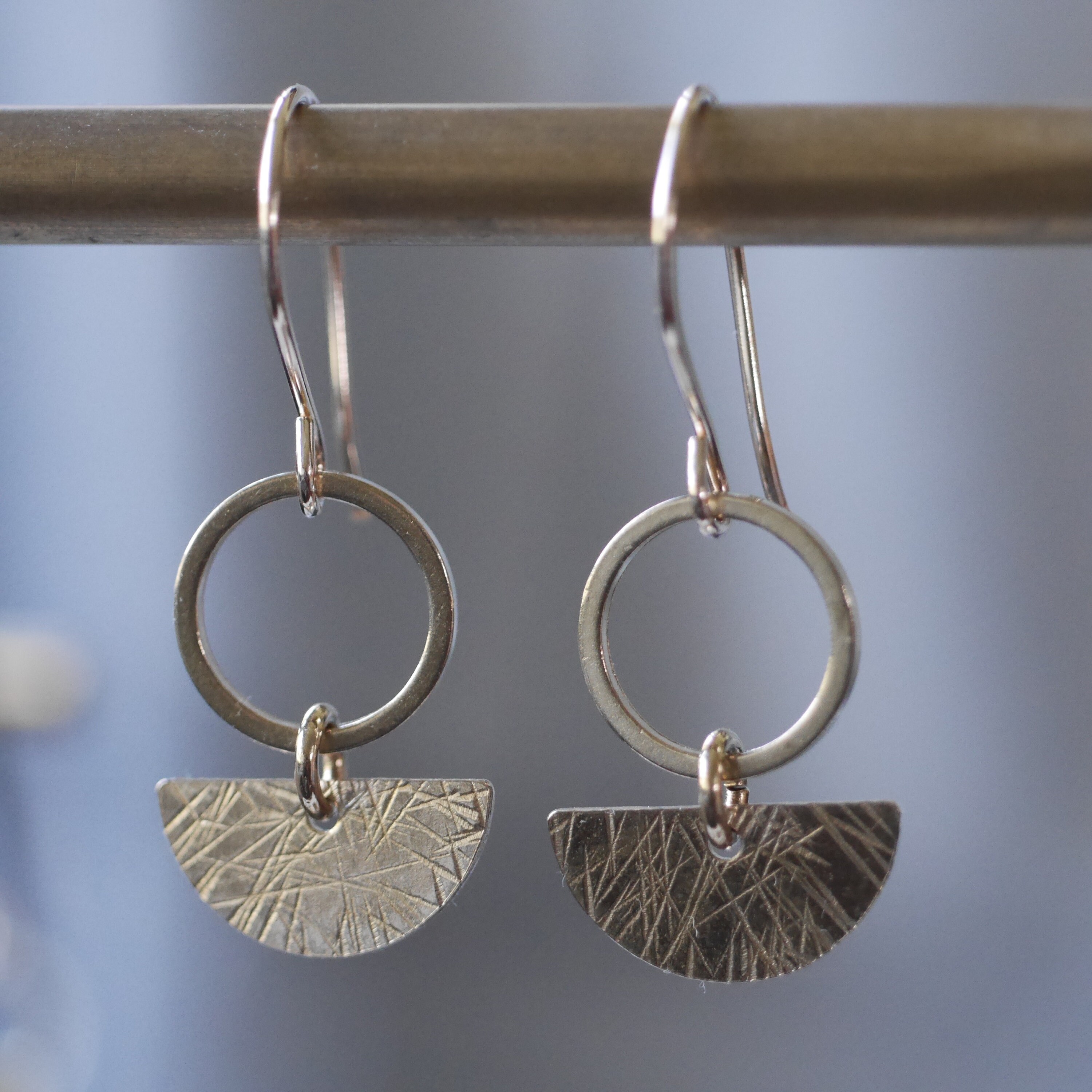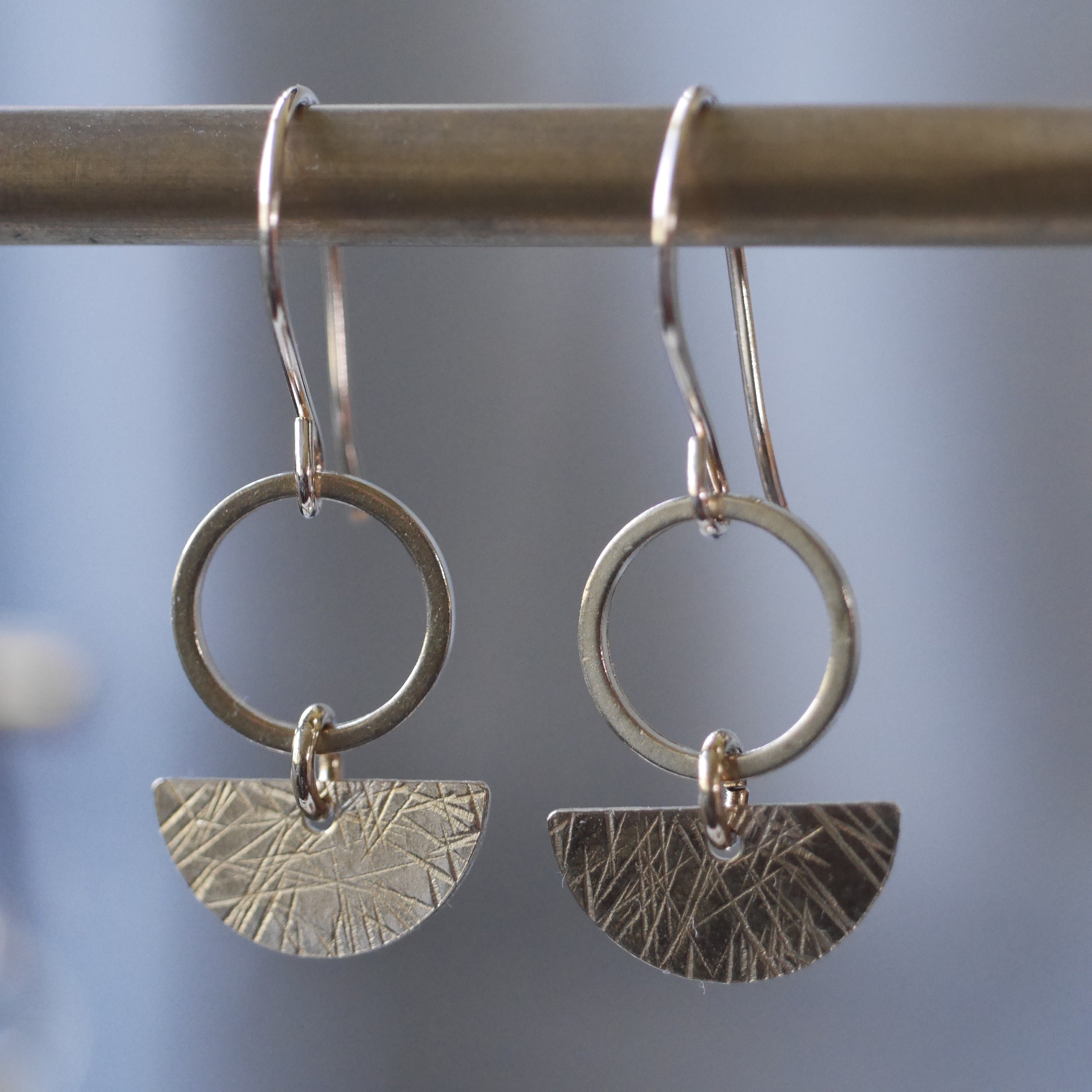 Handmade textured circle and semi-circle gold or silver drop and dangle earrings.