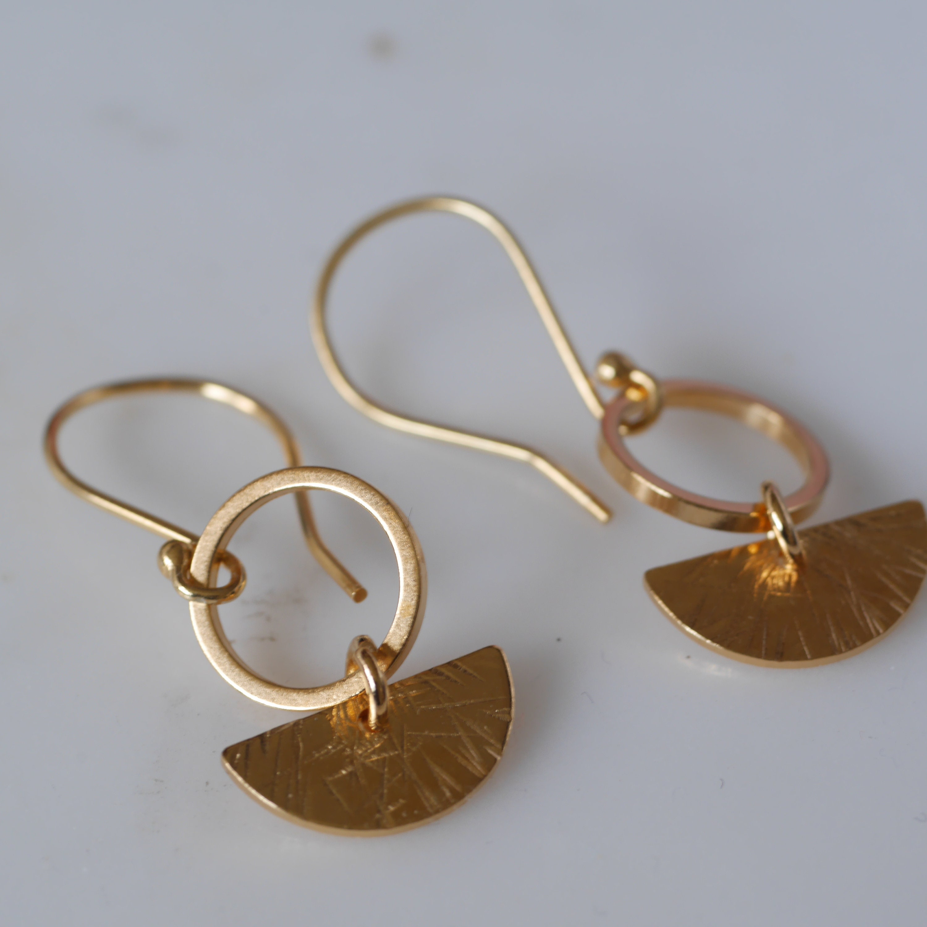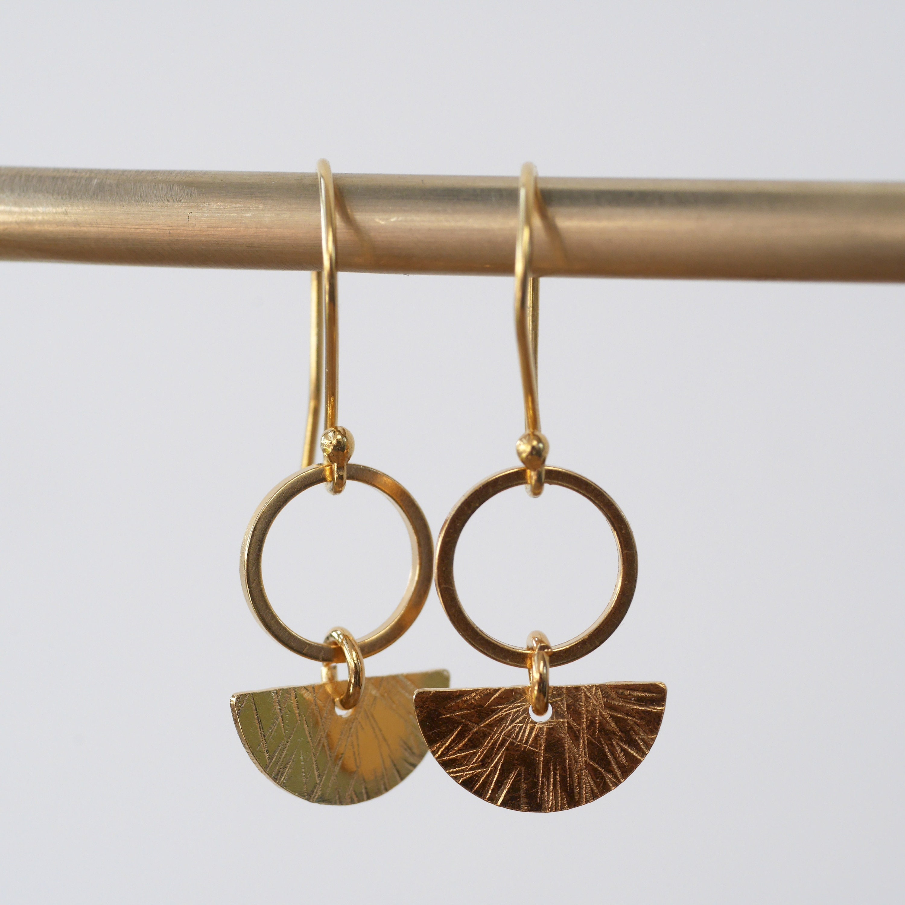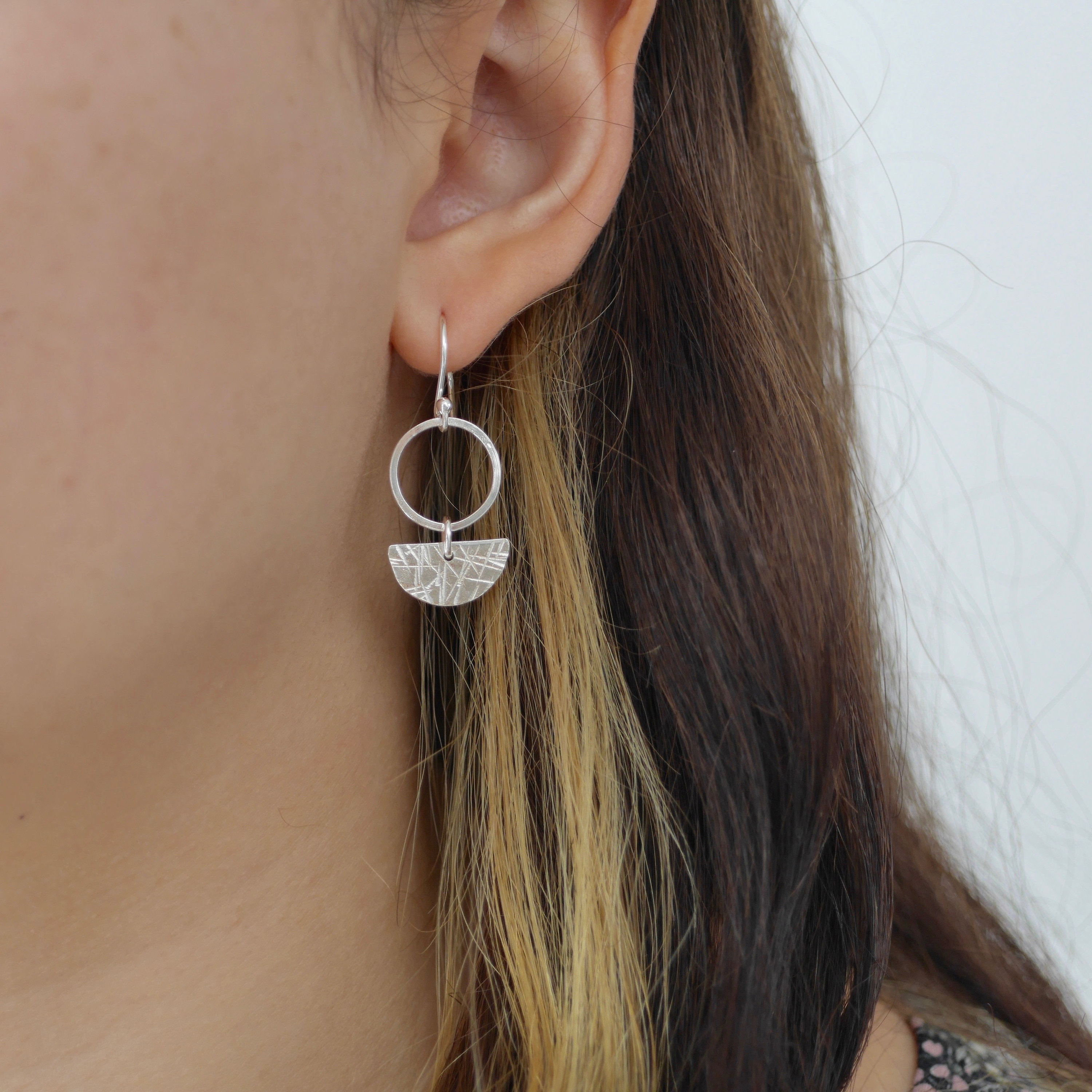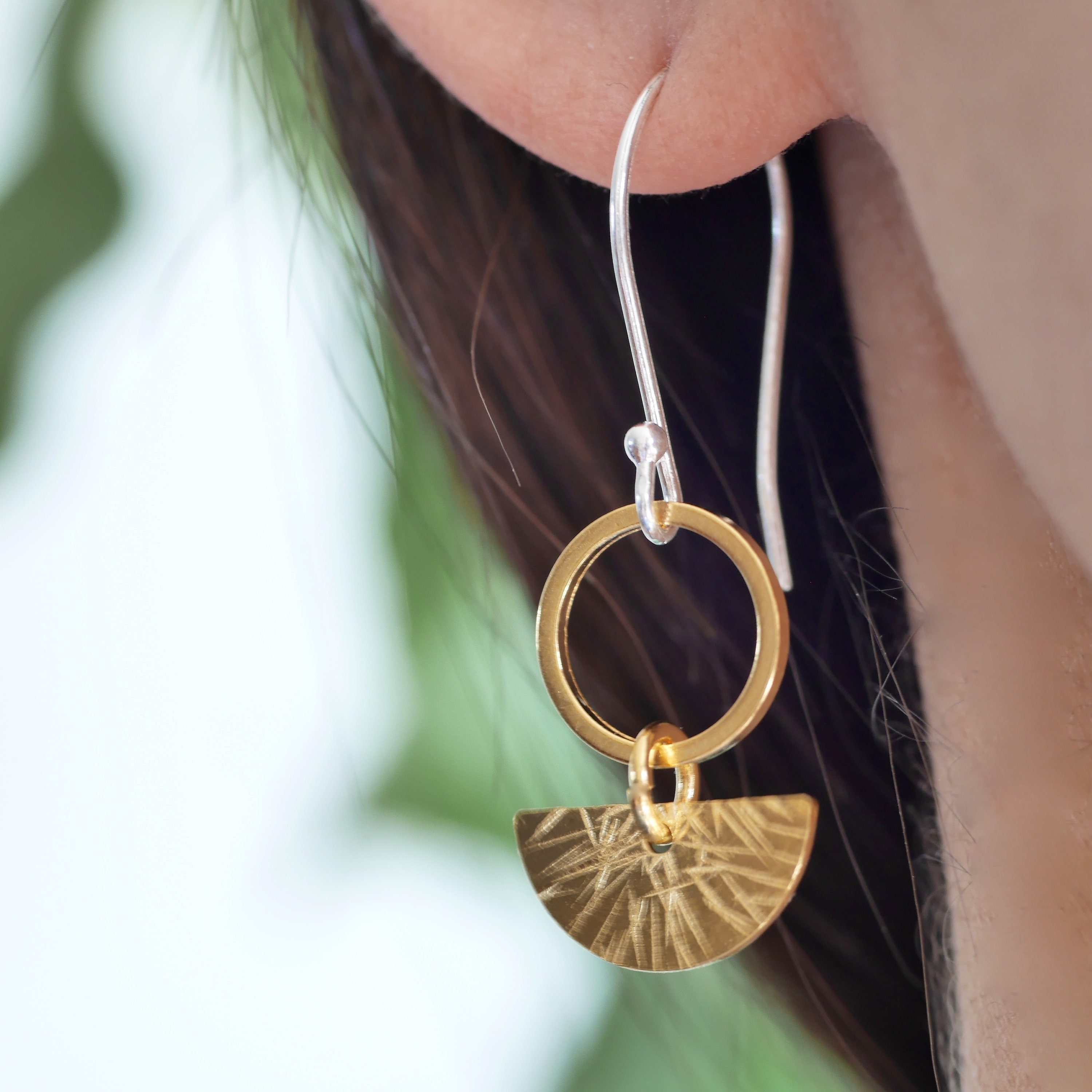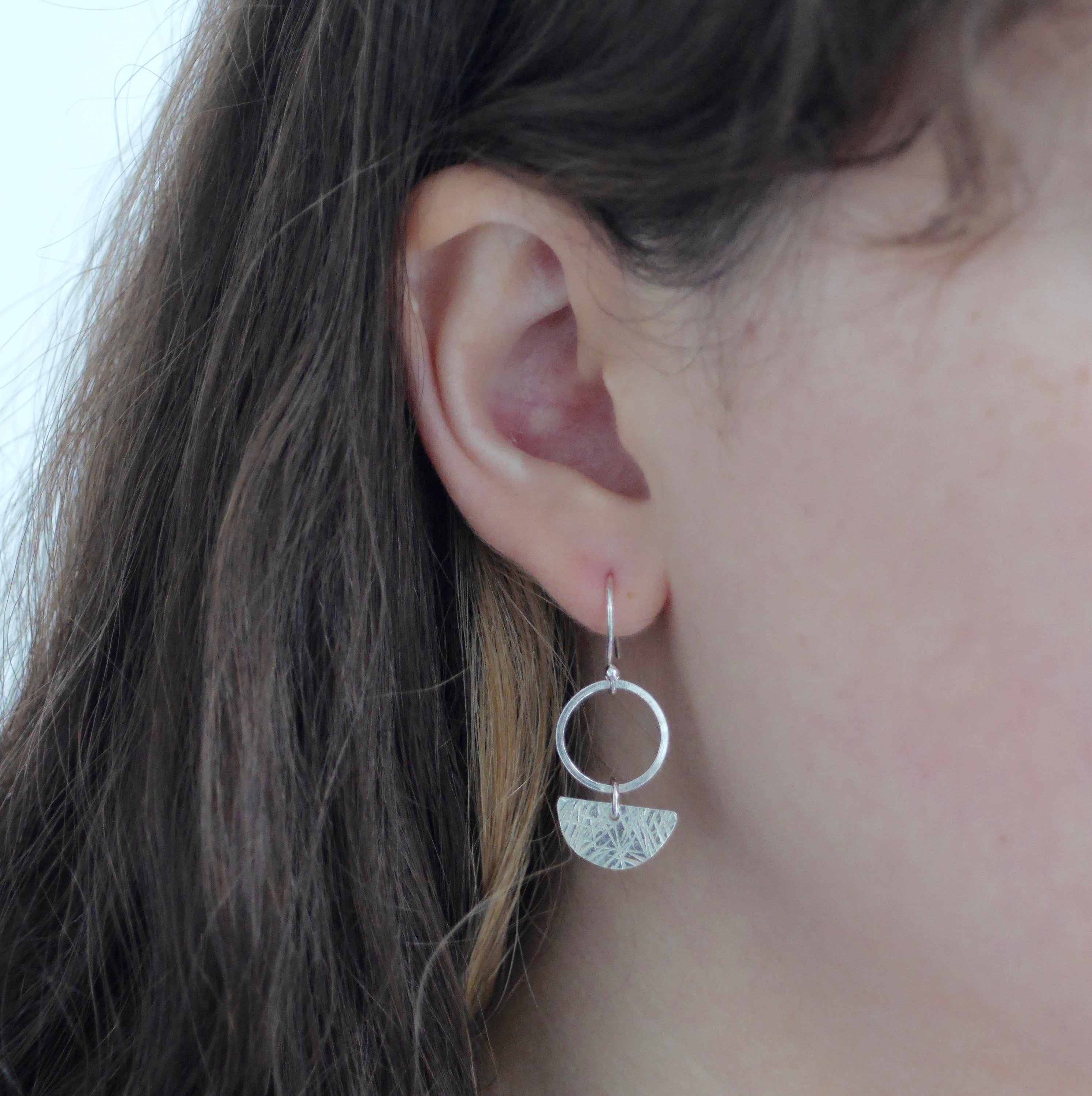 Handmade textured circle and semi-circle gold or silver drop and dangle earrings.