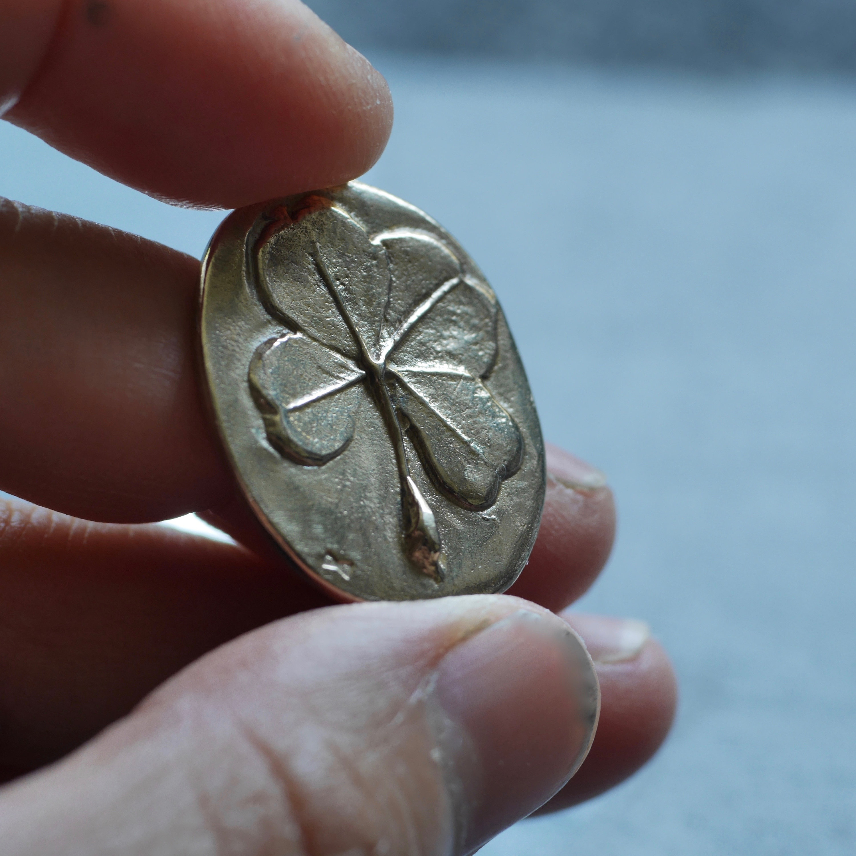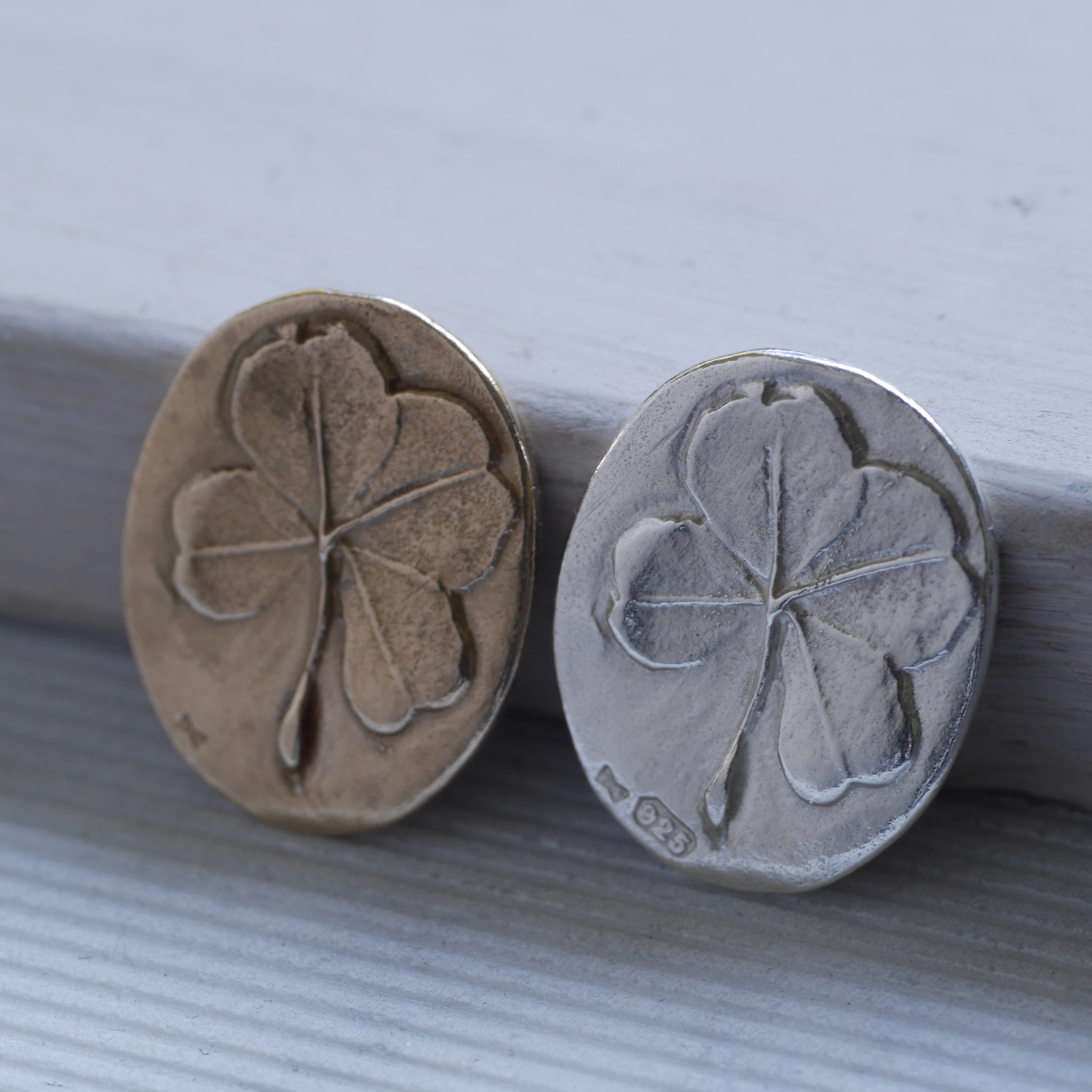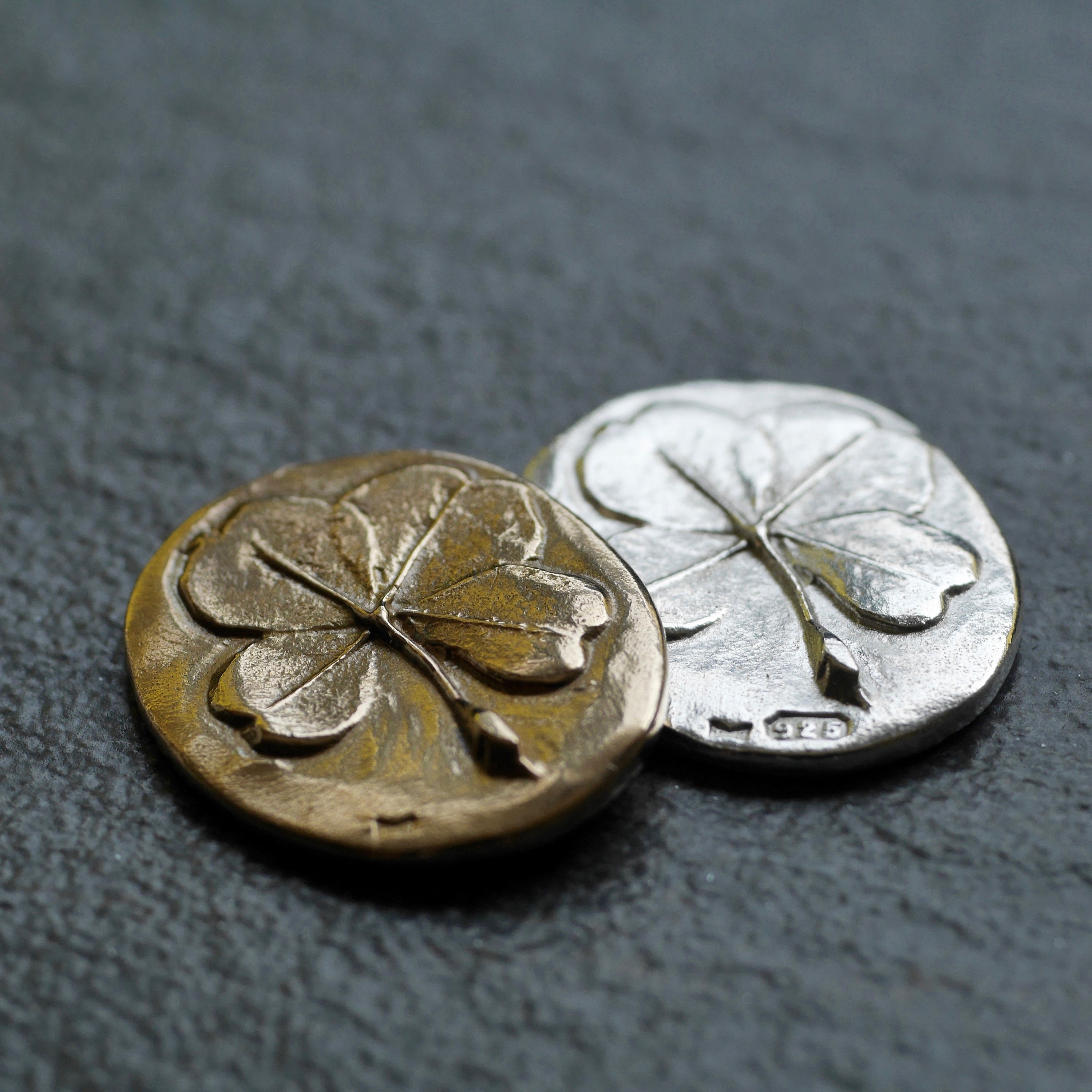 - Four-leaf clover oval charm coin 2.5cm length, 2cm width, 2mm thickness casted in solid sterling silver or solid bronze