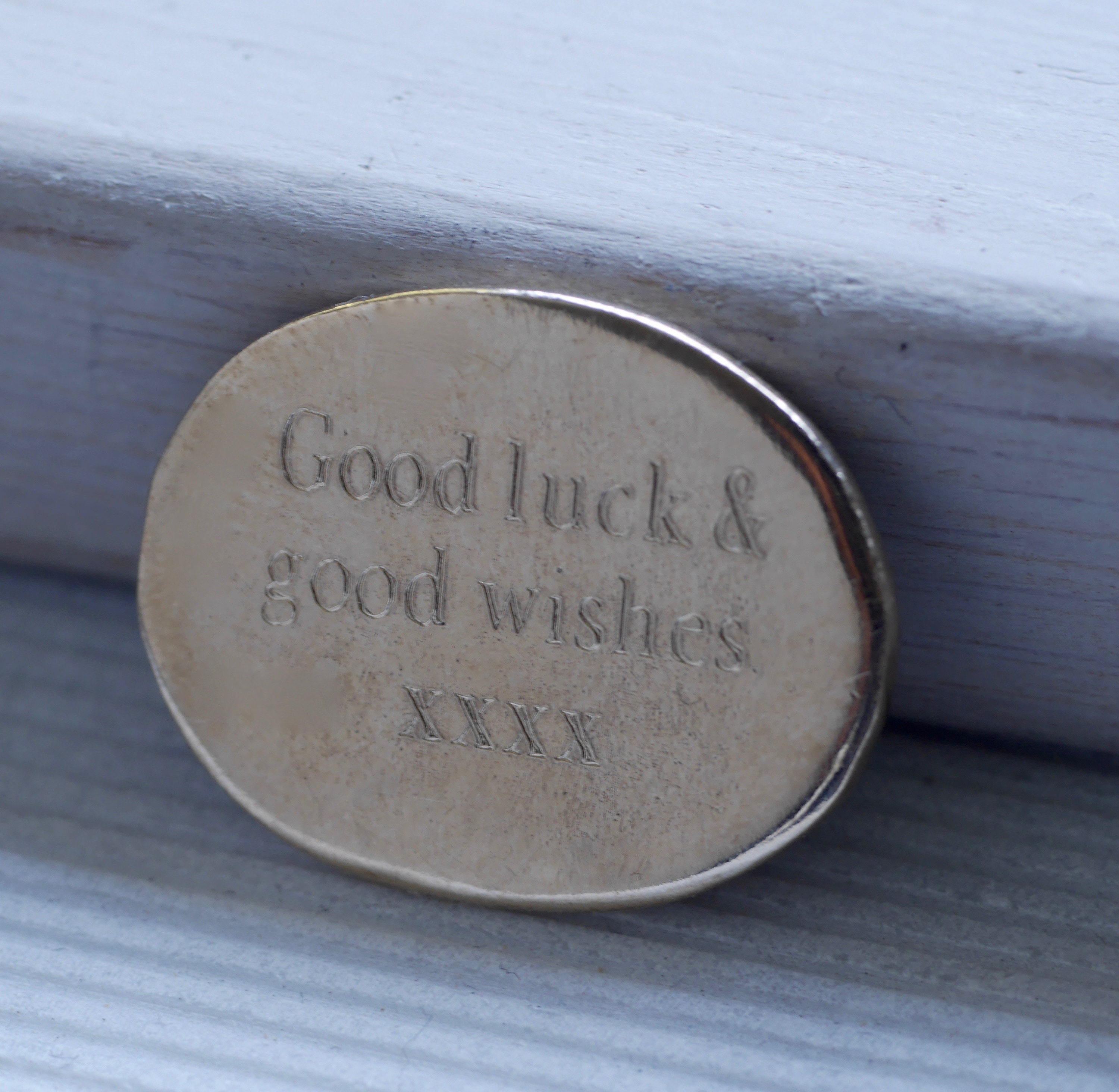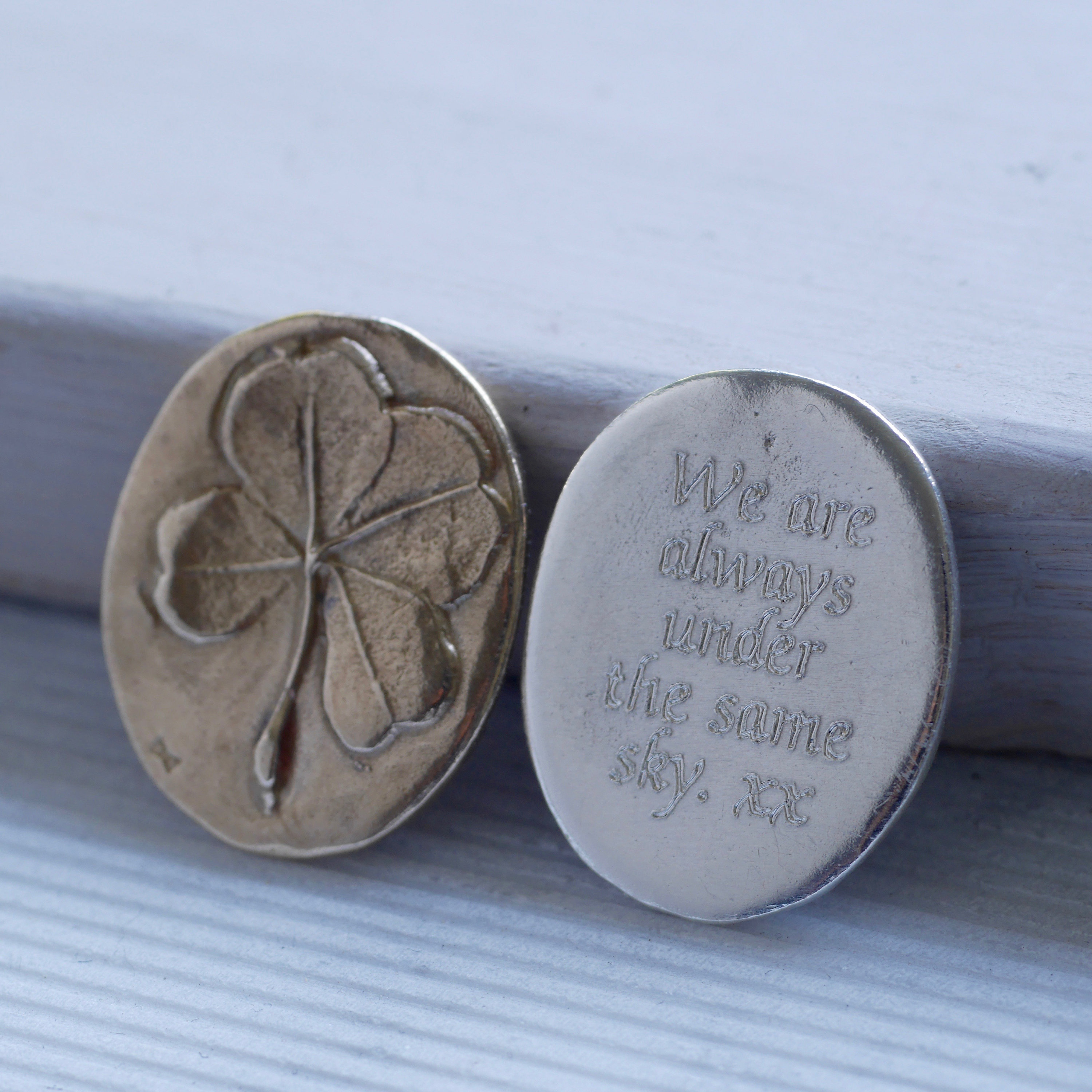 This shamrock charm is available in solid sterling silver or solid bronze and I can personalise your clover pocket coin with your special message engraved on it.