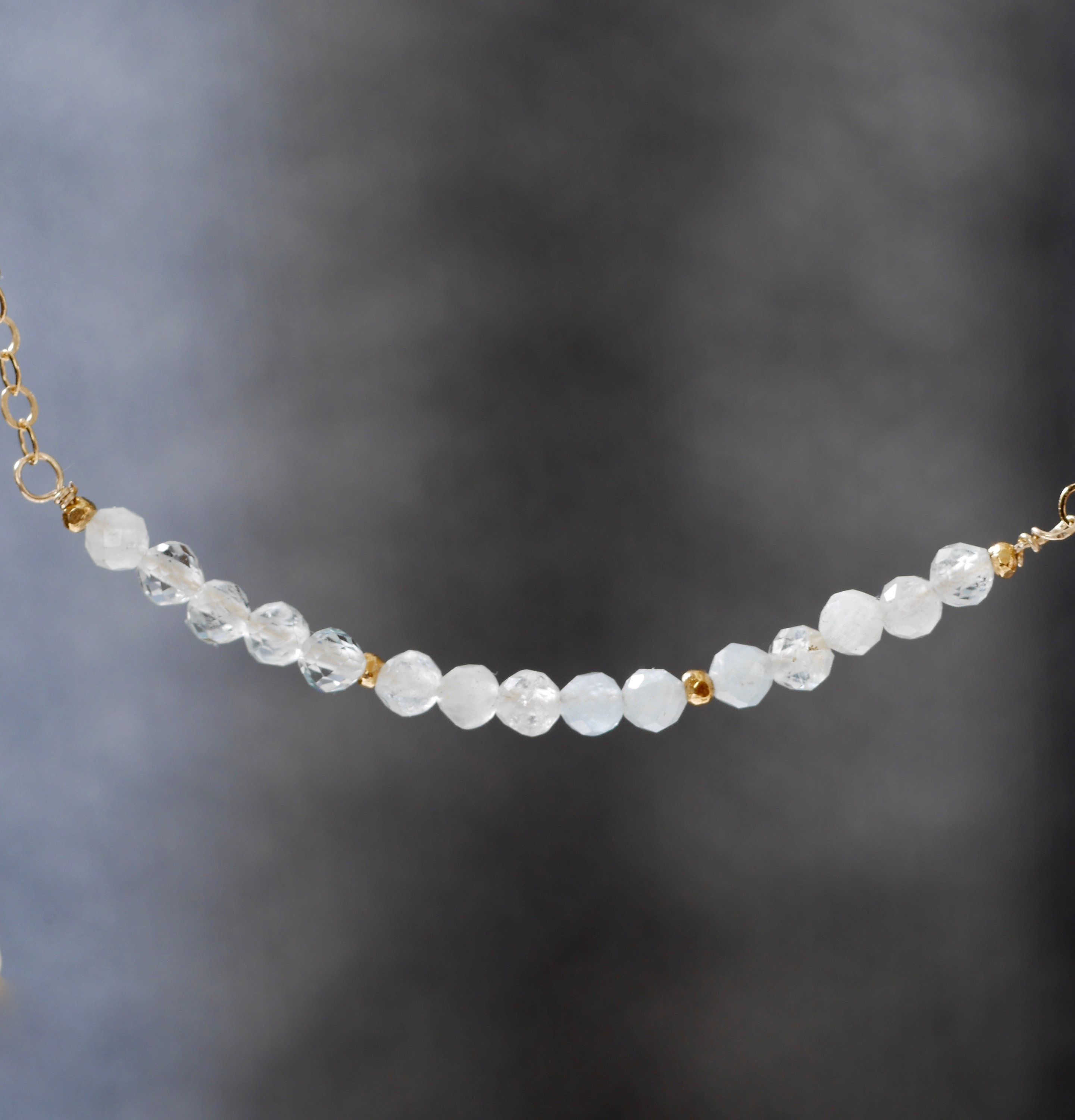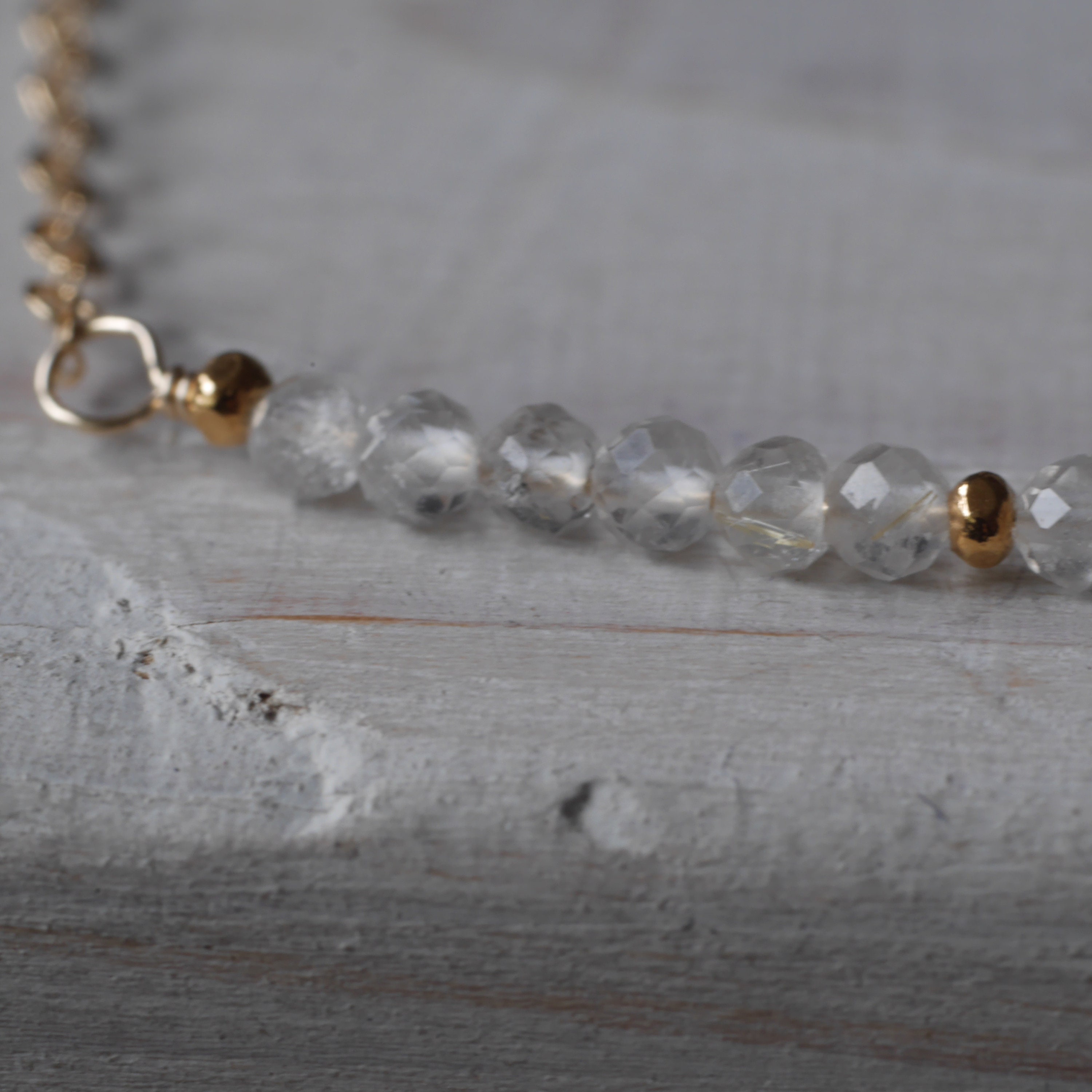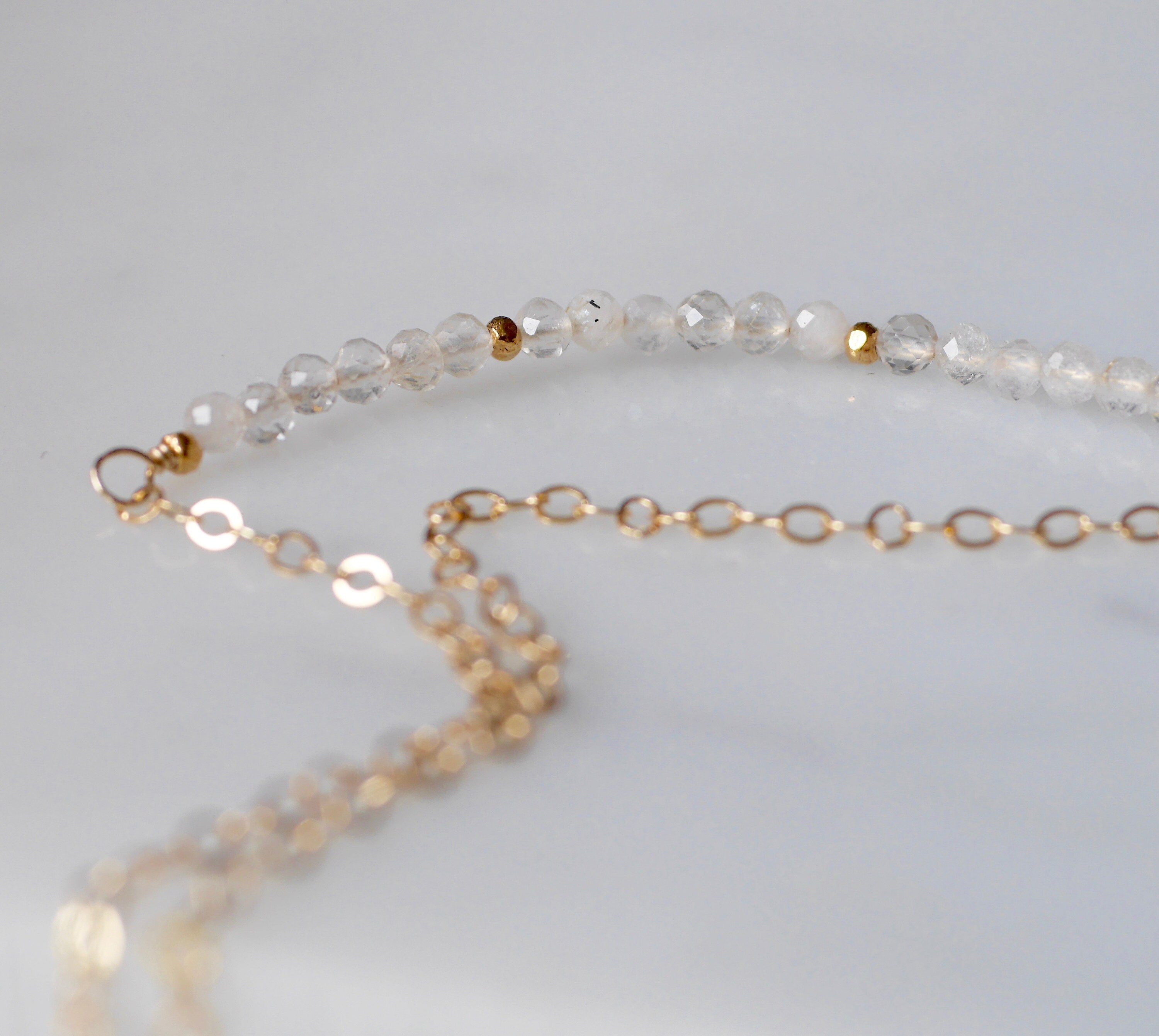 2-3mm faceted clear quartz gemstones combined with gold vermeil or sterling silver tiny beads in the middle and both ends make it about 4cm in length. The chain length is 45cm/18inch. If you would like a longer and shorter length, please contact me directly for more details.