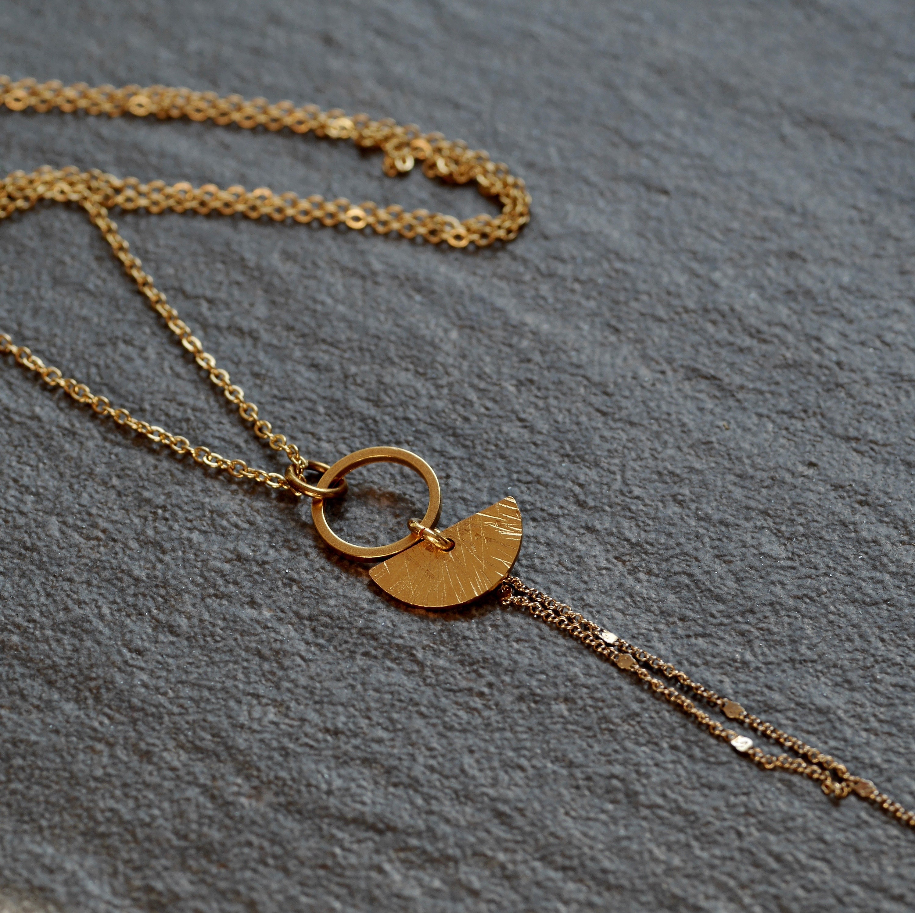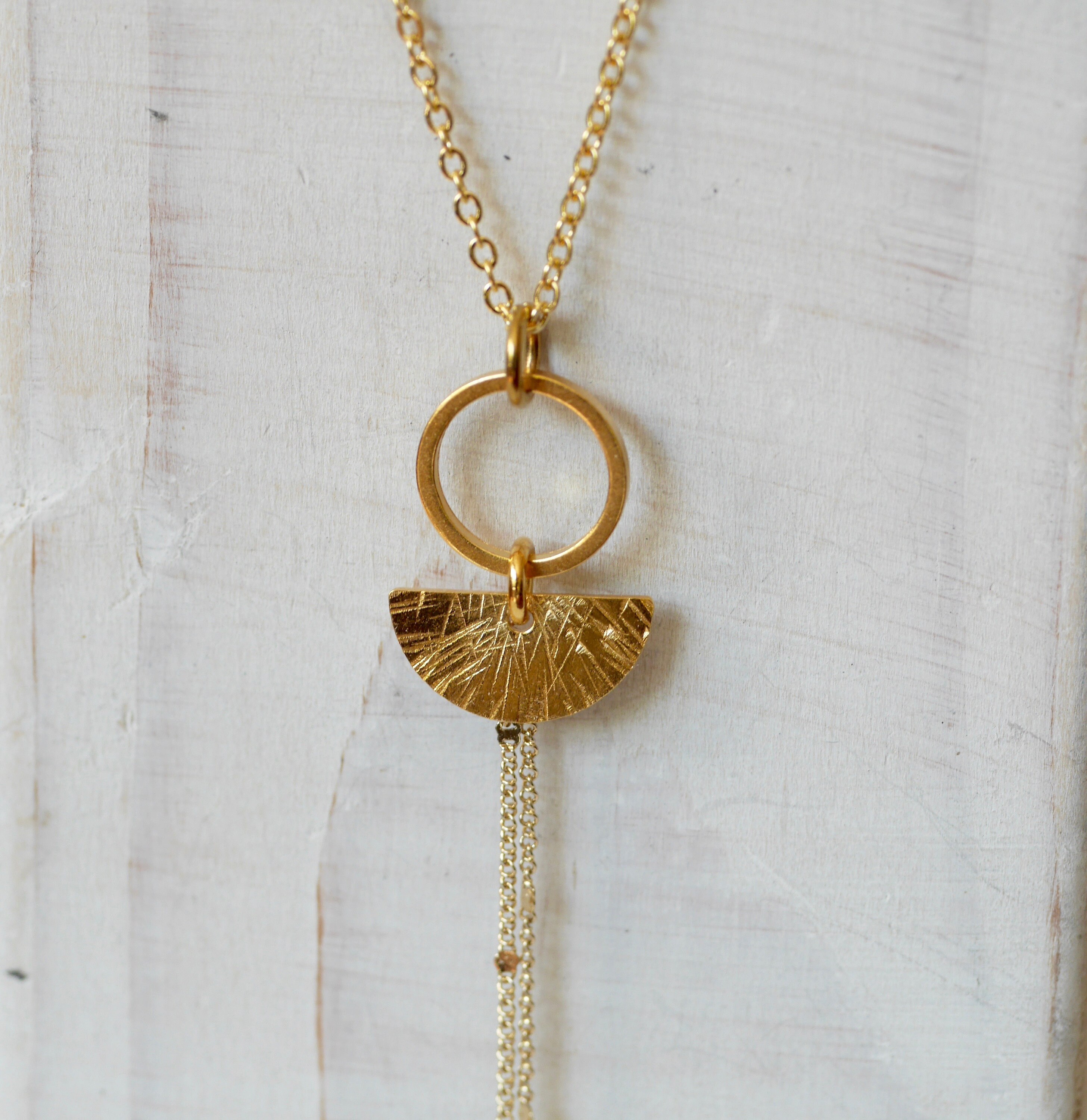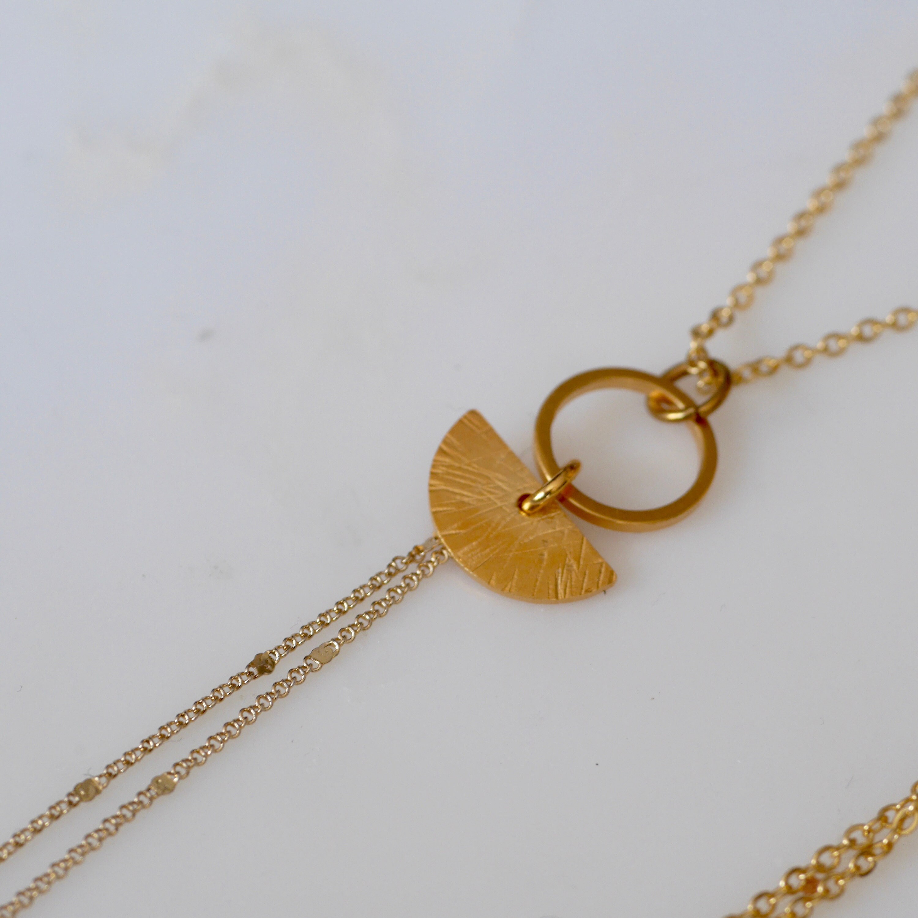 Handmade textured semi-circle and circle geometric necklace available in raw brass, sterling silver or gold-plated finish.