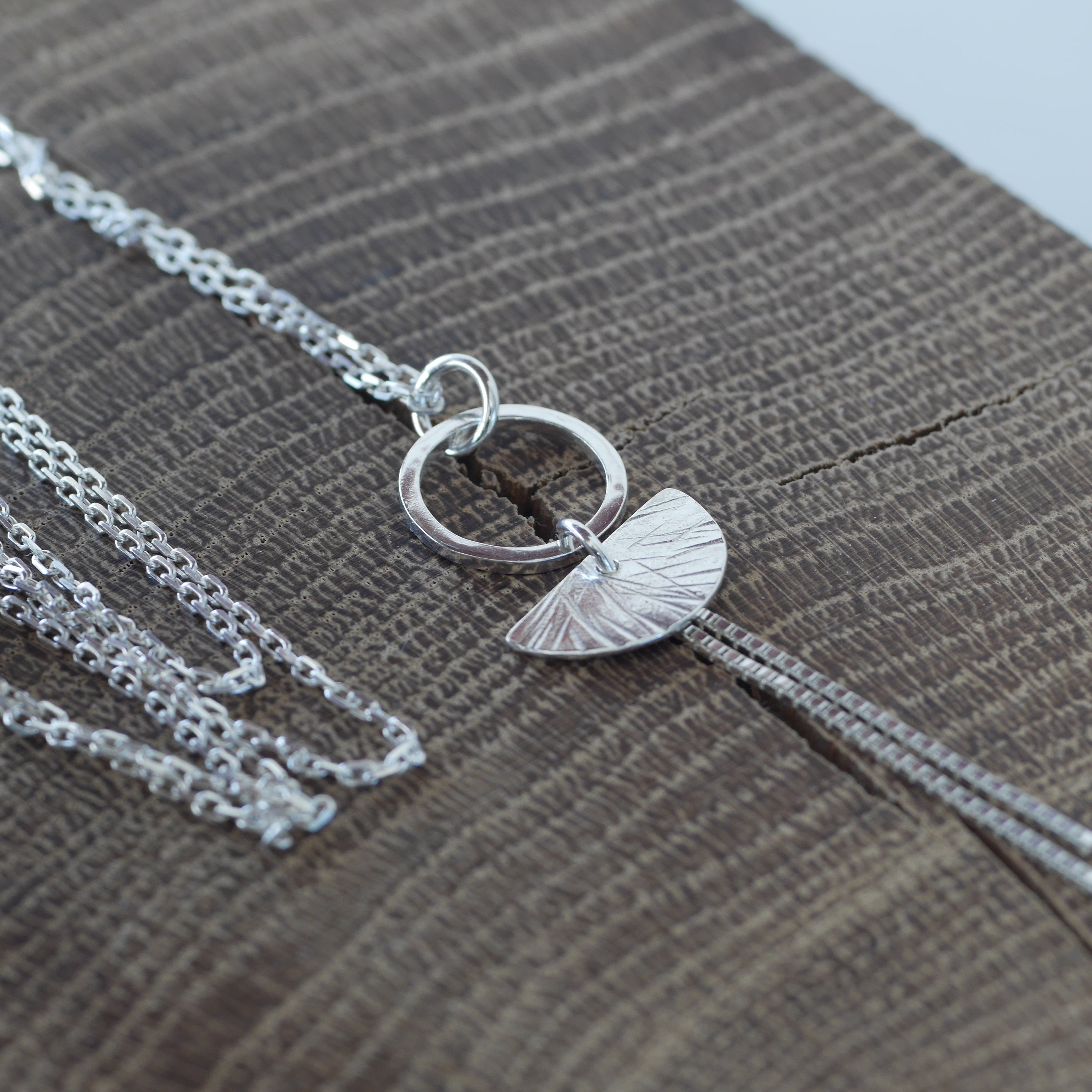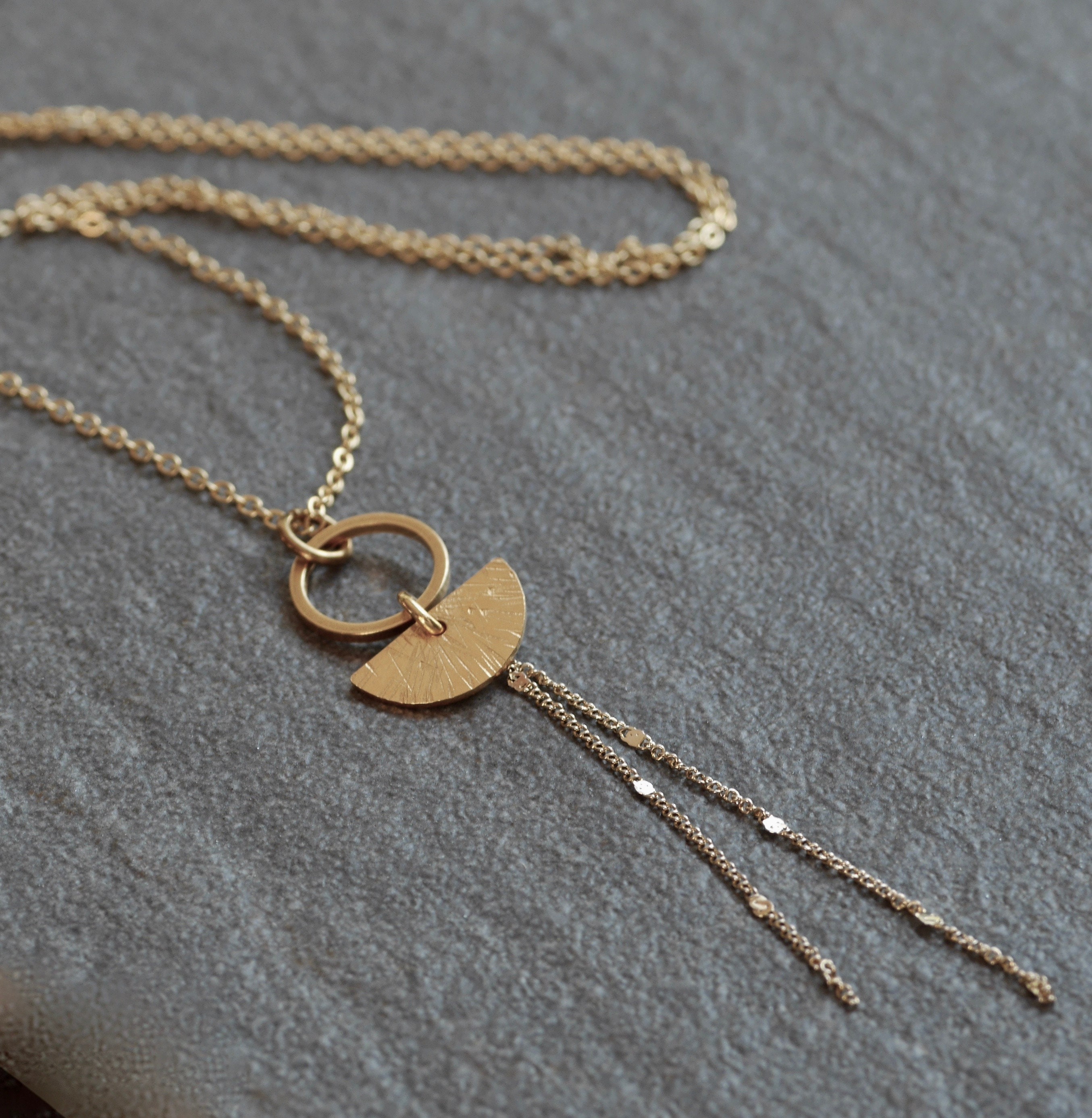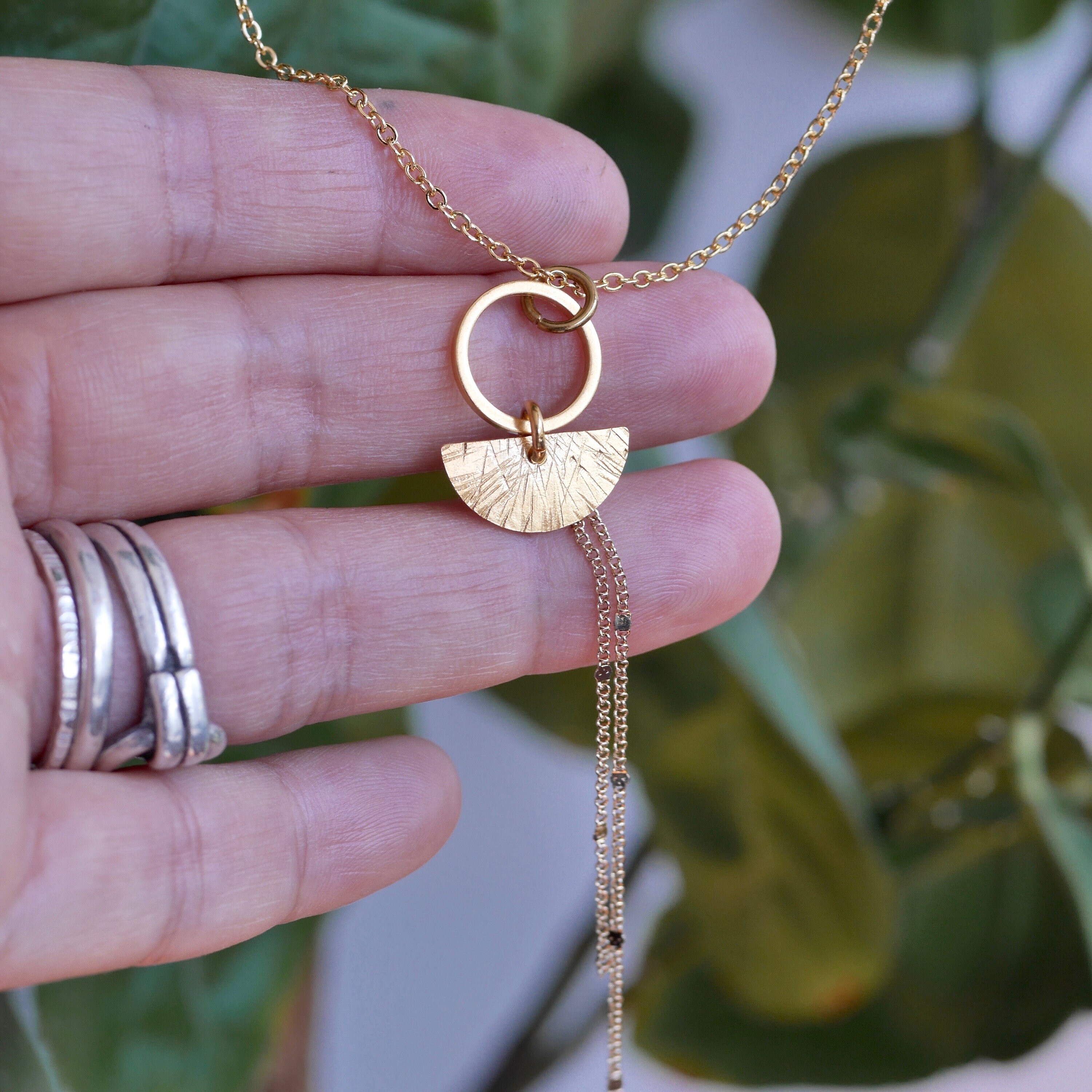 Handmade textured semi-circle and circle geometric necklace available in raw brass, sterling silver or gold-plated finish.