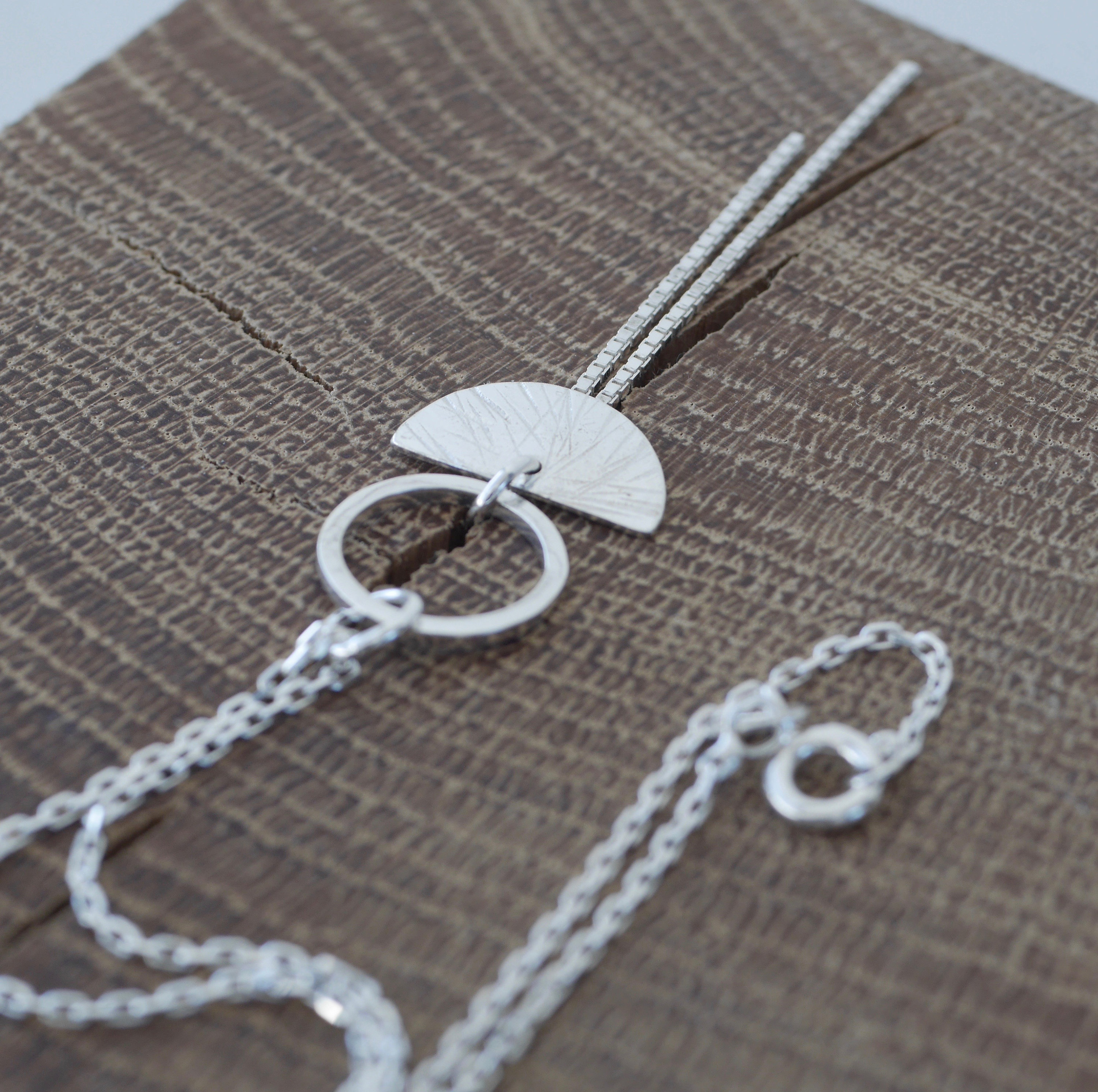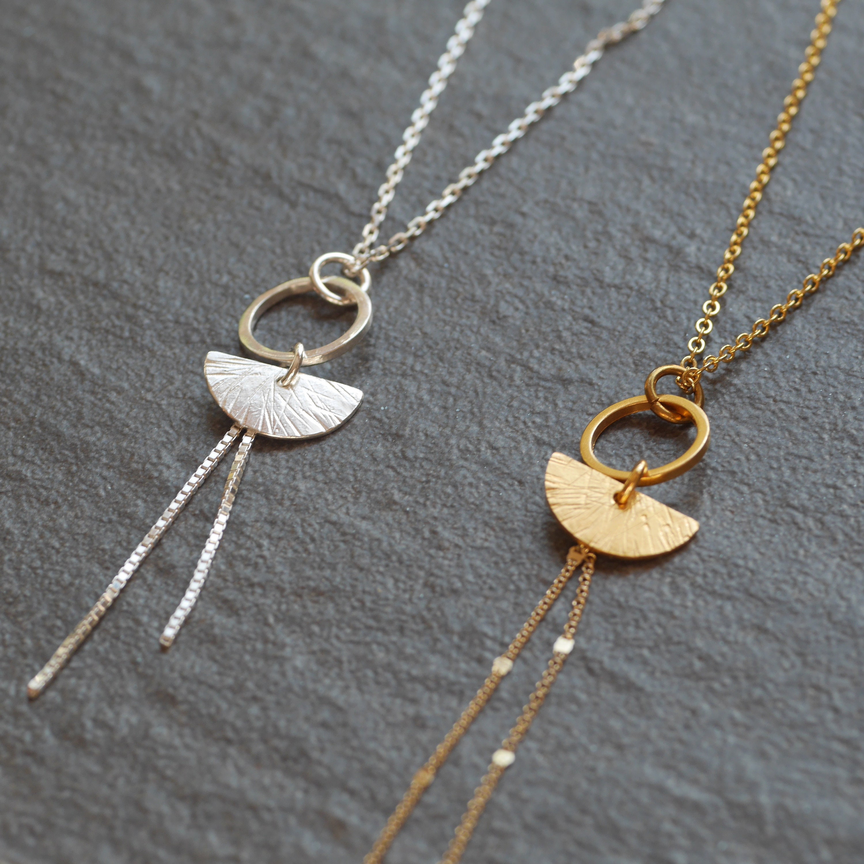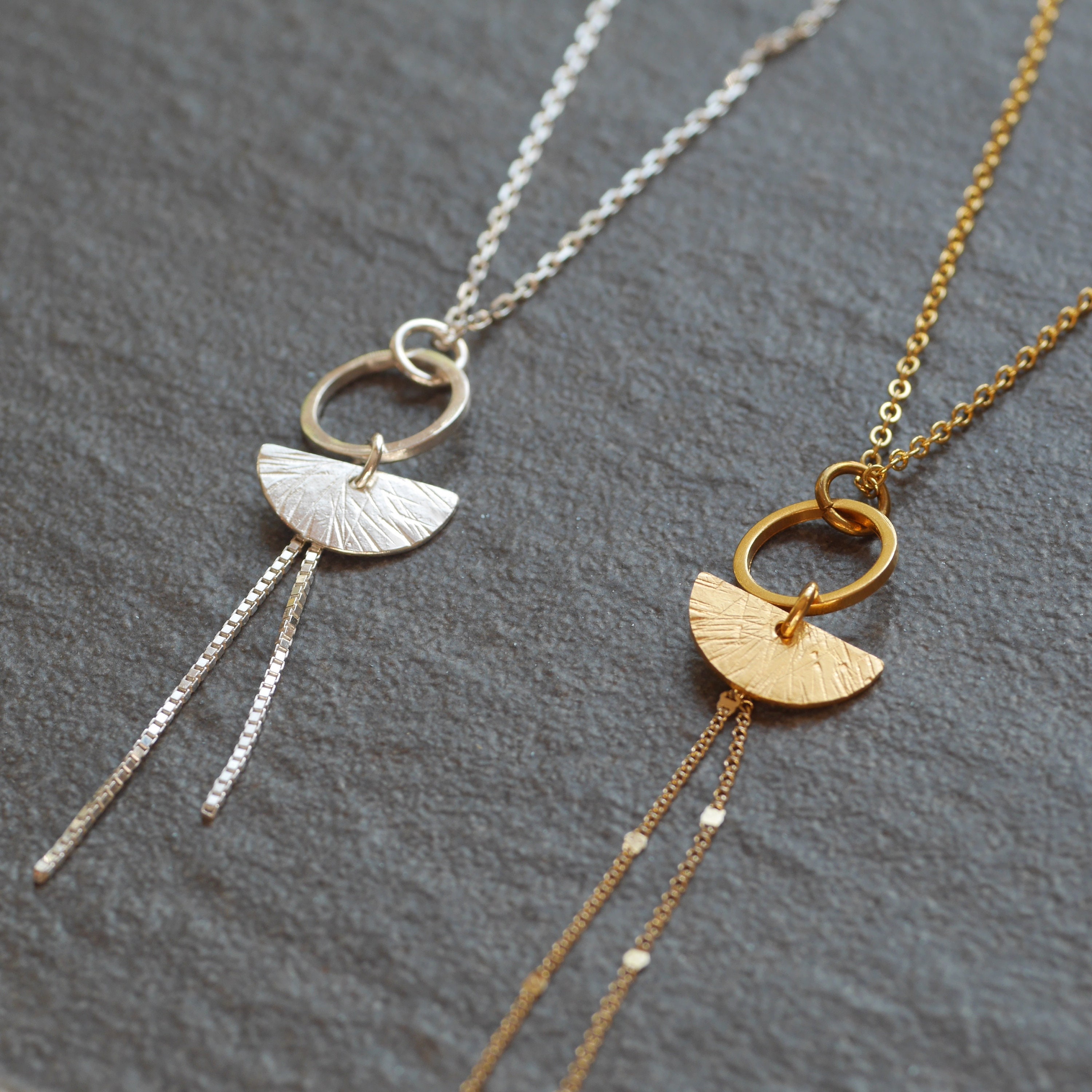 The sterling silver version is completely handmade by me, from cutting the semi-circle and circle charms. The gold-plated version is dipped in high-quality 18-carat gold plating for a long-lasting finish. For a more affordable option, you can choose the brass version with its changing metal colour.