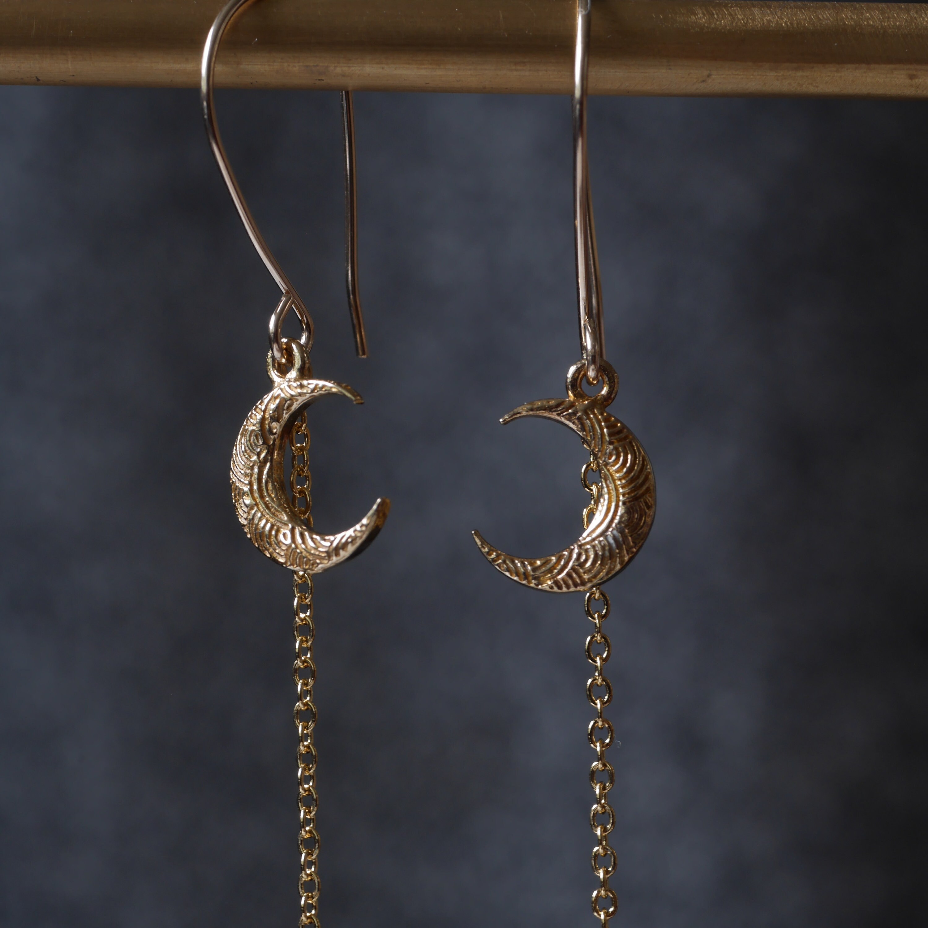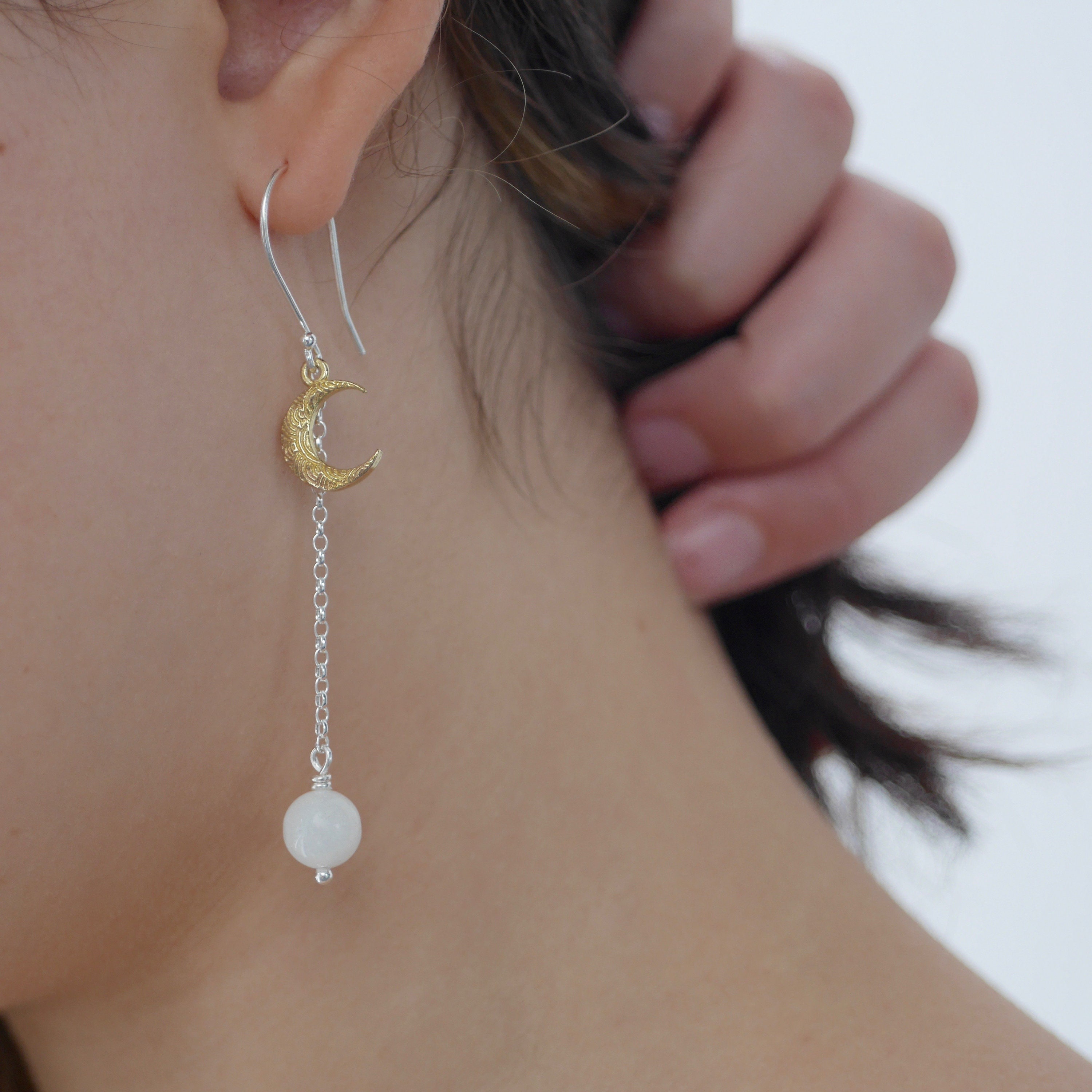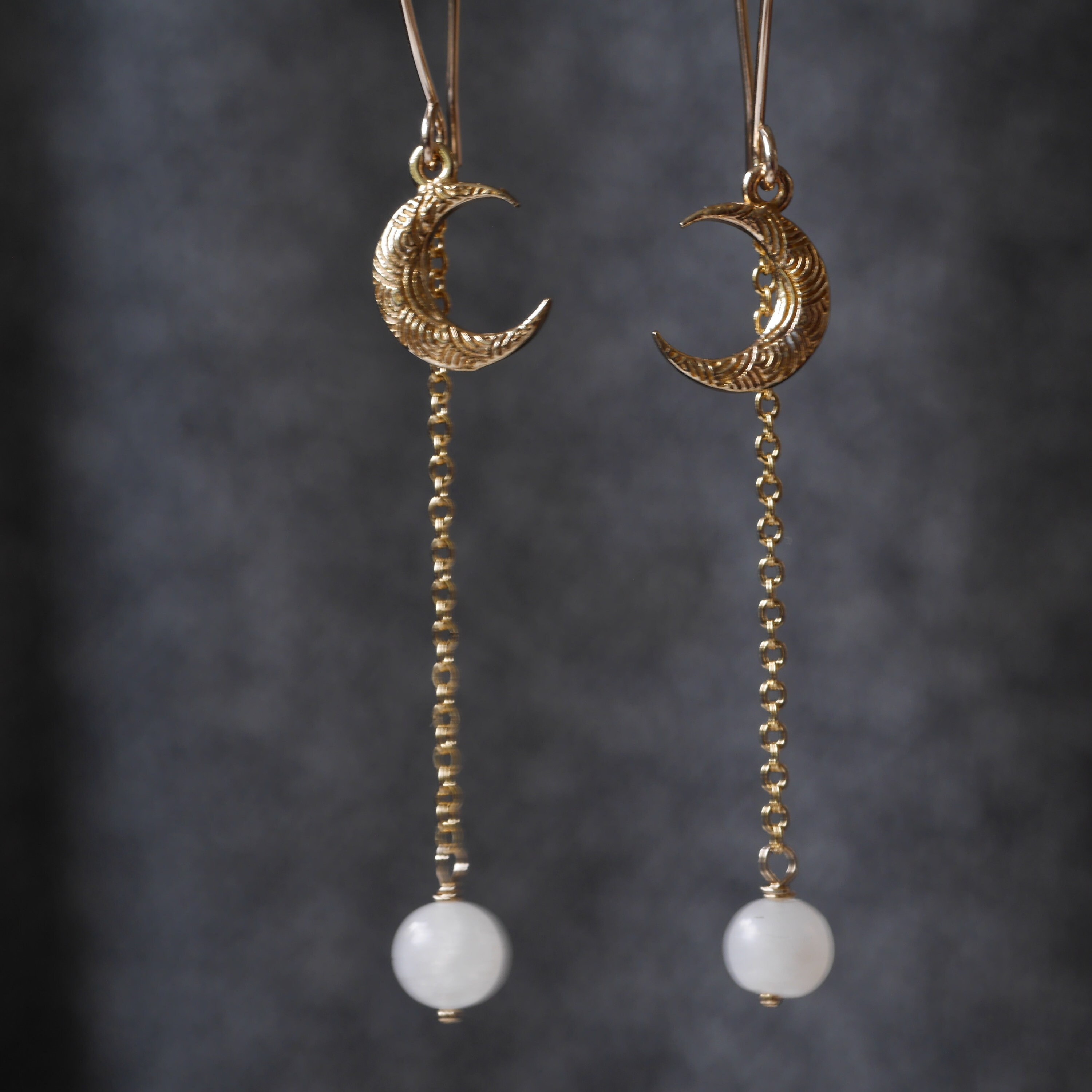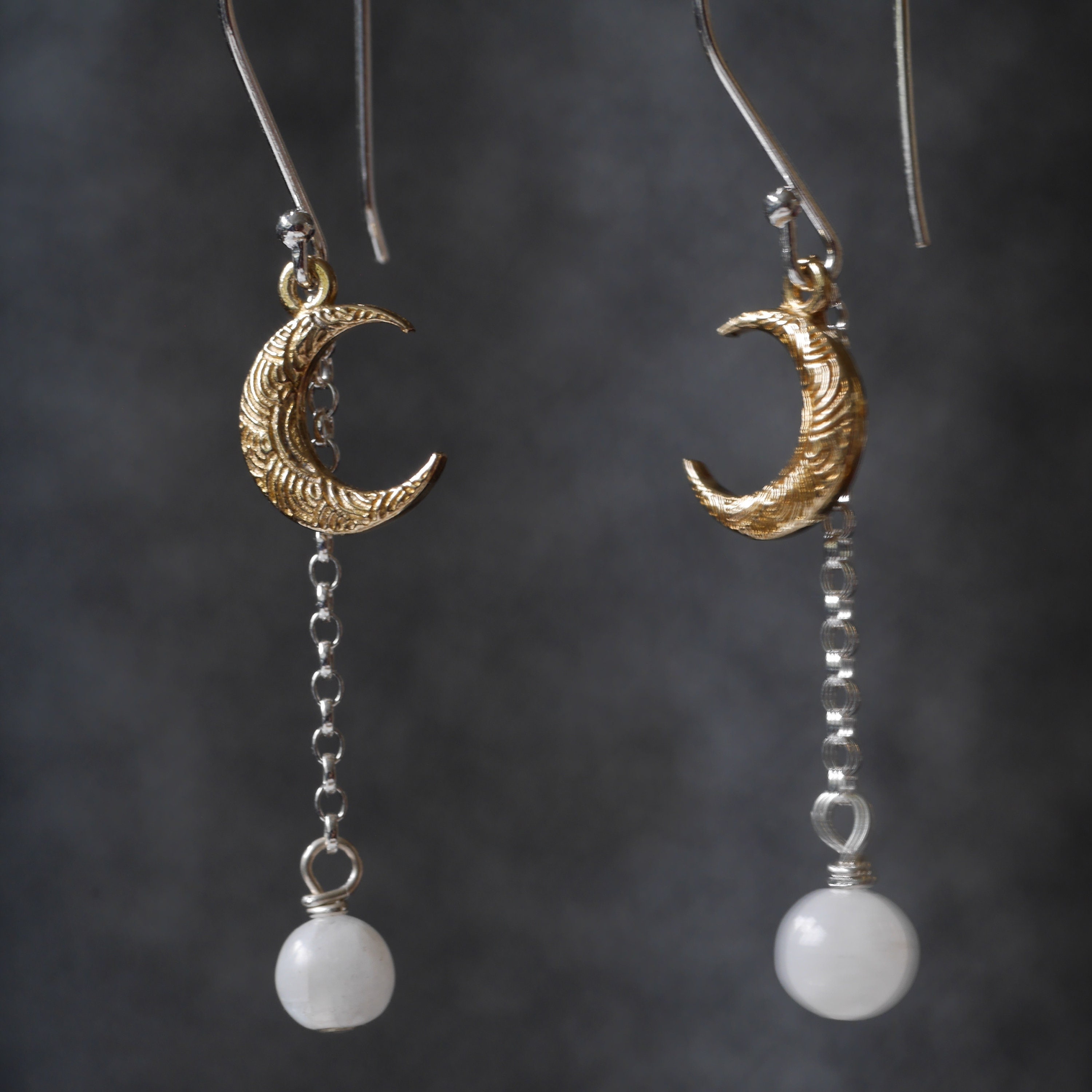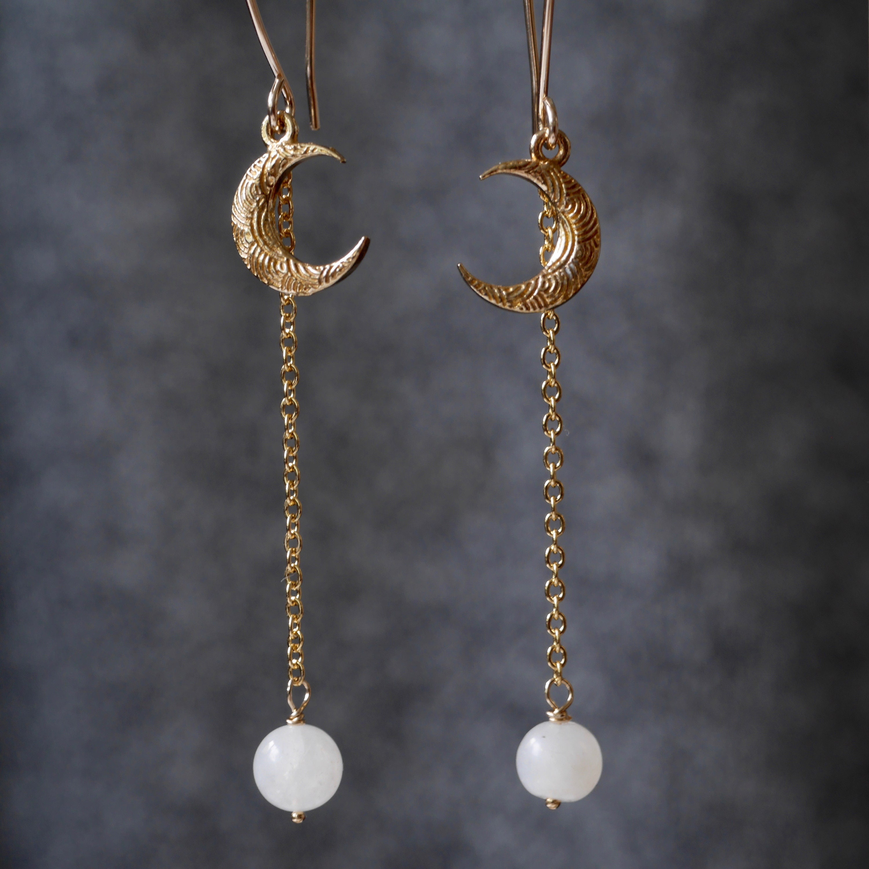 And elegant crescent moon and Rainbow Moonstone Drop Earrings in gold and sterling silver.