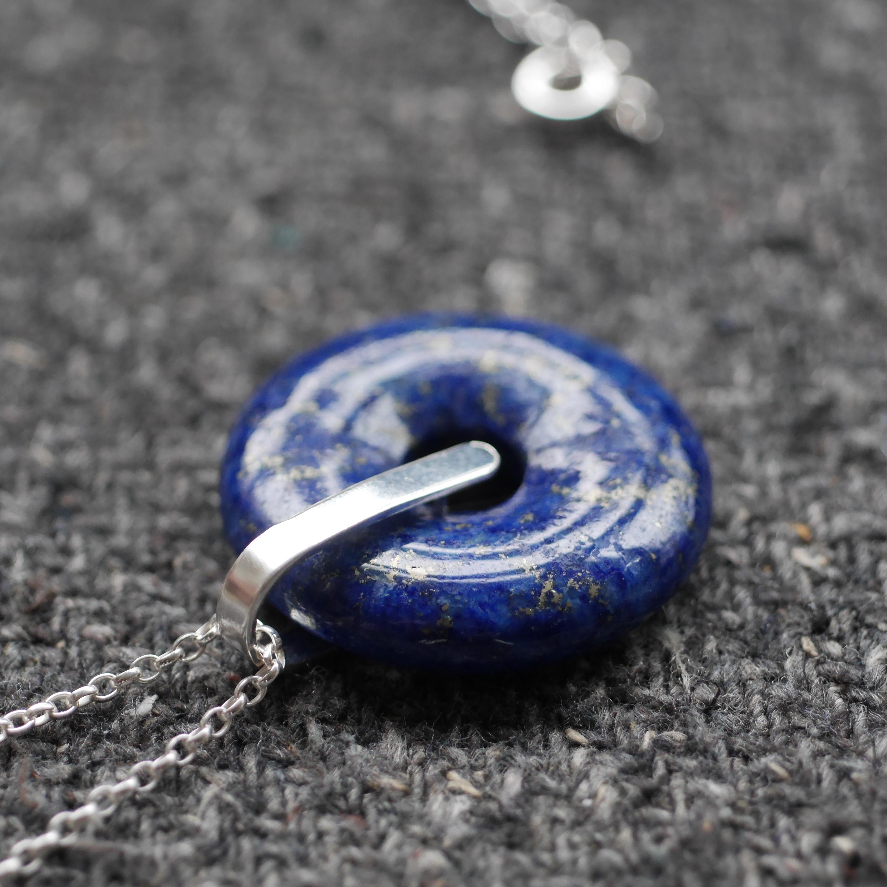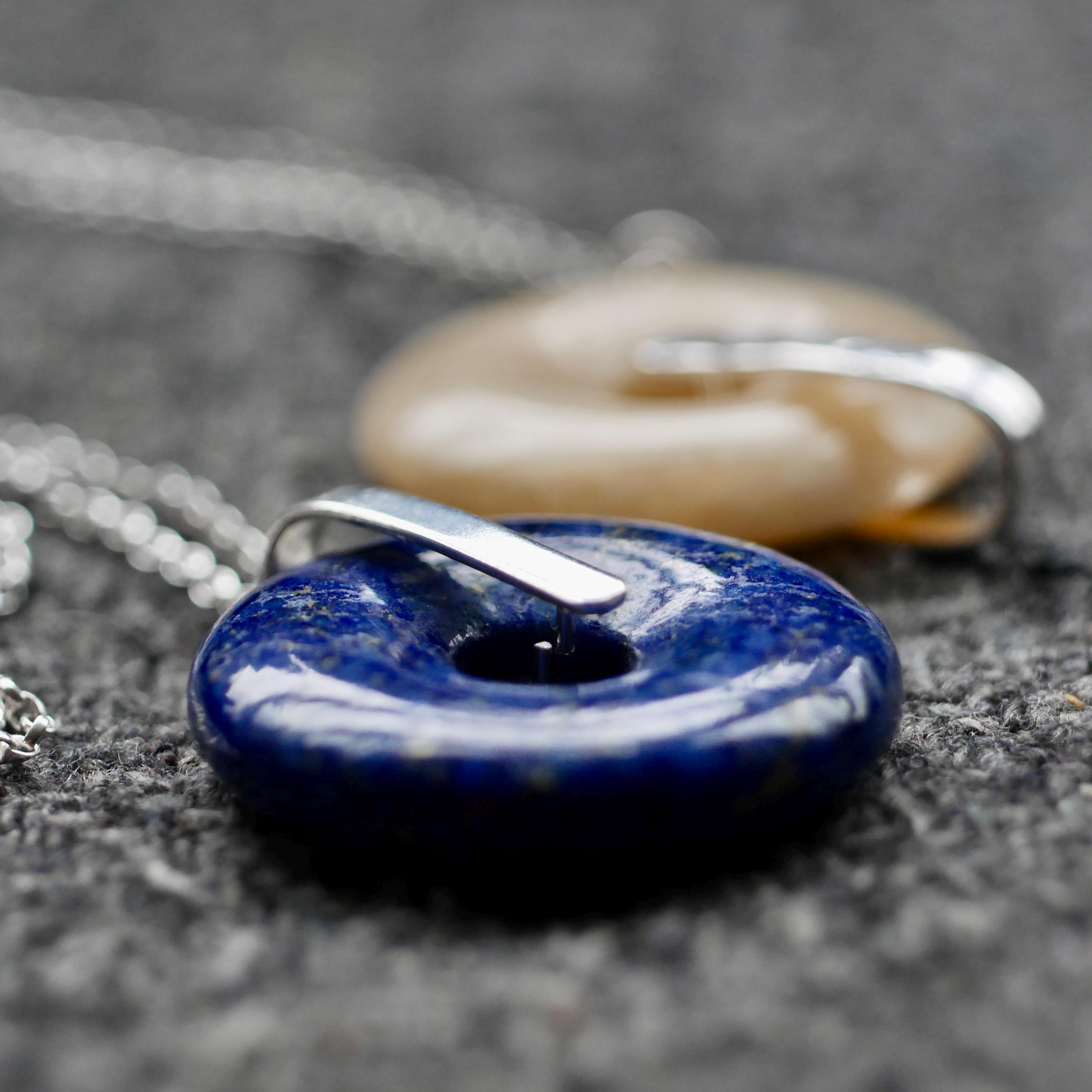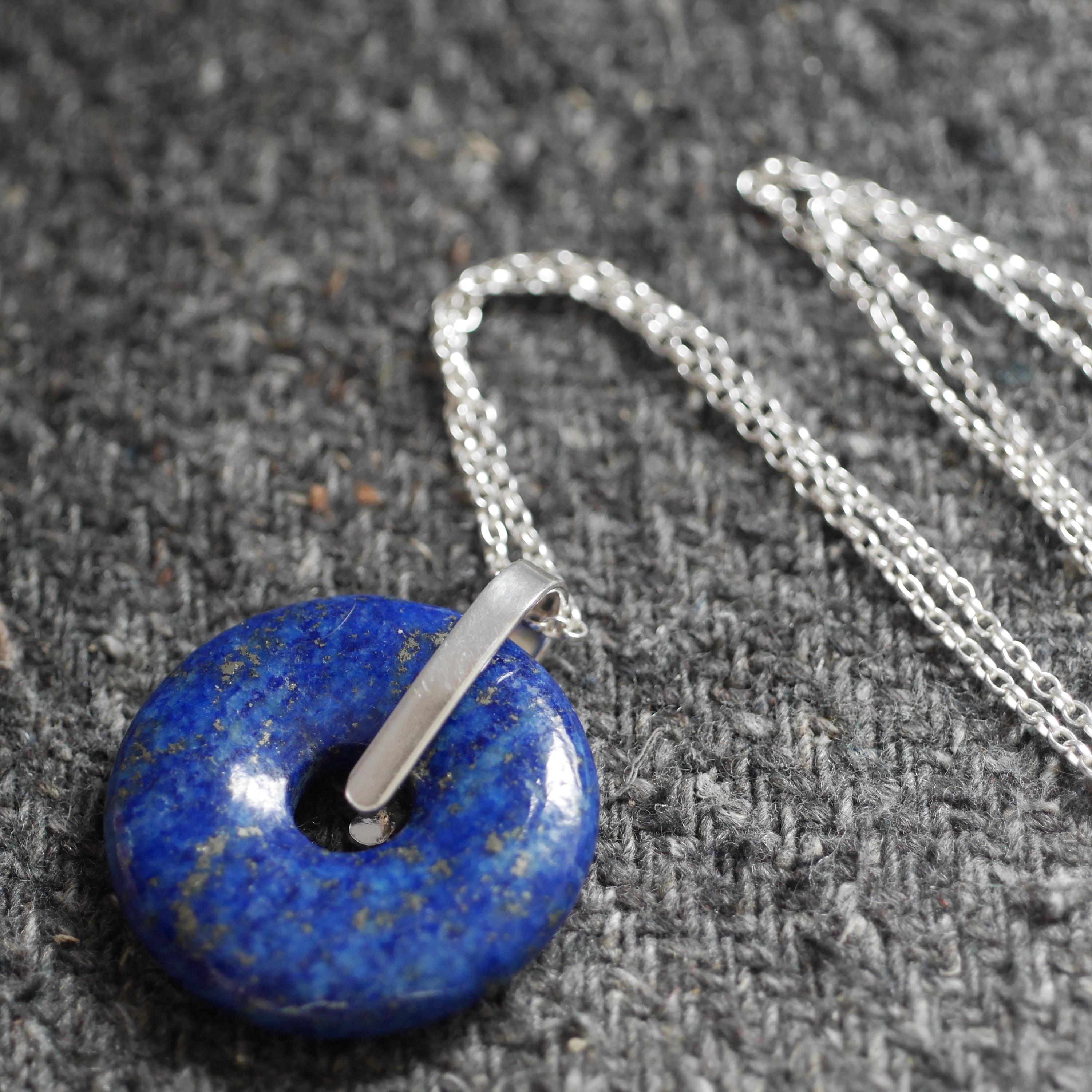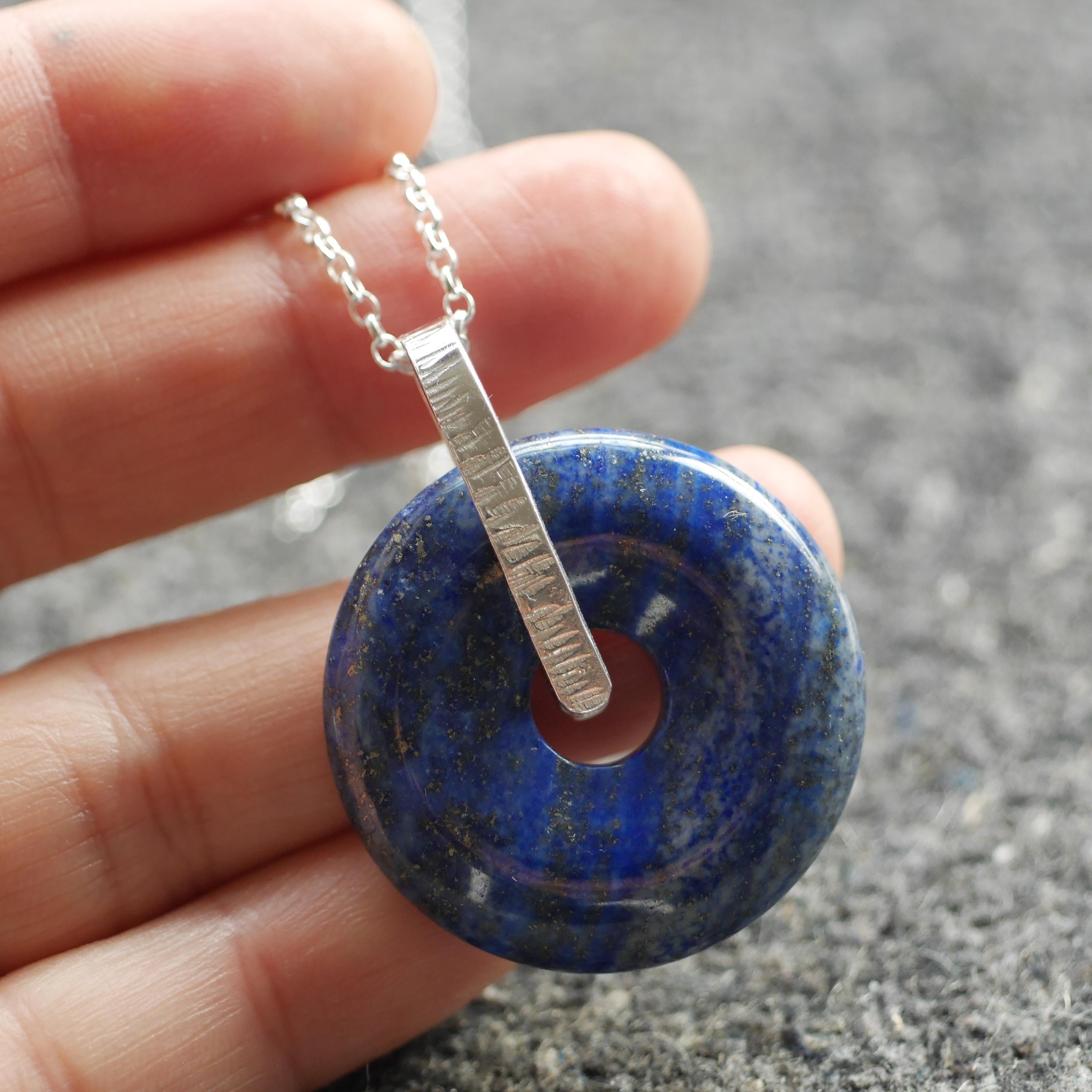 This beautiful necklace features a large, doughnut-shaped Lapis Lazuli gemstone set with a handmade sterling silver pendant bail. The 3 cm gemstone spins freely, making it not just elegant but also a calming fidget piece—perfect for relieving stress and anxiety throughout the day.
