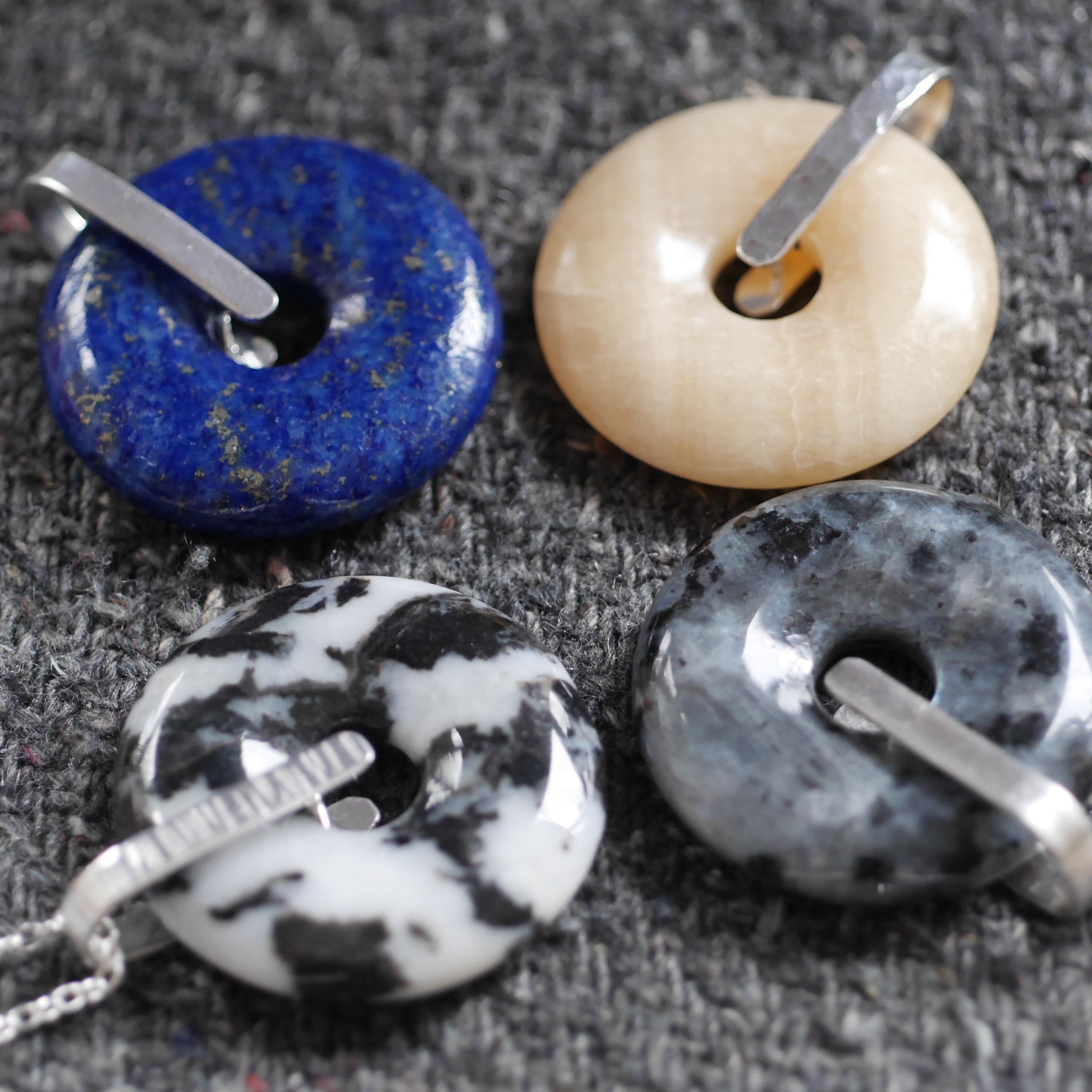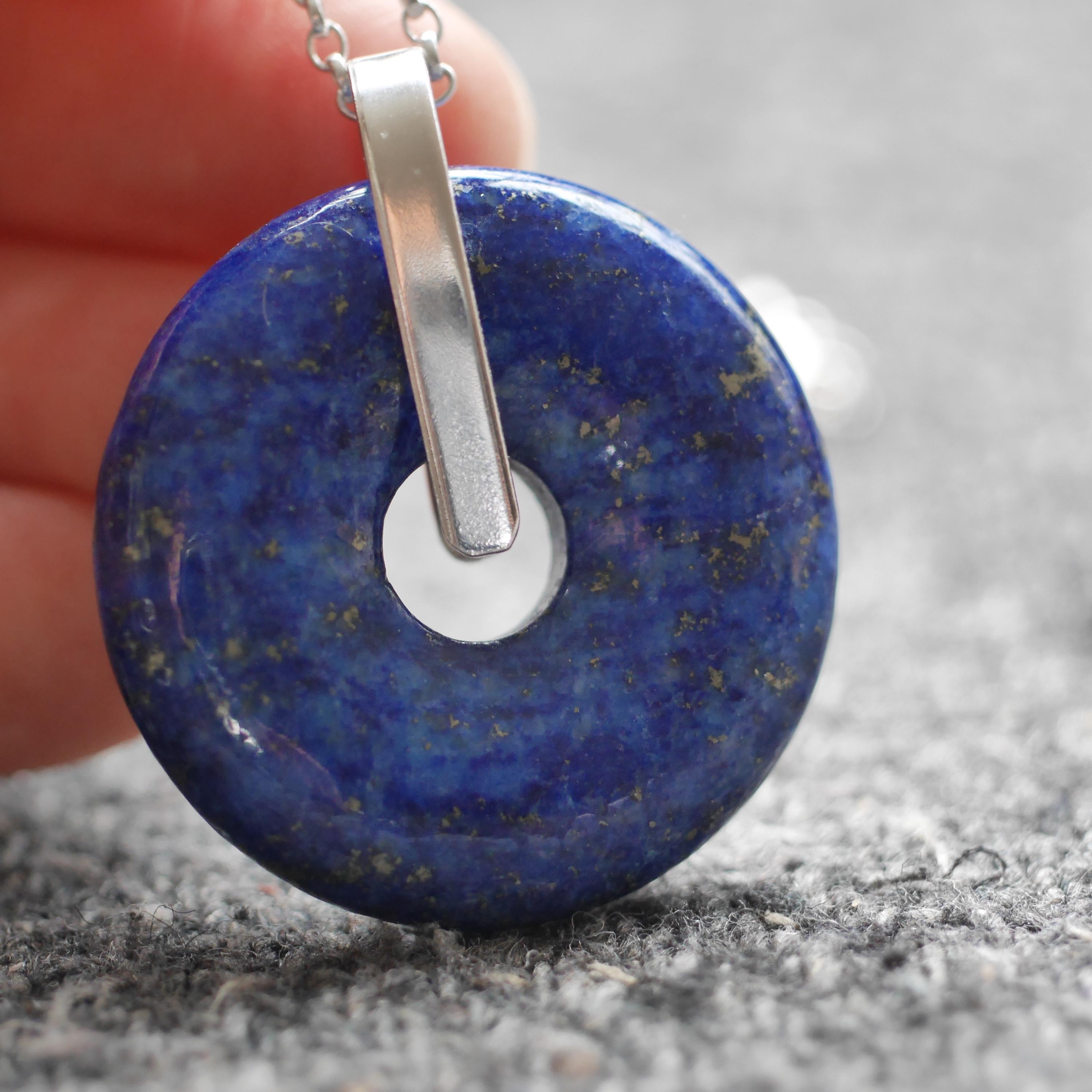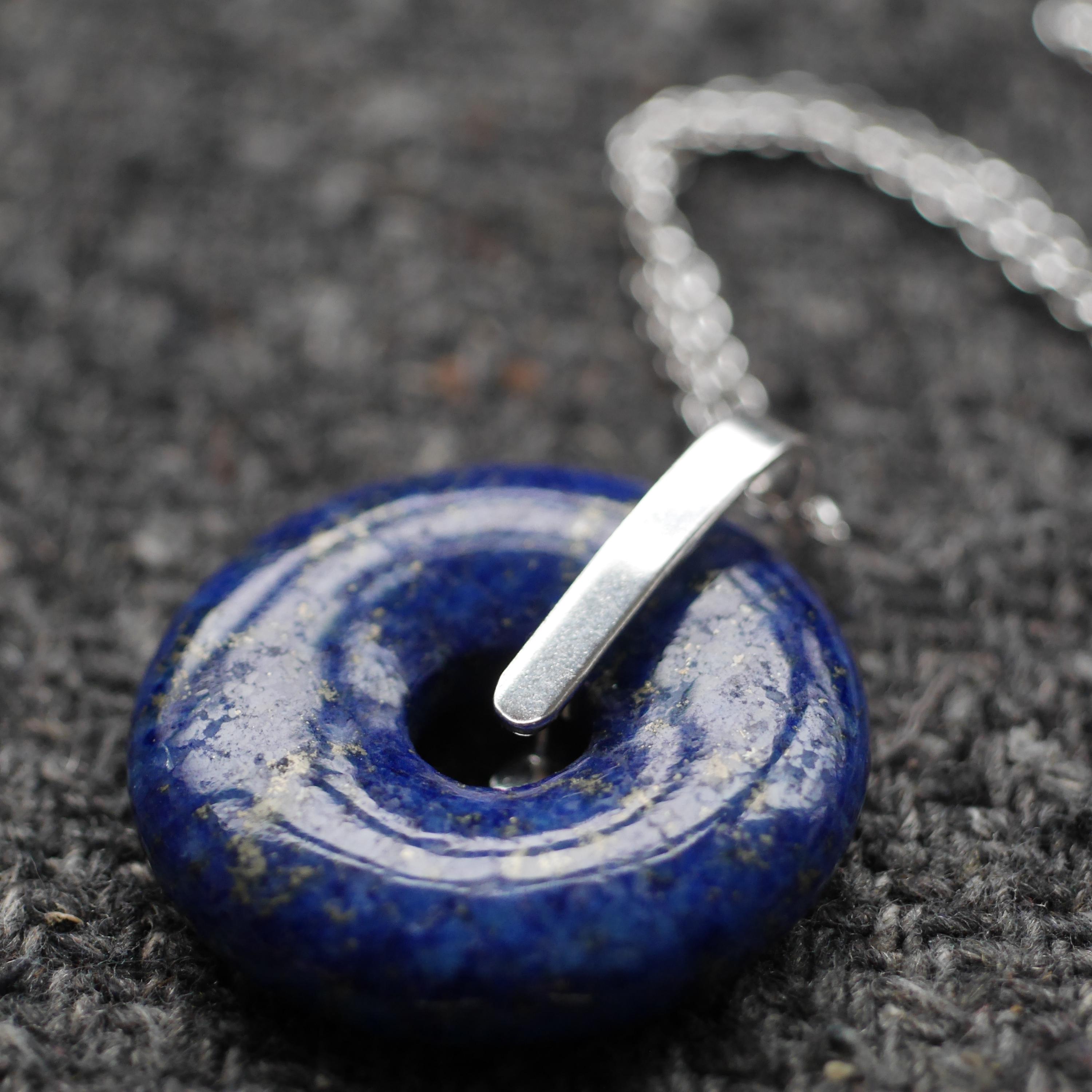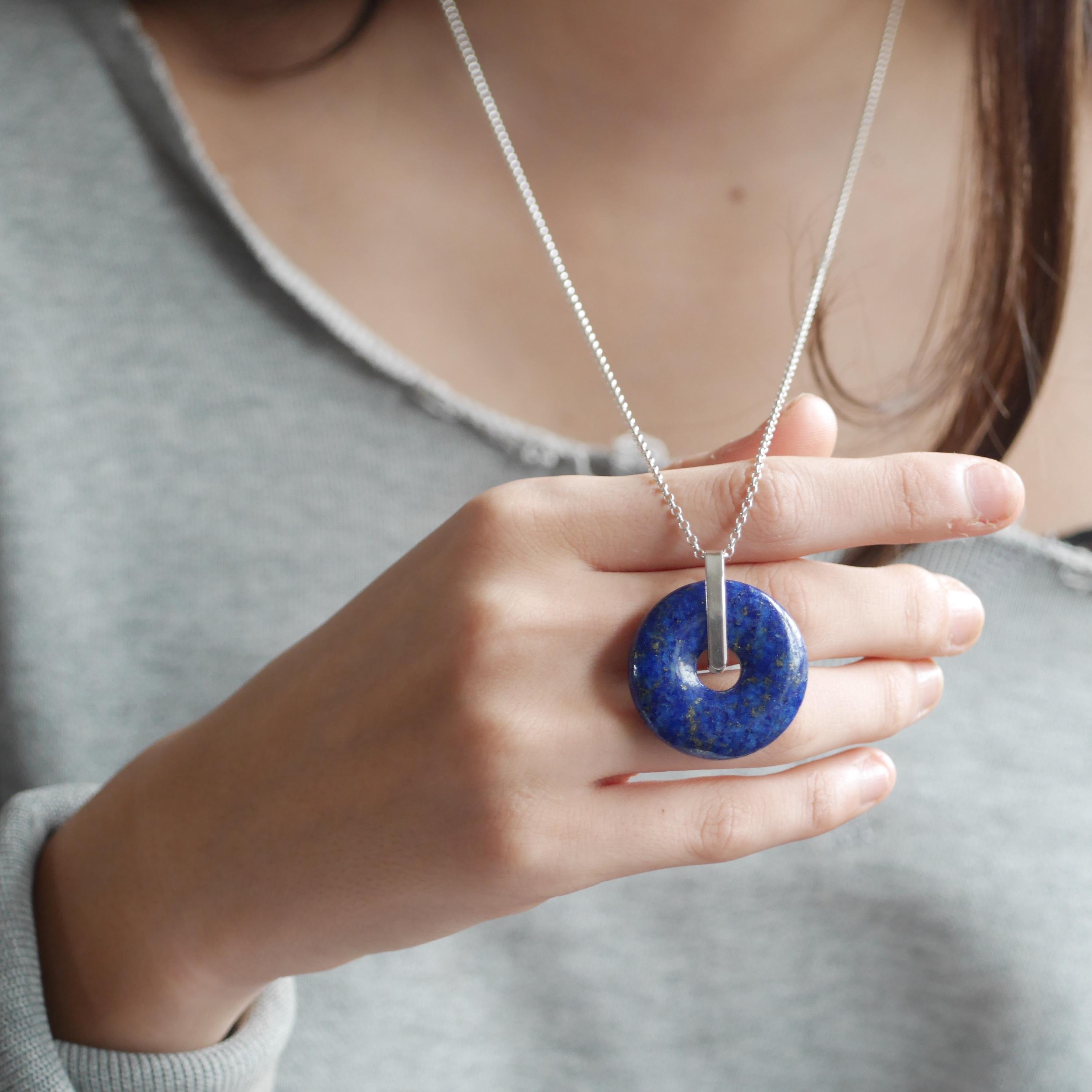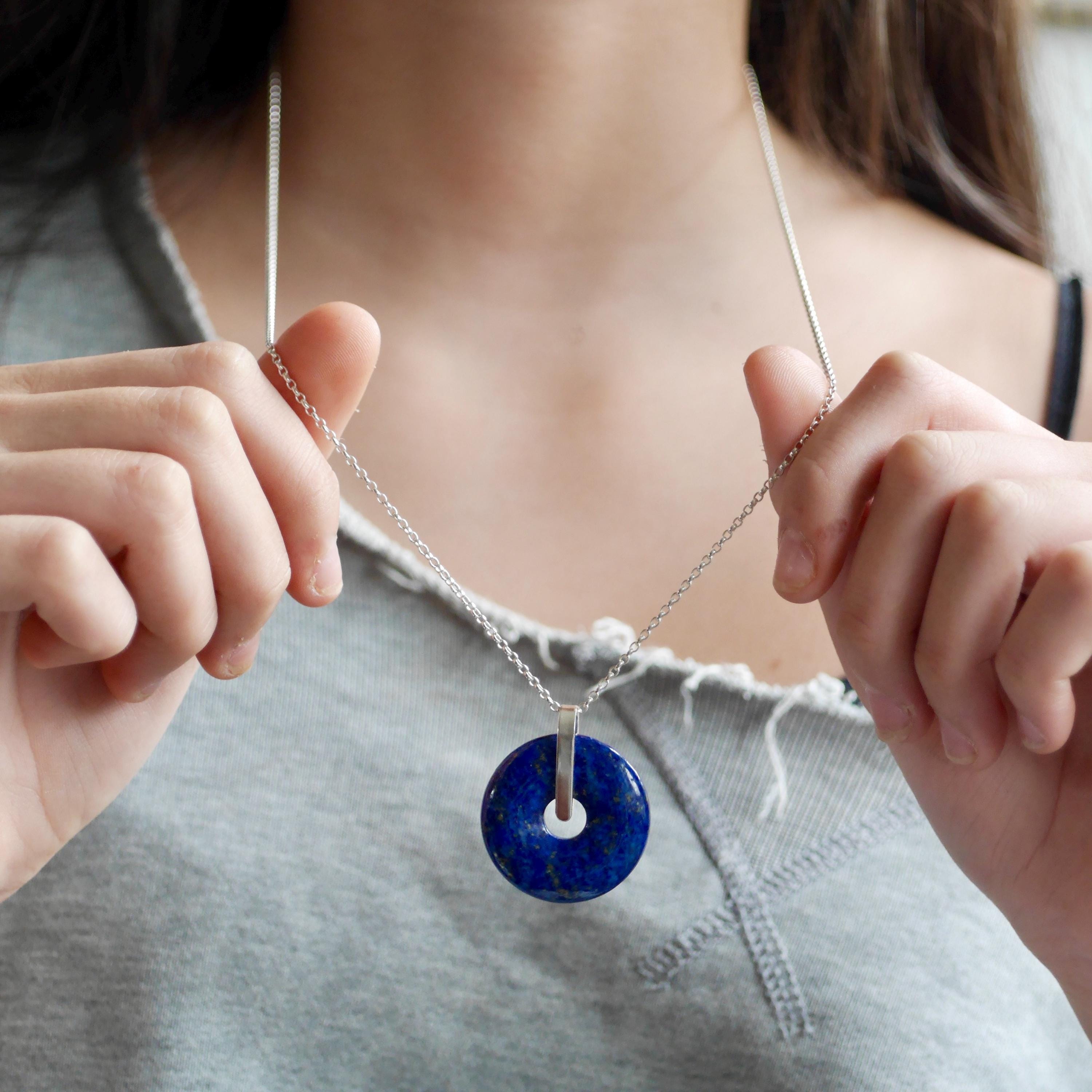 This beautiful necklace features a large, doughnut-shaped Lapis Lazuli gemstone set with a handmade sterling silver pendant bail. The 3 cm gemstone spins freely, making it not just elegant but also a calming fidget piece—perfect for relieving stress and anxiety throughout the day.