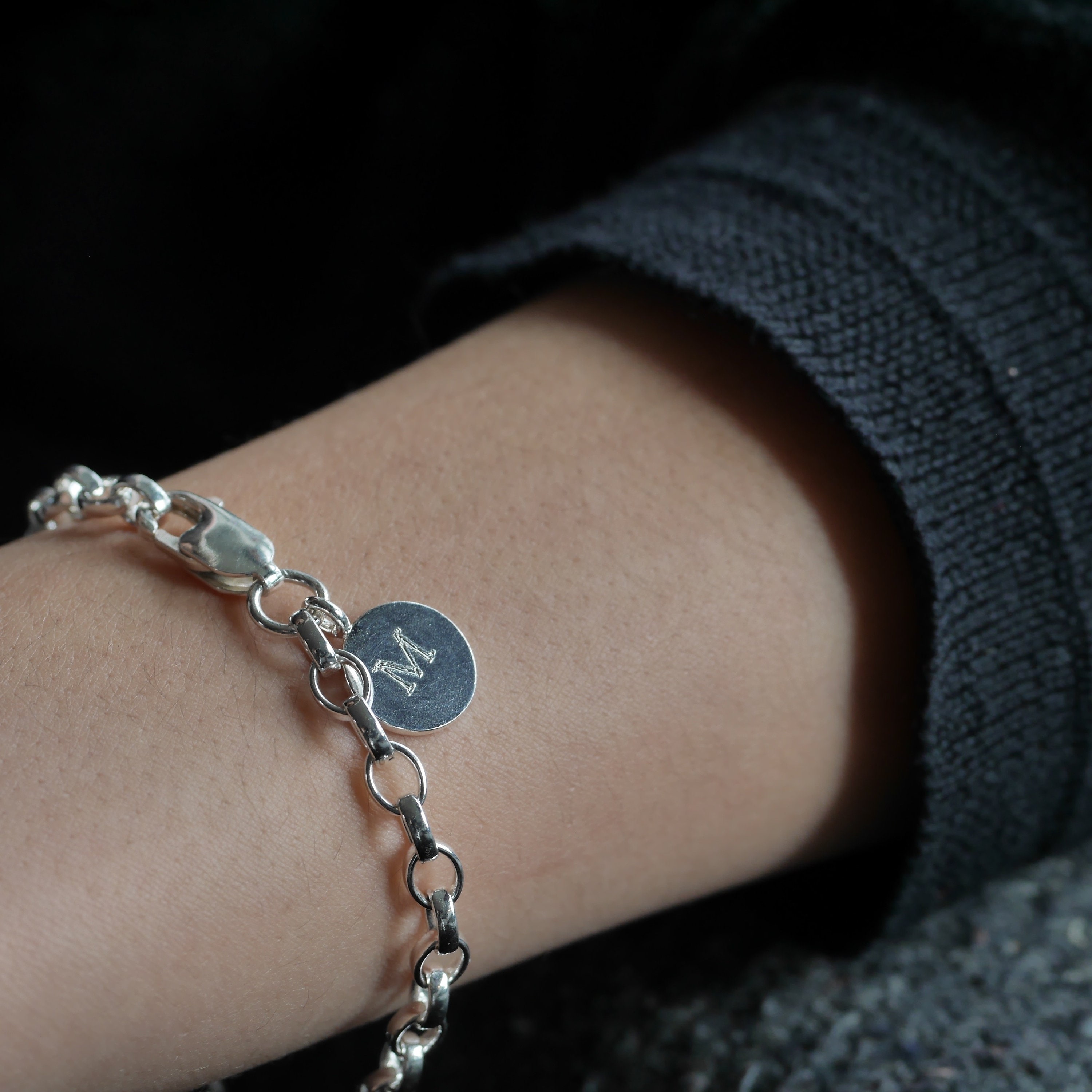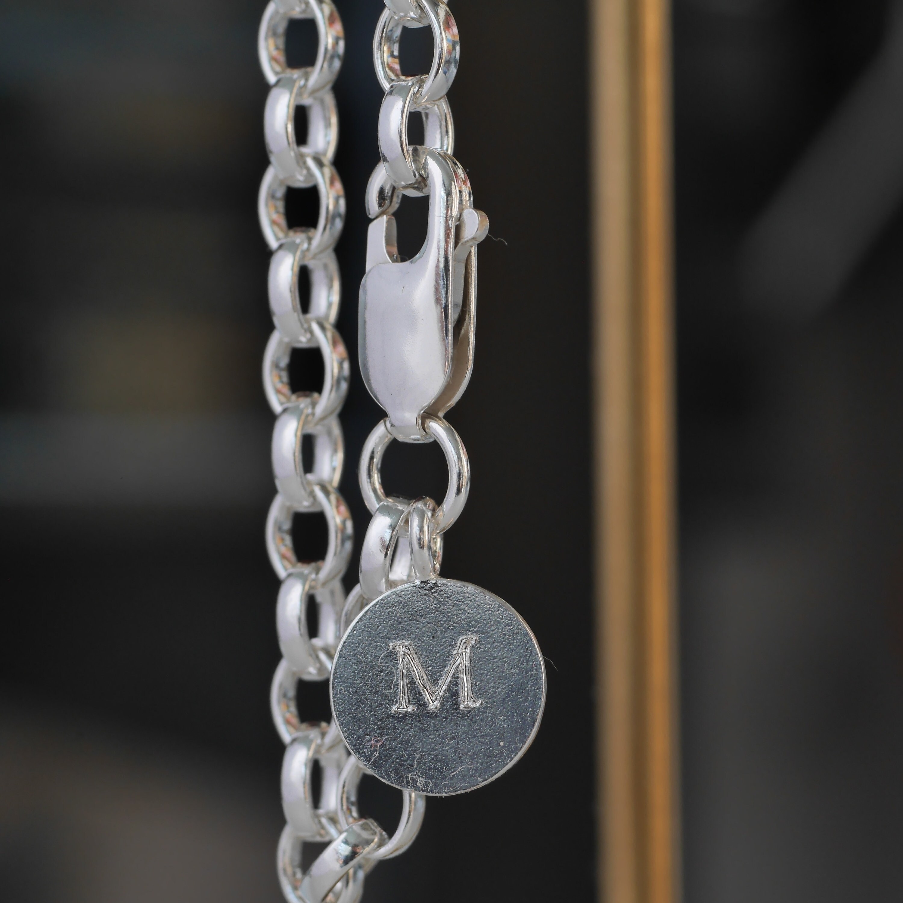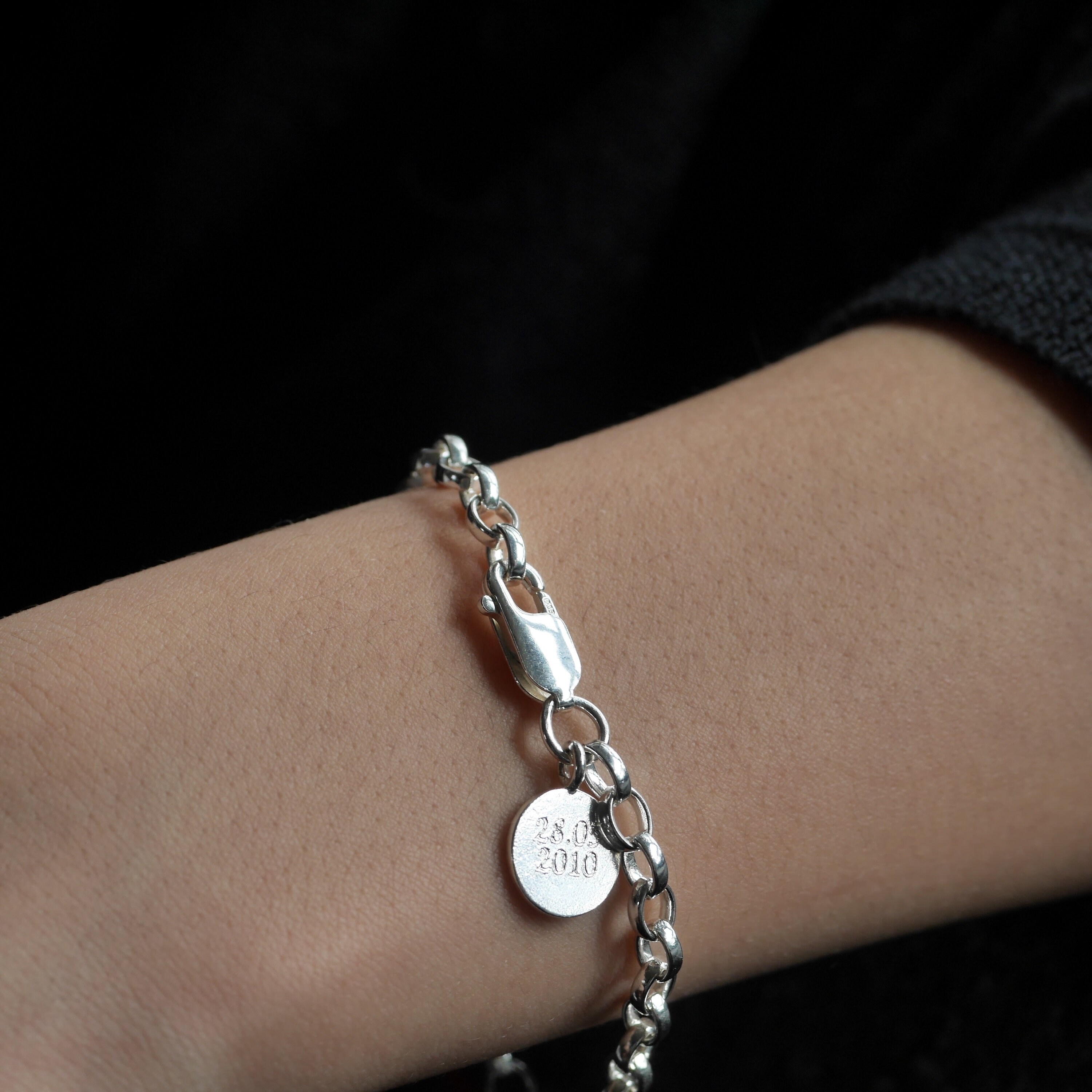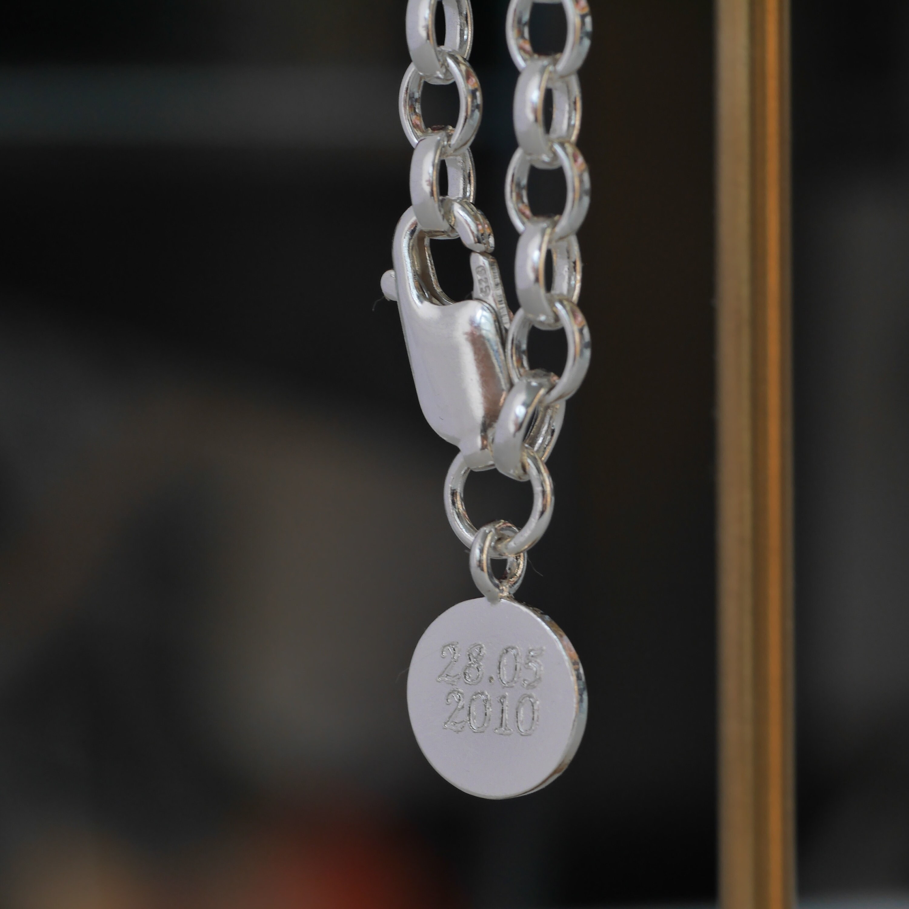 This custom engraved tag and silver chain bracelet is made with a 10mm round 1.2 thickness tag and a 3.0mm Loose Oval Belcher Chain so-called 4 bel chain. It's a gender-free gift that can be given to anyone who enjoys a slightly chunky sterling silver chain bracelet with your little custom twist.