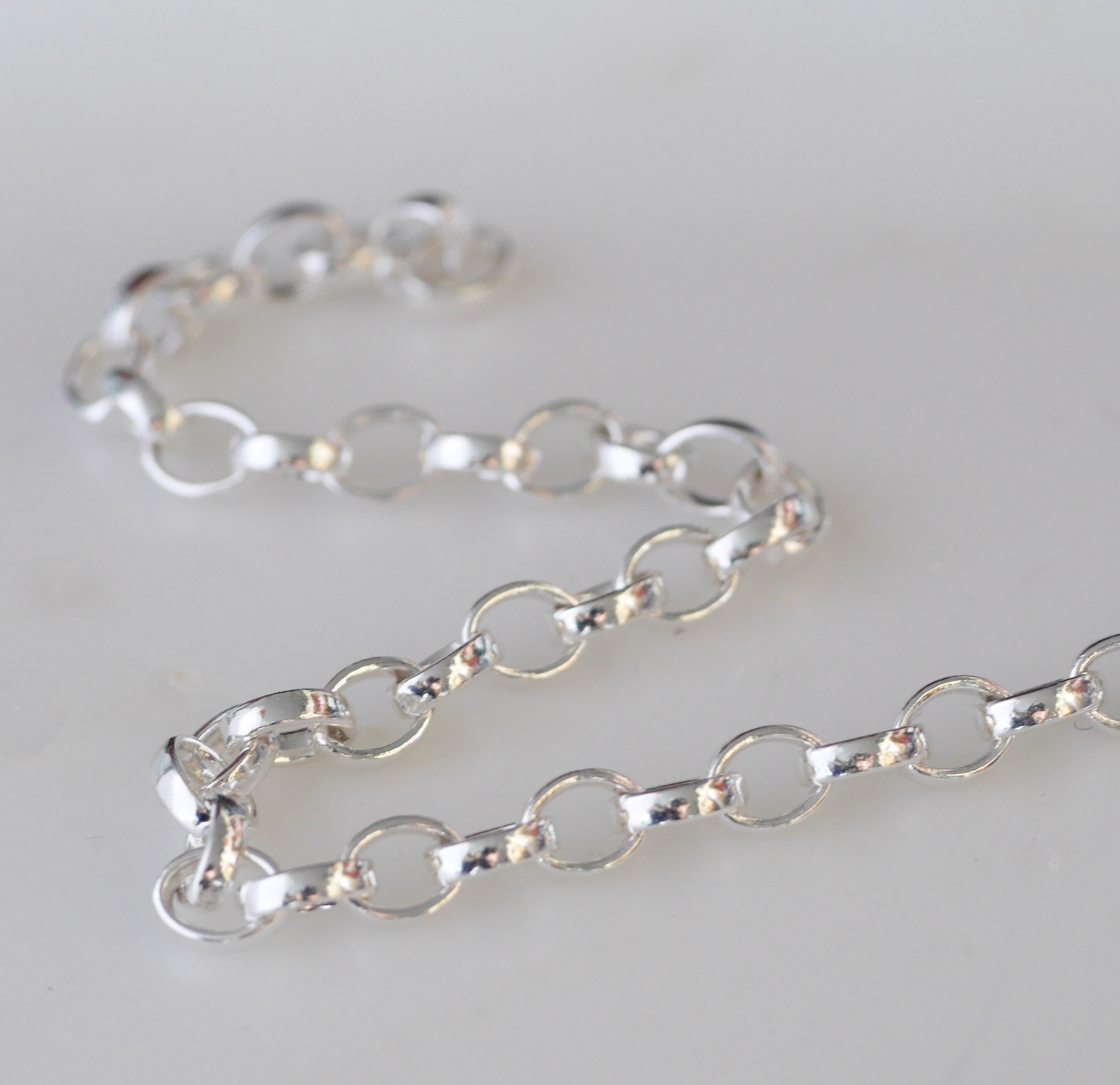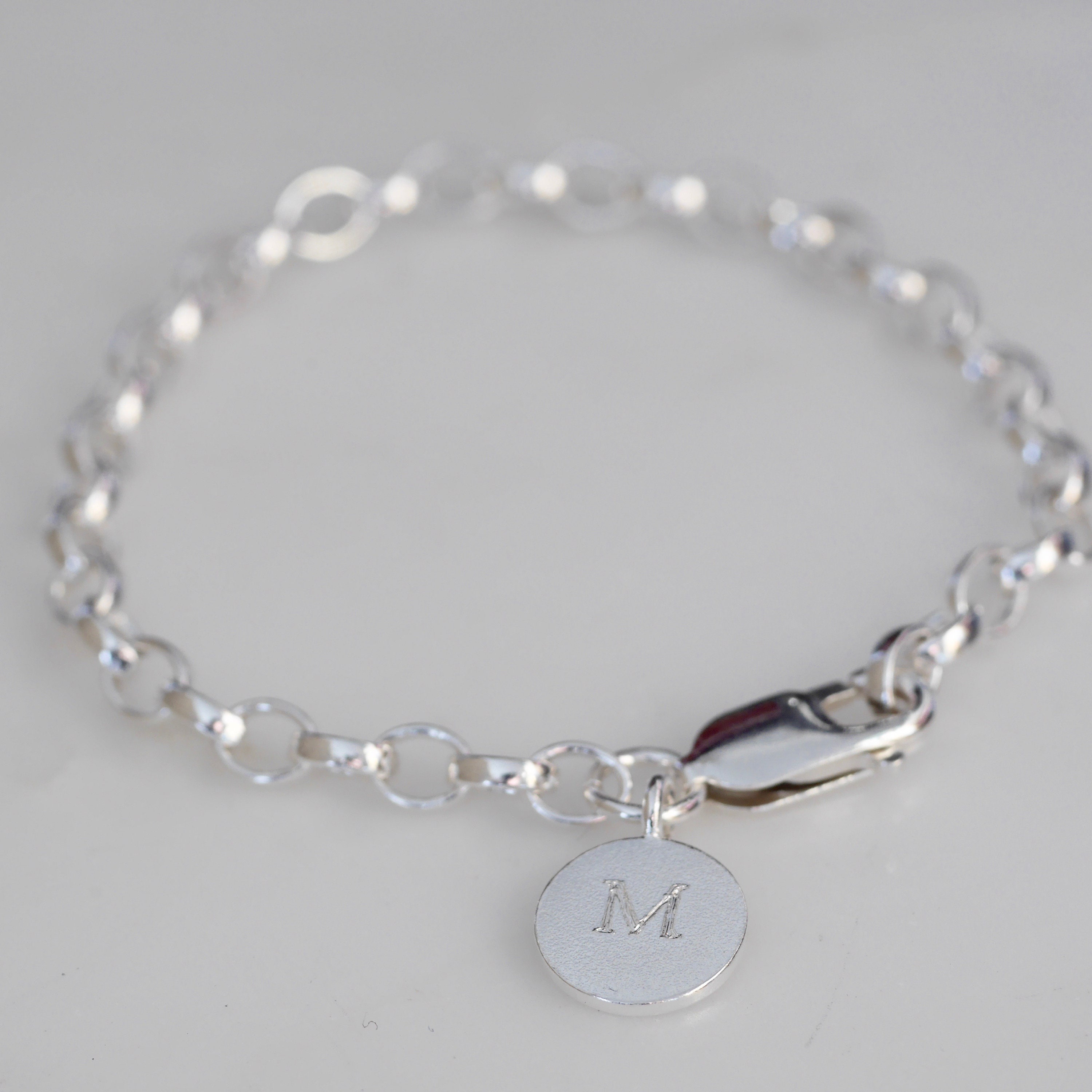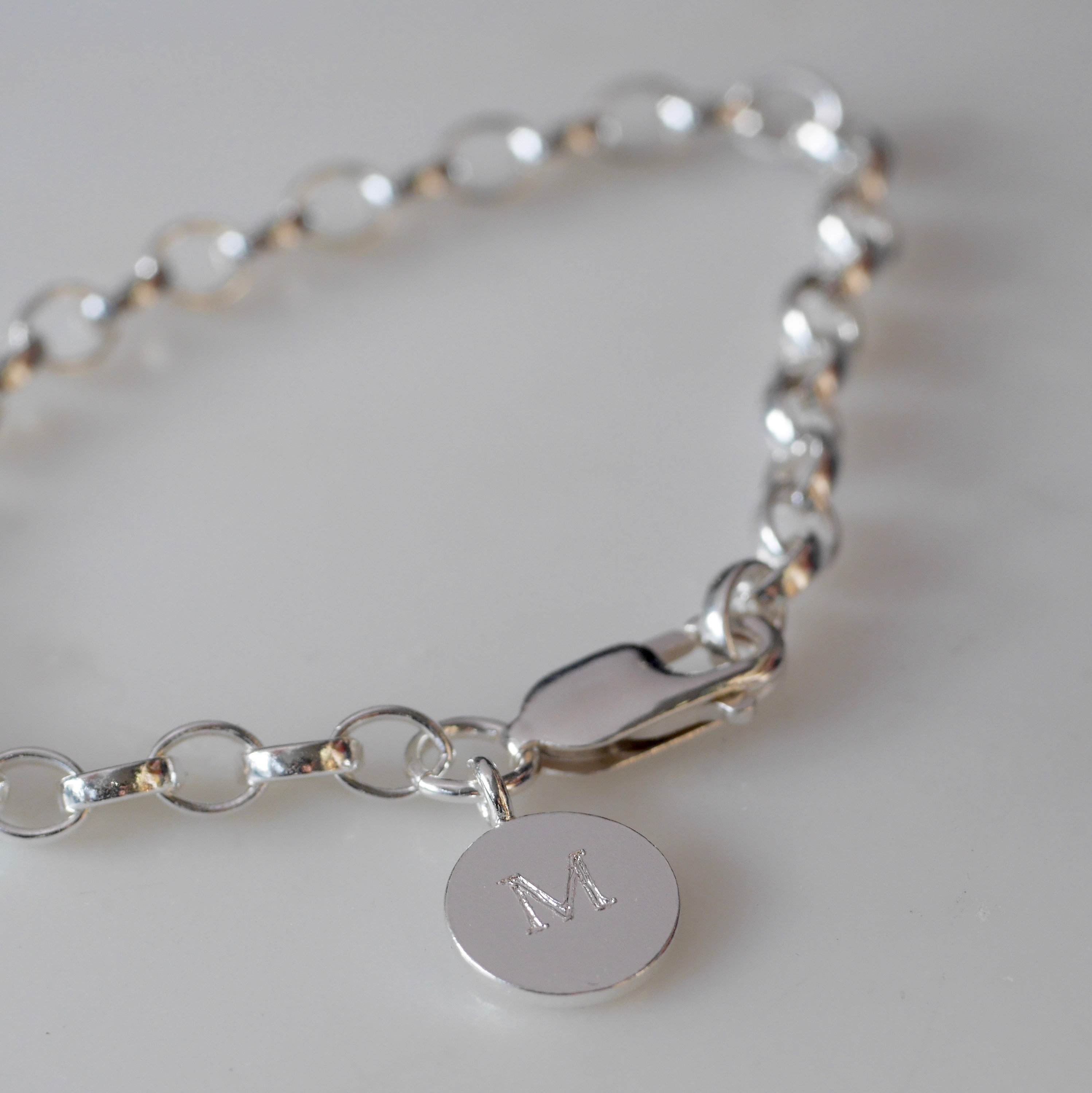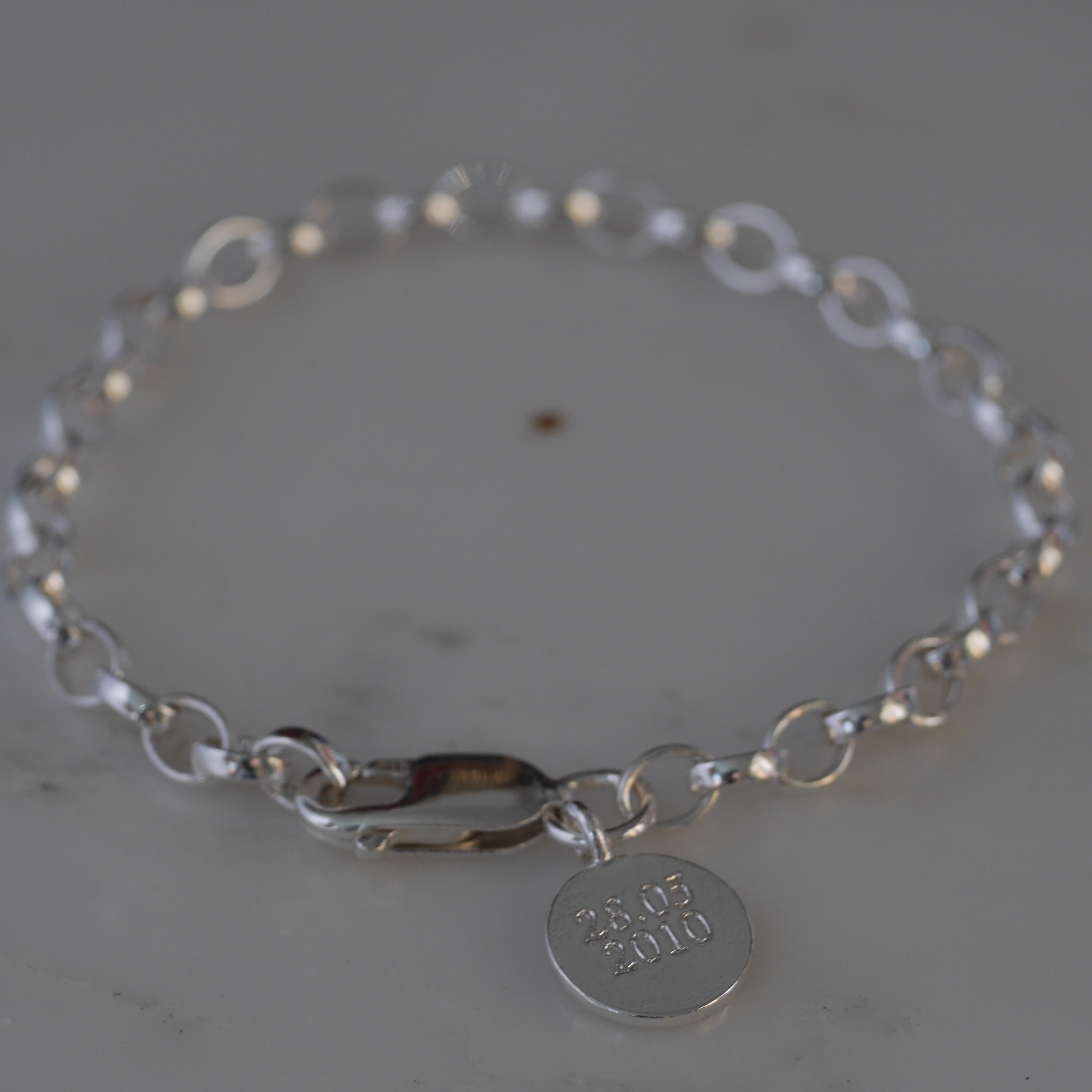 This custom engraved tag and silver chain bracelet is made with a 10mm round 1.2 thickness tag and a 3.0mm Loose Oval Belcher Chain so-called 4 bel chain. It's a gender-free gift that can be given to anyone who enjoys a slightly chunky sterling silver chain bracelet with your little custom twist.