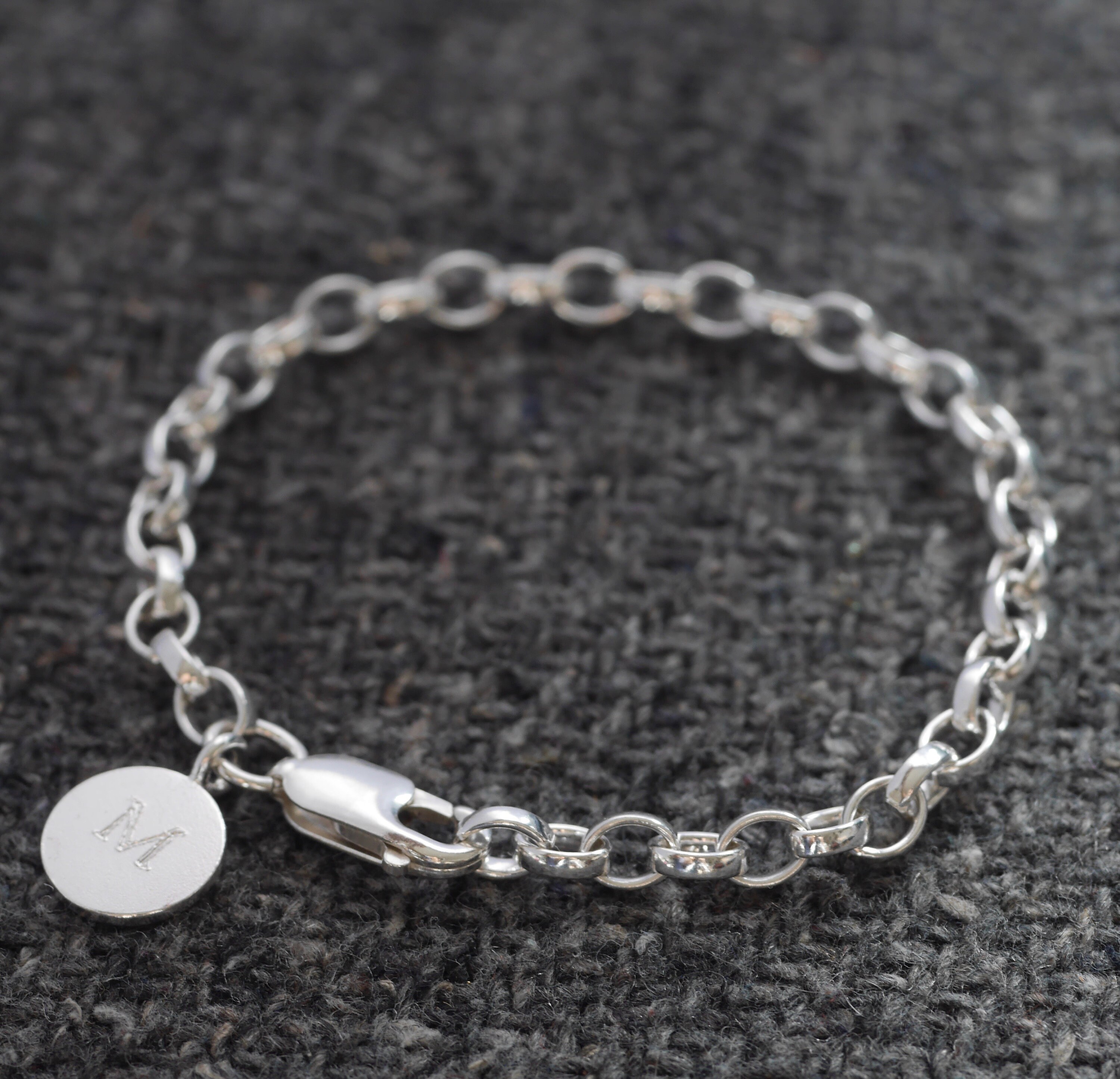 Unisex sterling silver linked chain and personalised round silver tag bracelet for both.